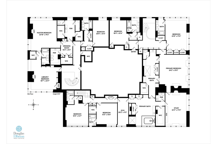 The upper level serves as a tranquil retreat. The primary suite encompasses a grand corner bedroom with a wood-burning fireplace, dual marble baths, three dressing rooms, a private gym, and an adjoining study. Multiple additional bedrooms-each with ensuite baths, abundant closets, and spectacular park or skyline views-offer luxurious comfort for family and guests. In total, the combined residence provides seven to eight bedrooms, ten baths, and a versatile layout that allows for both grand entertaining and private living.
