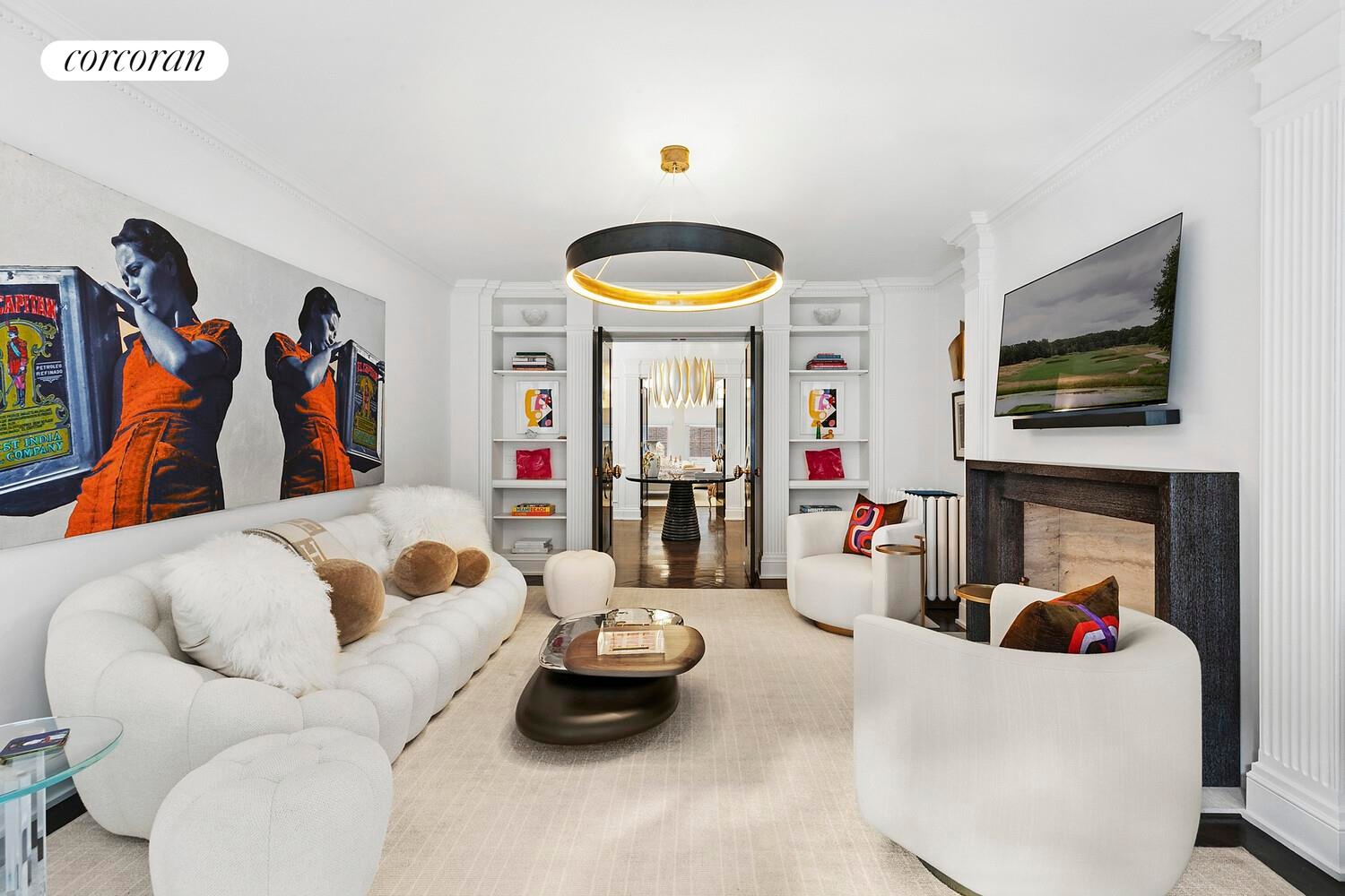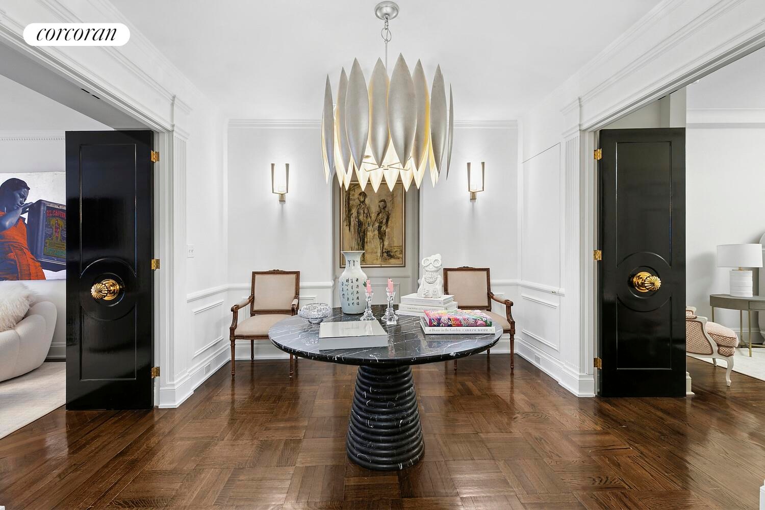 A grand entry foyer opens into an expansive 23-foot living room framed by dramatic Dorothy Draper black lacquer doors with bronze Guerin hardware. Sunlight pours through two large south-facing windows, accentuating the room's elegant details-including traditional moldings, chair rails, and a stately marble mantel.
