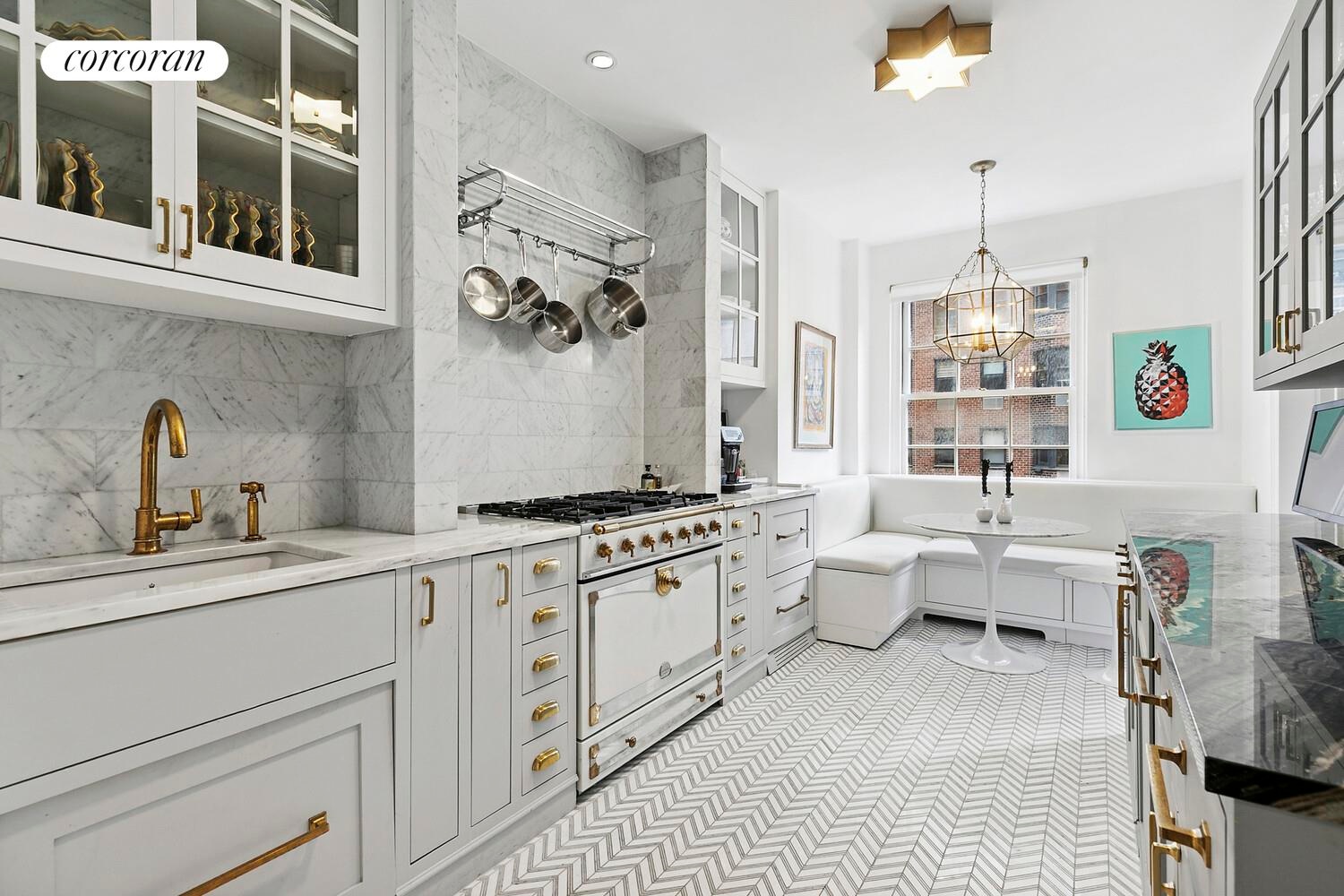 The beautifully renovated kitchen and sunny breakfast area feature custom cabinetry, Bardiglio and Carrara marble countertops, and premium appliances: a Fisher & Paykel dishwasher, under-counter KitchenAid refrigerator, and a five-burner CornuFe stove by La Cornue. The kitchen also boasts a custom built-in banquette with generous storage, creating a warm and functional space for casual dining. The open flow between kitchen, breakfast area, and living room creates a perfect setting for entertaining.