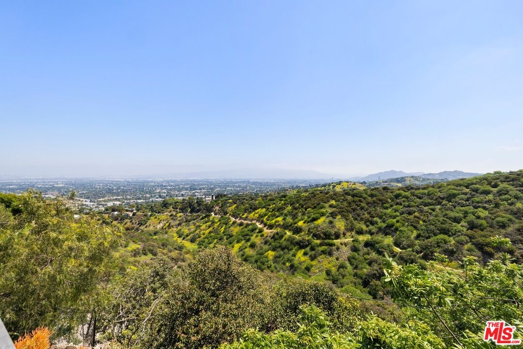 Tucked away on a beloved, private road where turnover is low and some residents own multiple homes, this fantastic refuge promises riveting panoramic views at every moment and peaceful comfort above it all. From sunrise to sunset and into calm California nights, unobstructed vistas inspire creative thought and invoke a passion for this rare way of life in harmony with its natural surround. Sited up a long private driveway with parking for numerous vehicles, the home is meticulously appointed with beautiful drought-tolerant landscaping including whimsical olive trees and carefully curated cacti. Guests arrive through a pivot door as floor-to-ceiling panes of glass welcome natural light into the double-height foyer. Entertain in style with a seamless indoor-outdoor vibe as pocket doors fully retract in the living room to provide a casual, elegant flow from east to west. A state-of-the-art Arclinea kitchen is equipped with Miele ovens and appliances as well as a Wolf cooktop, custom Sub-Zero refrigerator, and a generous waterfall island with breakfast bar ledge. The nearby formal dining room, also with retreating doors, is appointed with an impressive floating wall close-off to add intimacy to parties and guide the movement of attendees. Upstairs, the primary suite is magnificent, complete with a sumptuous bath with floating dual-sink vanity, separate shower, toilet room, and centerpiece soaking tub aside walls of sliding glass that open to reveal a private patio with fire pit. A large walk-in closet has custom built-ins to please any modern fashionista. Secondary bedrooms showcase striking mountain and valley views, and bathrooms are dressed in white Italian lacquer cabinets topped in soothing gray Silestone. Screen films in the media room with its plush double-pad cushy floor, or work and study in the roomy office with built-ins and picture window. Downstairs, discover a spacious guest quarters with private entrance and direct access to the home's expansive driveway and motor court. Here, a variety of possibilities and configurations abound, from yoga, massage, and wellness to a potential recording studio or artist's haven! Complete with en-suite bath, separate HVAC, and walk-in closet, this partitioned space can also be utilized for passive income. Outside, there are multiple lawns, a saltwater pool and spa, and a sprawling lounging deck from which the back of the Hollywood Sign's H can be seen as well as the San Jacinto Mountains 100+ miles away! Enjoy close proximity to hiking trails including Dixie Canyon Park, centrally located just moments to the high fashion of Rodeo Drive or the boutique charm of Studio City. Welcome to a fresh, coveted lifestyle relished from this singular viewpoint in a world-famous locale just off of Mulholland Drive. Also available fully furnished, including most of the artwork (negotiable; inquire for details).