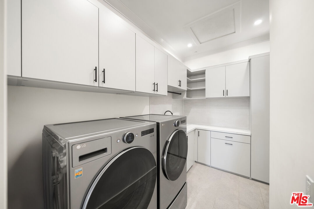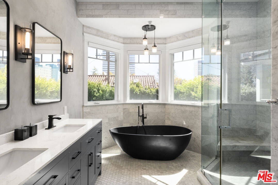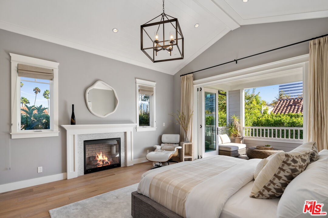 Tucked away in the highly coveted Beverly Grove neighborhood, this Cape Cod-inspired residence blends timeless design with modern luxury, creating the ideal setting for elevated family living. The entry level welcomes you with a grand two-story foyer and a thoughtfully designed floor plan featuring formal living and dining rooms, a versatile en suite bedroom or home office, and an expansive great room that flows seamlessly into the kitchen. The chef's kitchen is a standout, equipped with a Bertazzoni Heritage 6-burner range with griddle, custom cabinetry, and elegant quartzite countertops that elevate both form and function. Beautiful oak floors flow effortlessly throughout the home, leading to folding glass doors that open to a private outdoor retreat. This tranquil sanctuary includes a covered patio with a new ceiling fan, a dedicated dining area, lush new turf and landscaping, and a sparkling pool and spa complete with a rebuilt pump enclosure and added child safety fencing - perfect for both entertaining and everyday enjoyment. Upstairs, the primary suite is a private retreat, featuring an expansive terrace, dual custom closets, and a newly reimagined spa-inspired bath with a soaking tub, custom vanity, plaster accents, updated lighting and mirrors, and a Toto bidet. Upstairs you'll find three additional en suite bedrooms - two with views of the iconic Hollywood Sign - along with a fully customized new laundry room with upgraded tile and cabinetry. Every detail has been thoughtfully enhanced, from retrofit LED lighting and whole-home screens and blinds to upgraded audio, video, and security systems - including DoorBird entry, 24/7 recording, and seamless smart app integration. The finished garage includes new cabinetry, decorative lighting, a workbench, Tesla-ready 240V charger, and a brand-new door and motor. Additional highlights include new private front and side gates with stucco privacy walls, a generator connection at the main panel, multi-zone climate control, and fully paid solar providing energy efficiency and long-term savings. Securely gated and just moments from LA's premier dining, shopping, and entertainment, this move-in-ready home combines classic elegance, contemporary convenience, and the warmth of true family living.