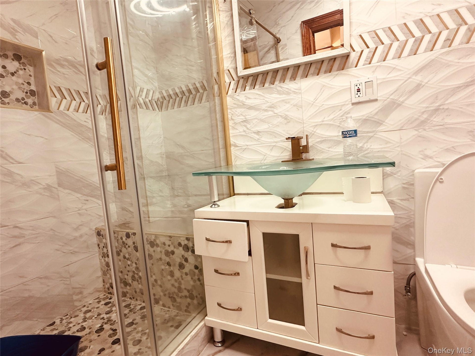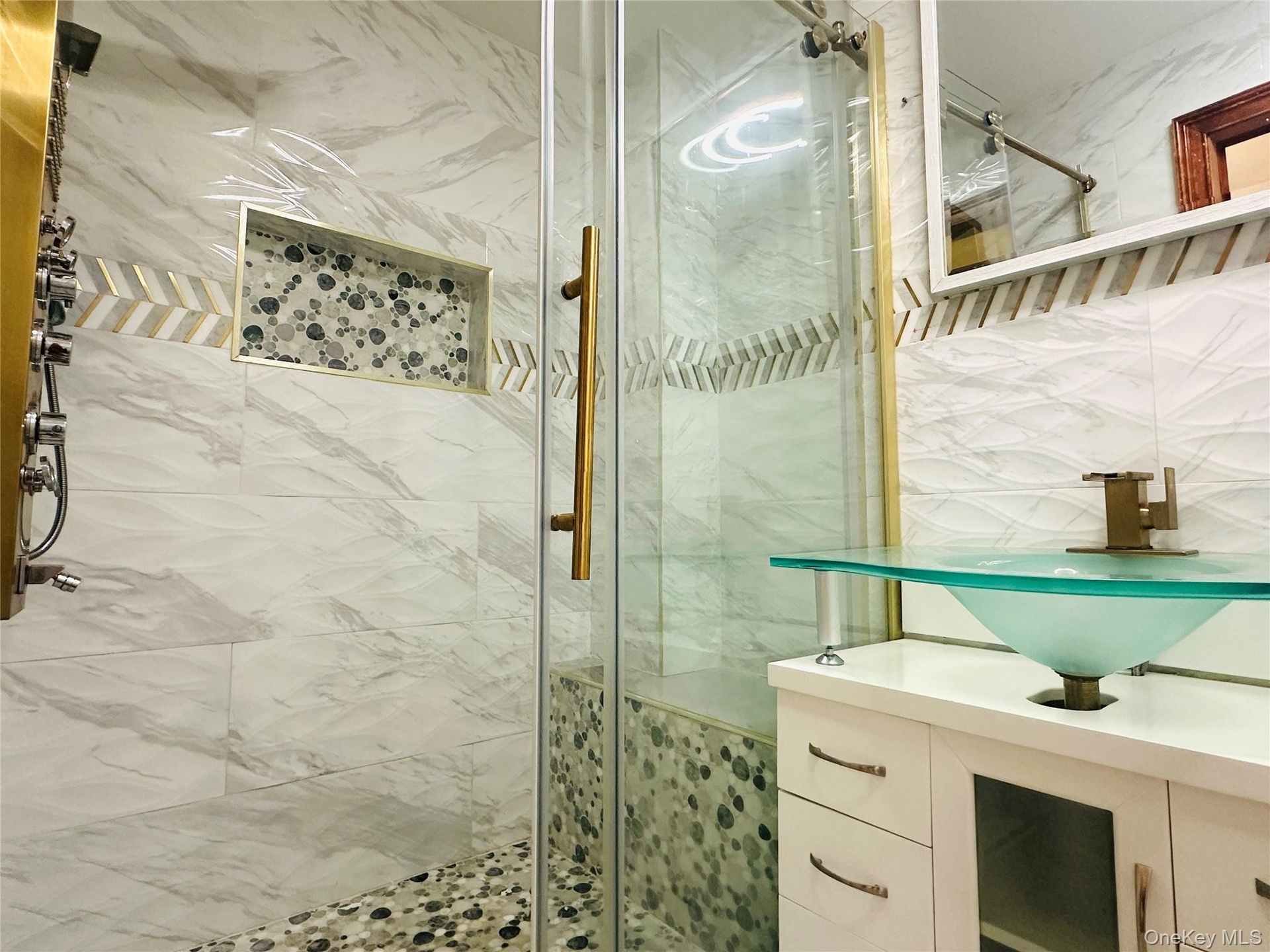 - Full bathroom with vanity, a stall shower, tile walls, and a bathtub