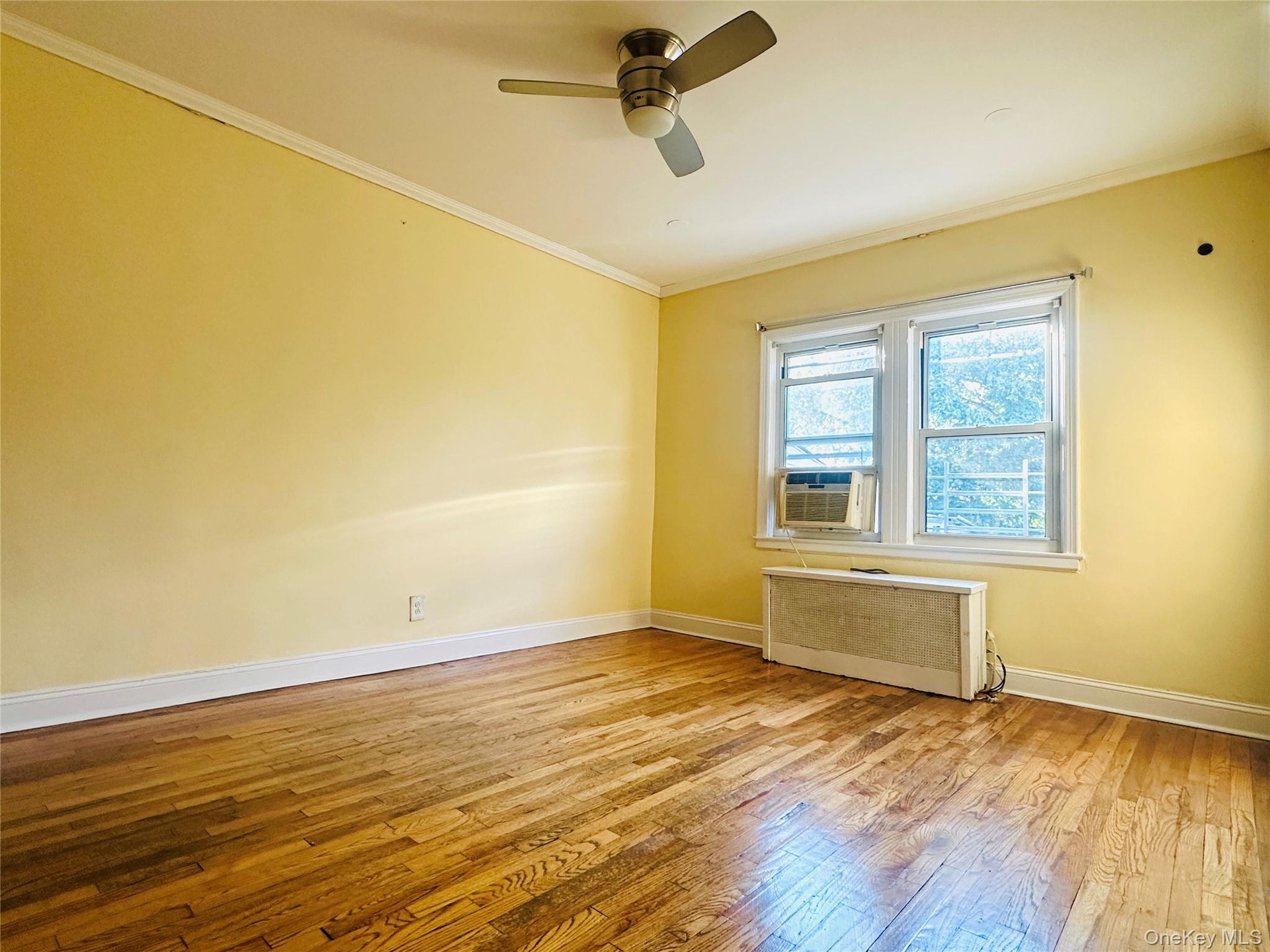 - Spare room with crown molding, light wood-type flooring, radiator heating unit, a ceiling fan, and cooling unit