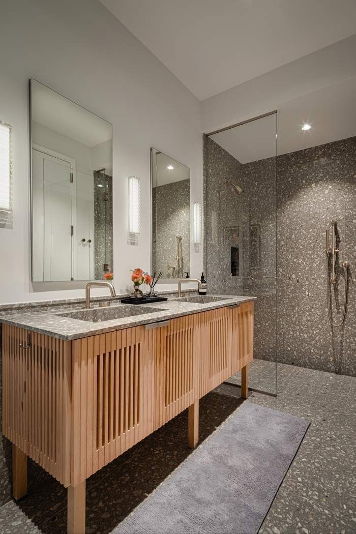 The primary bedroom is complemented by dual closets. The primary bathroom is also accessible from the main living area and features Agglo Ceppo honed stone walls, flooring and countertops, and a custom-slatted white maple double vanity with satin nickel cabinetry pulls, deck-mounted faucet and oak controls. A discreetly located closet featuring LG washer & dryer completes this exceptional offering.