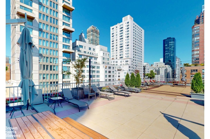 The building delivers every convenience: 24-hour doorman, concierge, live-in super, landscaped roof deck, on-site laundry, package and bike rooms, and direct parking garage access (separate fee; wait list may apply). Storage units are also available (separate fee).