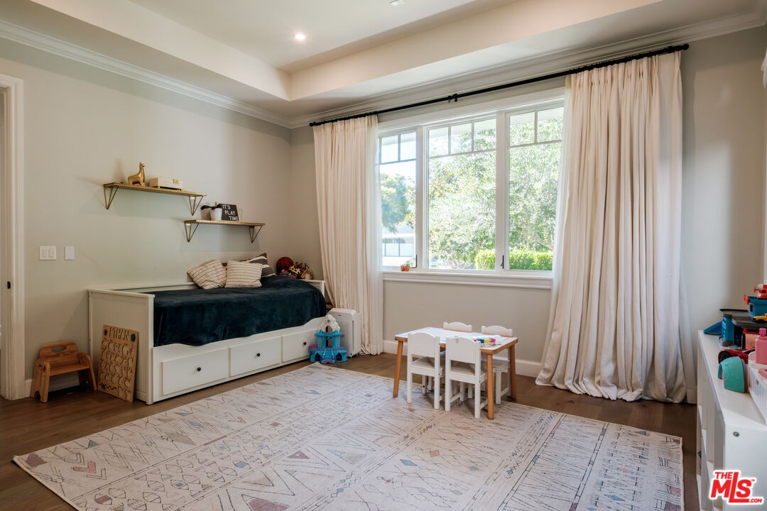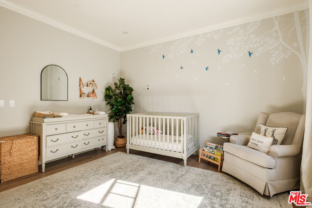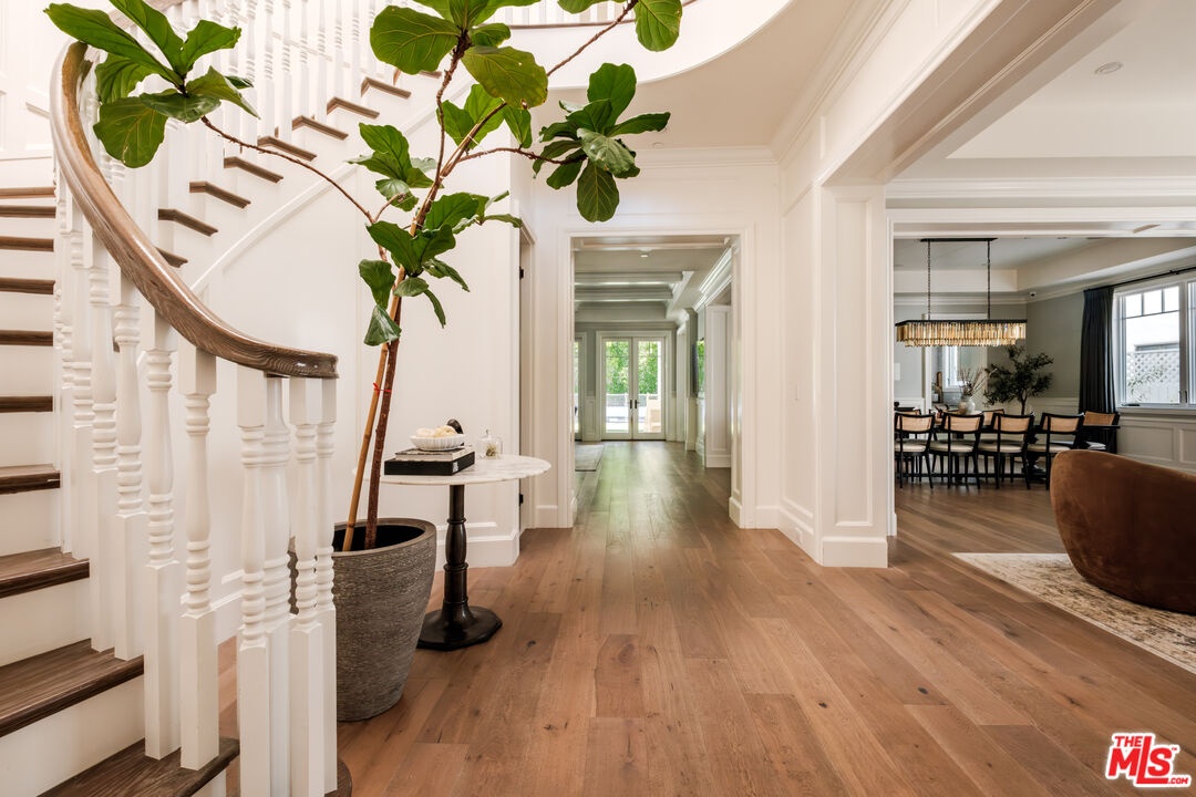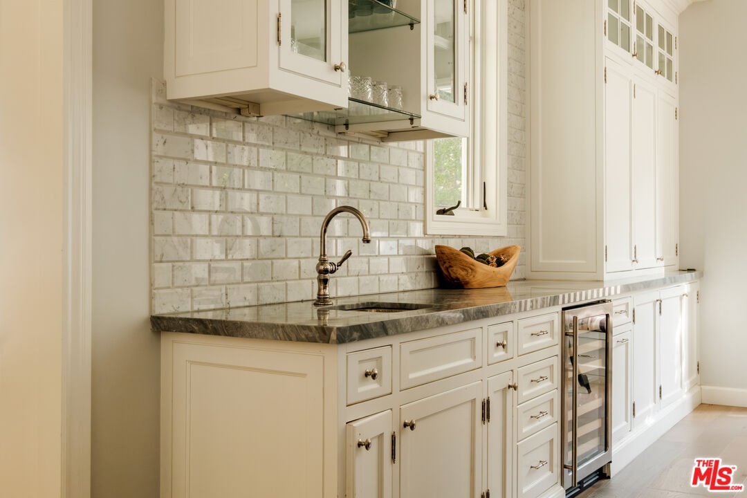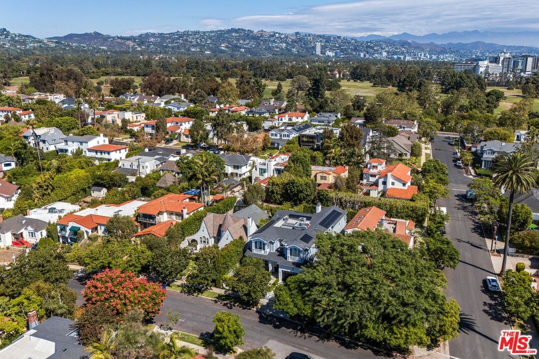 Set within one of Westwood's most coveted neighborhoods, this exquisite custom-built residence blends timeless traditional architecture with modern luxury. Spanning over 5,000 square feet, the home welcomes with warm wood floors, bespoke millwork, and coffered ceilings that exude sophistication and craftsmanship at every turn. The formal living and dining rooms provide convenient access to a wine cellar, creating an ideal space for entertaining. Just beyond, the sunlit family room opens through French doors to a covered stone patio with an exterior fireplace, for effortless indoor-outdoor living. At the heart of the home lies a gourmet chef's kitchen, adorned with striking stone countertops, a seated island, and premium appliances, including a Wolf gas range and double ovens. The space also boasts a full-sized refrigerator and freezer, abundant pantry storage, and a charming breakfast banquette overlooking the backyard. Ascend the curved stairway to the expansive primary suite. This private sanctuary impresses with vaulted ceilings, a balcony, and dual custom walk-in closets. The spa-inspired en suite bath is a serene retreat with dual vanities, dual separate water closets, a glass-enclosed shower, and a luxurious soaking tub. Find three additional bedroom suites upstairs, plus one conveniently located on the main level, providing flexibility for guests or use as an office. Additional amenities include a powder room on the main level, built-in surround sound, and solar panels with three Tesla batteries for sustainable living. Outside, the lush backyard is enveloped by mature hedging and features a covered patio, built-in BBQ, sparkling pool and spa, and a spacious lawn for relaxation or play. Secured behind an automatic driveway gate is an attached two-car garage with newly epoxied floors and direct access. Ideally situated just moments from top-rated schools, Holmby Park, Westfield Century City, and Westwood Village, this remarkable home offers timeless sophistication, comfort, and convenience for the very best of Westside living.