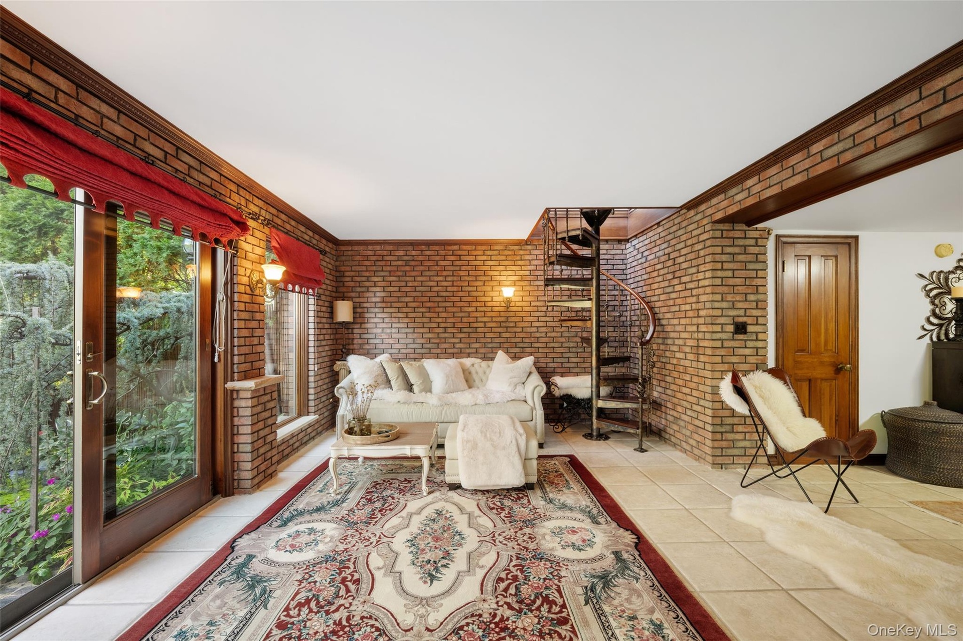 - Living room with brick wall, tile patterned floors, and a brick fireplace