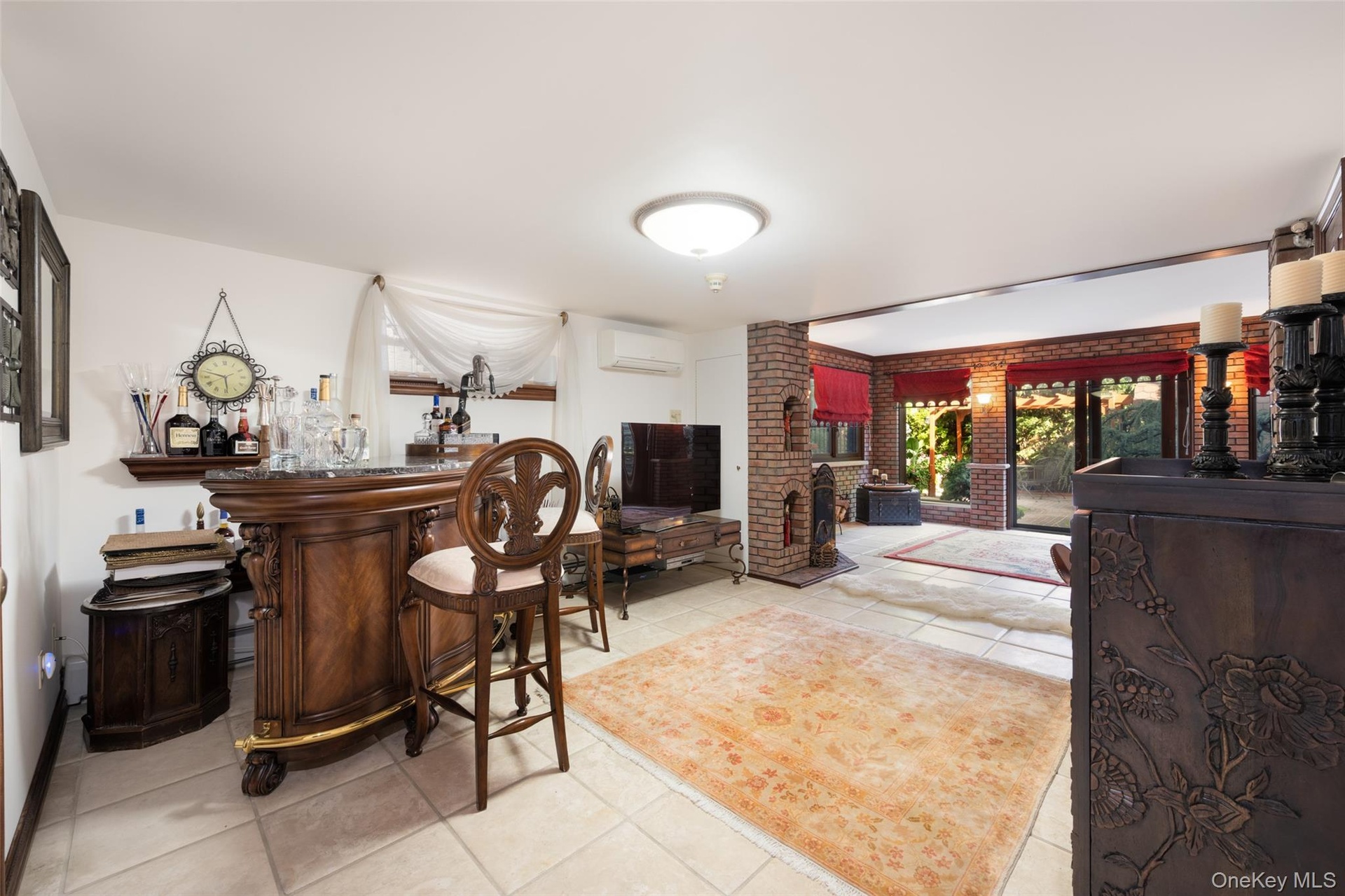- Indoor dry bar with light tile patterned floors, a wall unit AC, and brick wall