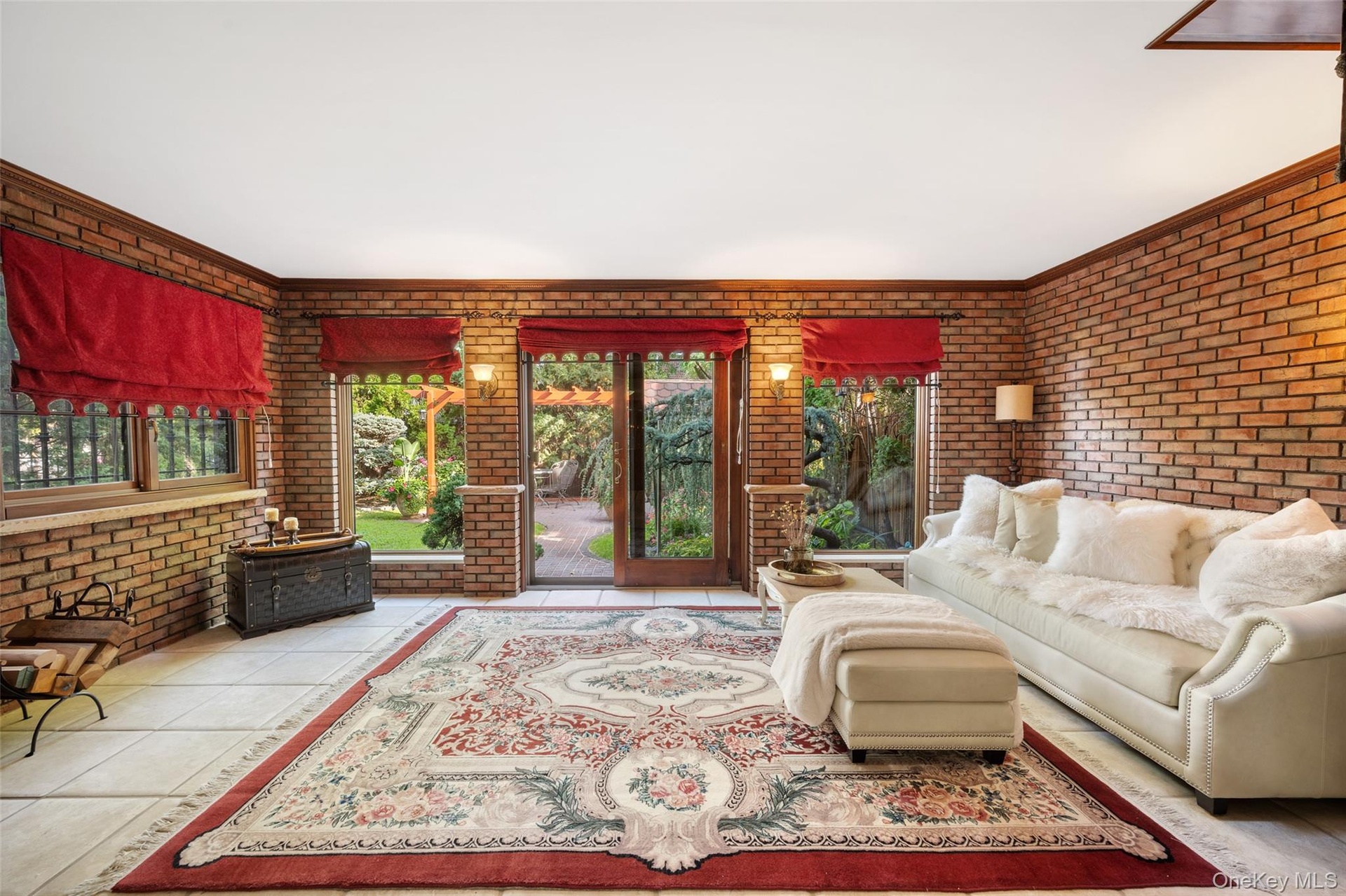 - Living room with brick wall, crown molding, and light tile patterned floors