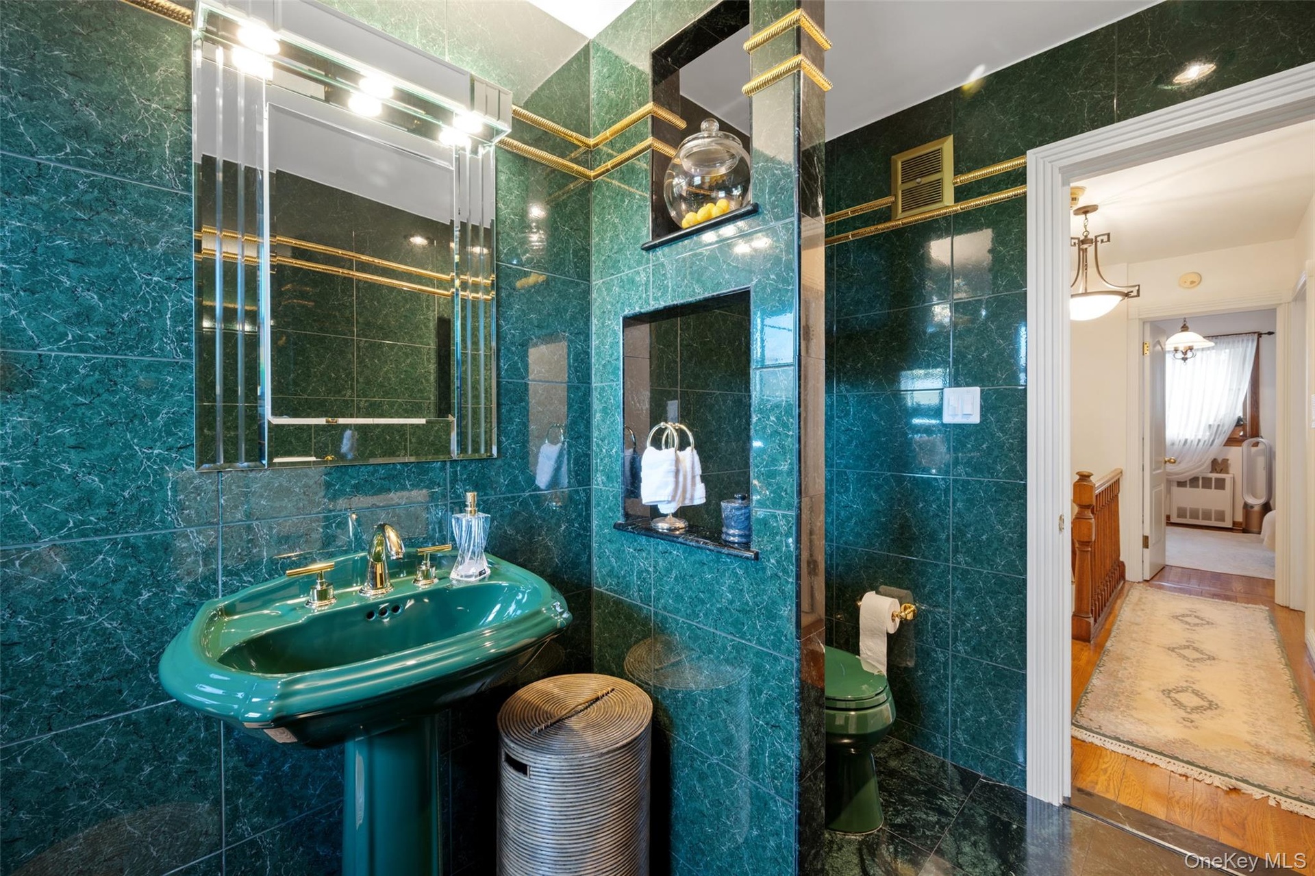 2nd Floor: Front porch with wrought-iron railing, grand double living rooms, dining area, semi-open kitchen, and 1/2 bath next to original Sauna room. A bright family room with floor-to-ceiling windows.