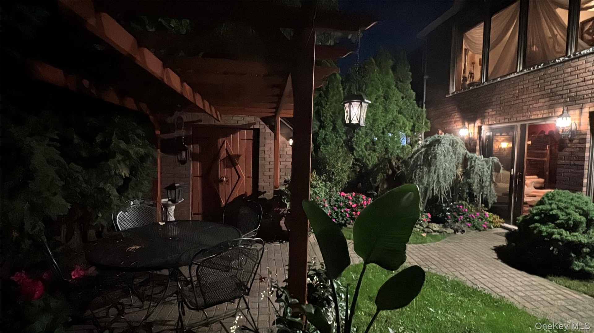 - View of green lawn with a pergola, a patio, and view of wooded area