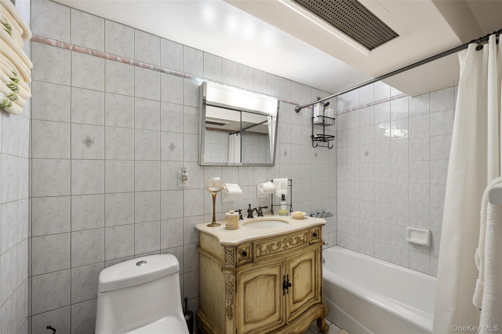 - Full bathroom featuring tile walls, vanity, and shower / bathtub combination with curtain