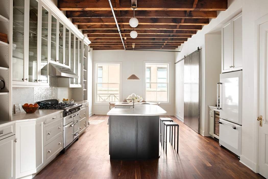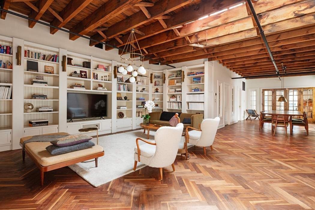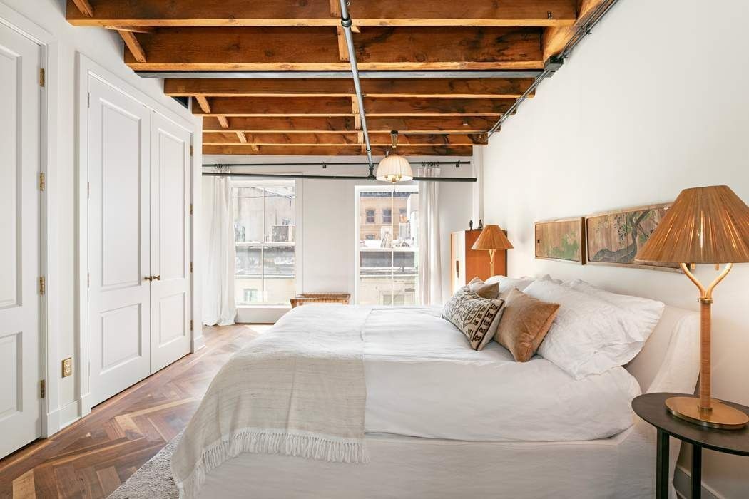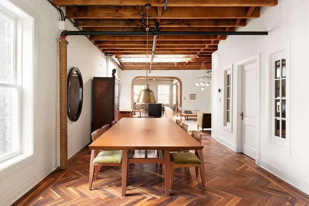 The sun-flooded, full floor loft is offered in superb condition with central air conditioning and beautiful walnut floors in a herringbone pattern. The enfilade of airy, open spaces features ceilings rising to almost 12 feet, a large skylight, the historic building’s signature wood ceiling joists, and original brick walls. The expansive Dining Room and a bookshelf-lined Living Room open onto a large open plan Chef’s Kitchen. The gourmet Kitchen is anchored by a massive center island flanked by abundant custom cabinetry and includes a classic 6-burner AGA range, a Marvel refrigerator and freezer, a Miele dishwasher, and a Uline wine storage unit and flows seamlessly into the adjacent Breakfast Room. A sliding steel door serves as a distinctive focal point, reinforcing the building’s industrial past, while leading to a Second Bedroom with a walk-in closet, which backs up to a Powder Room, with the potential to be converted to a second full Bathroom.