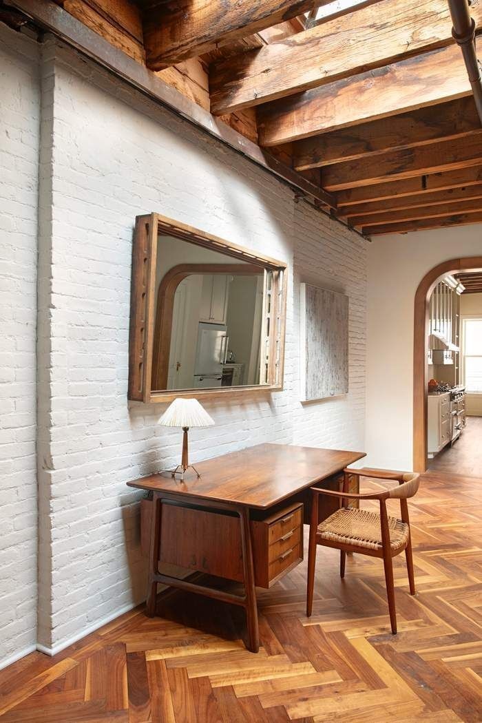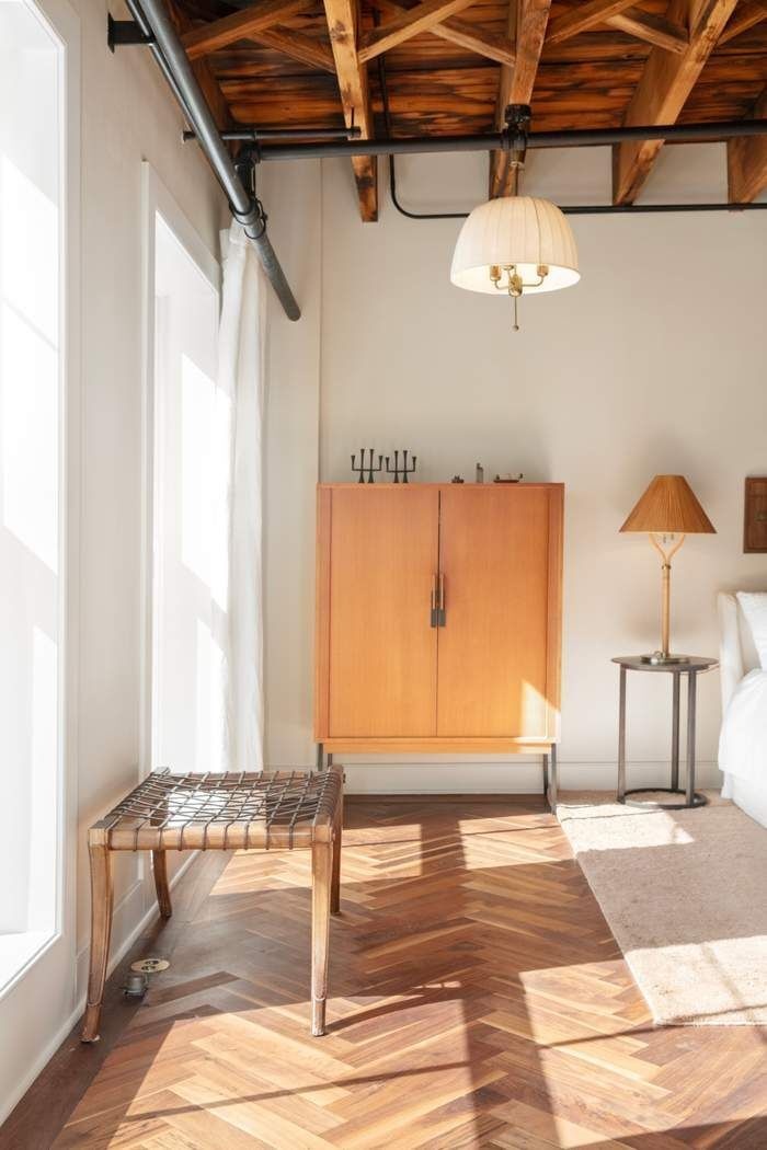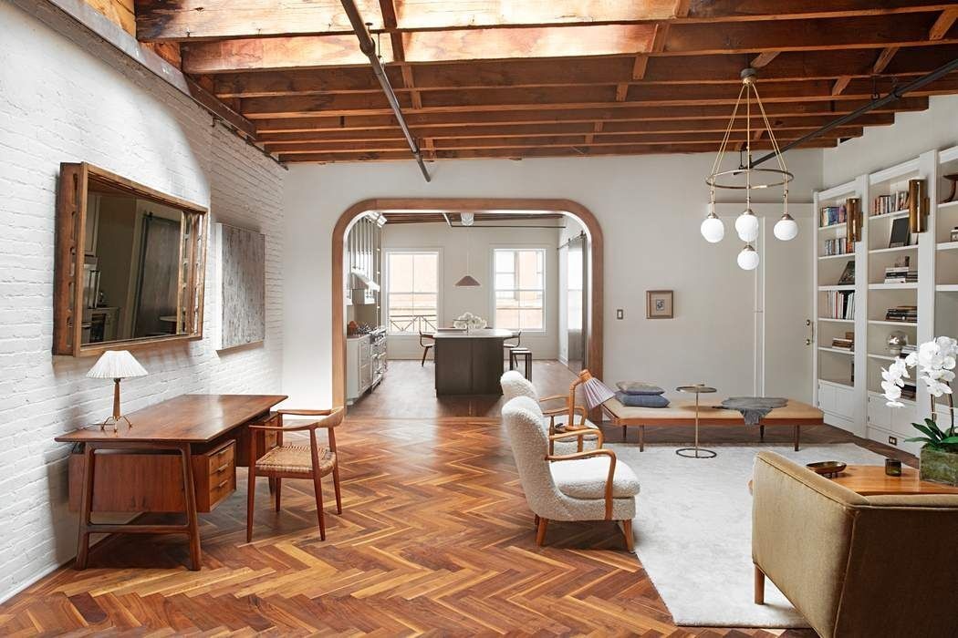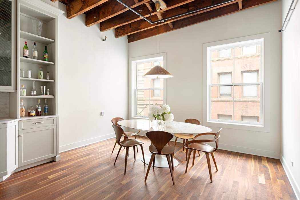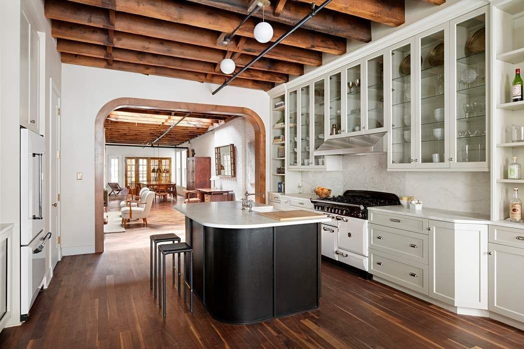 The sun-flooded, full floor loft is offered in superb condition with central air conditioning and beautiful walnut floors in a herringbone pattern. The enfilade of airy, open spaces features ceilings rising to almost 12 feet, a large skylight, the historic building’s signature wood ceiling joists, and original brick walls. The expansive Dining Room and a bookshelf-lined Living Room open onto a large open plan Chef’s Kitchen. The gourmet Kitchen is anchored by a massive center island flanked by abundant custom cabinetry and includes a classic 6-burner AGA range, a Marvel refrigerator and freezer, a Miele dishwasher, and a Uline wine storage unit and flows seamlessly into the adjacent Breakfast Room. A sliding steel door serves as a distinctive focal point, reinforcing the building’s industrial past, while leading to a Second Bedroom with a walk-in closet, which backs up to a Powder Room, with the potential to be converted to a second full Bathroom.