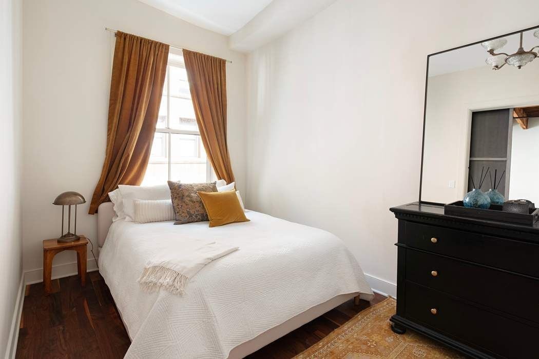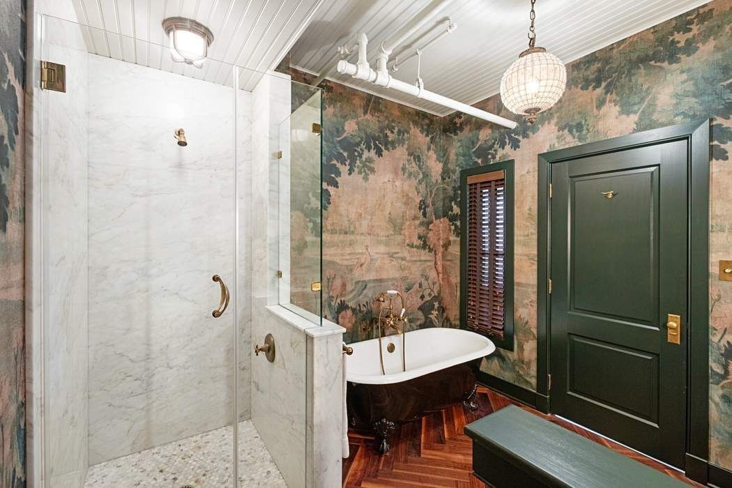 The sunny Primary Bedroom enjoys open sky outlooks over the southern city skyline and features excellent storage and a wall of French doors. The luxurious Primary Bathroom boasts a free-standing clawfoot bathtub, a separate shower, and a double sink finished in marble with elegant brass fittings. The large Laundry/Utility Closet provides excellent storage and a dedicated hot-water heater. Both the skylight and the oversized, double hung windows were newly installed in 2023. The airy and authentic ambiance of Apartment 5 at 70 Thomas Street provides a pristine backdrop for contemporary living in a historic home.