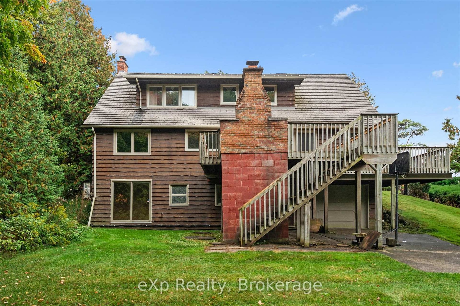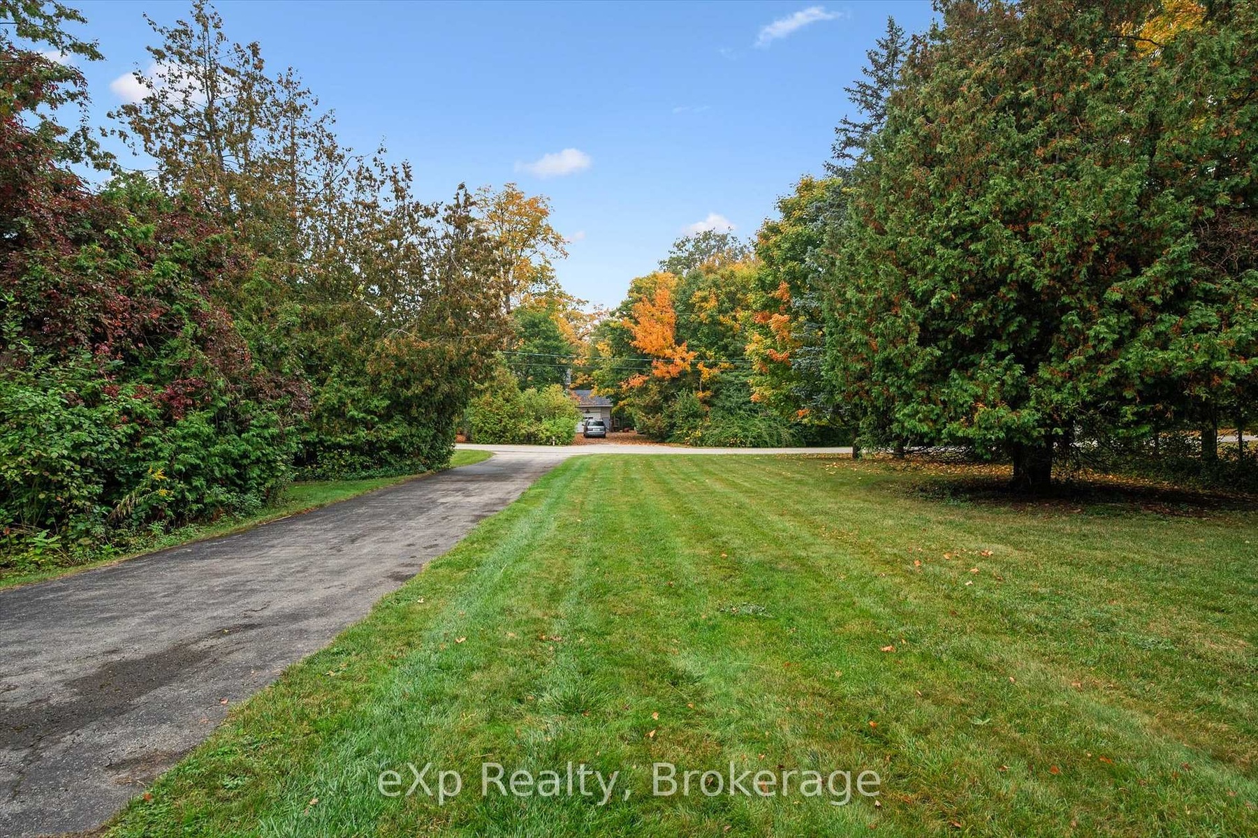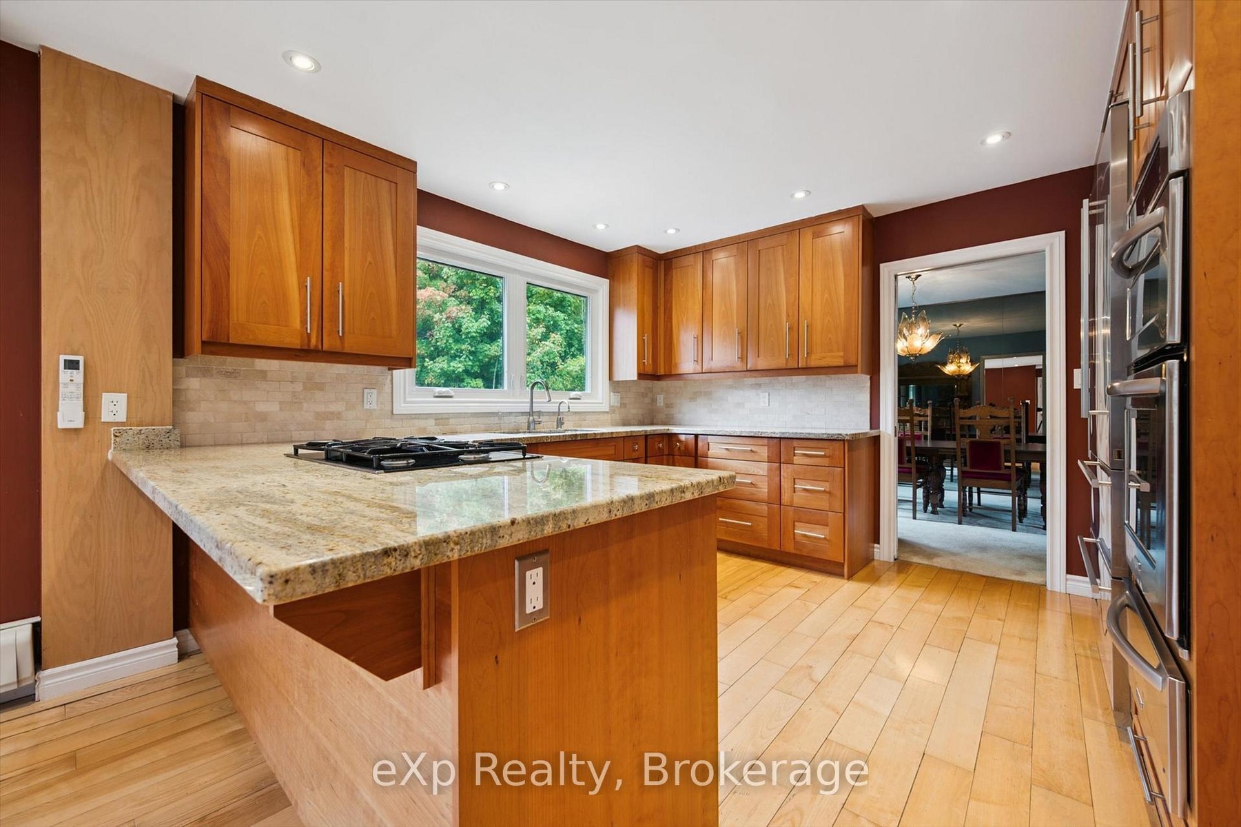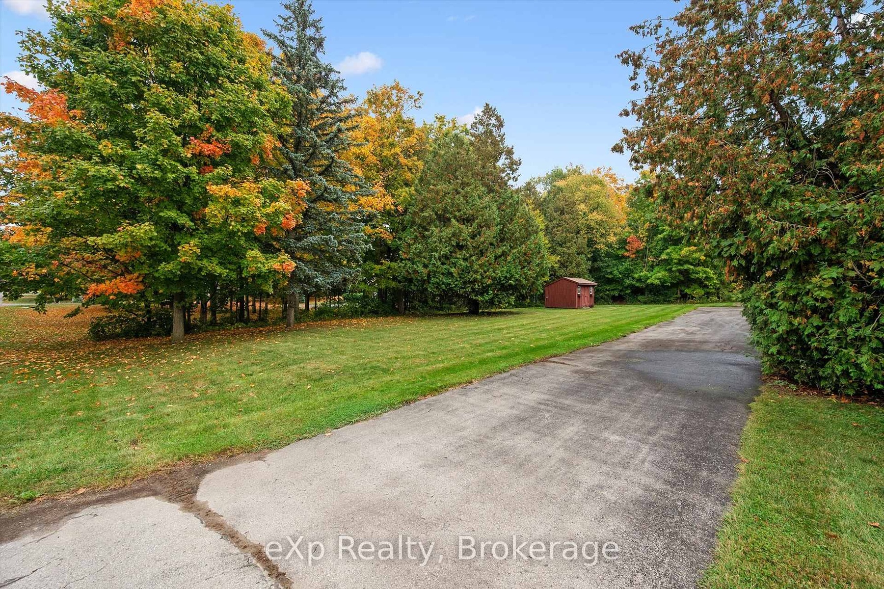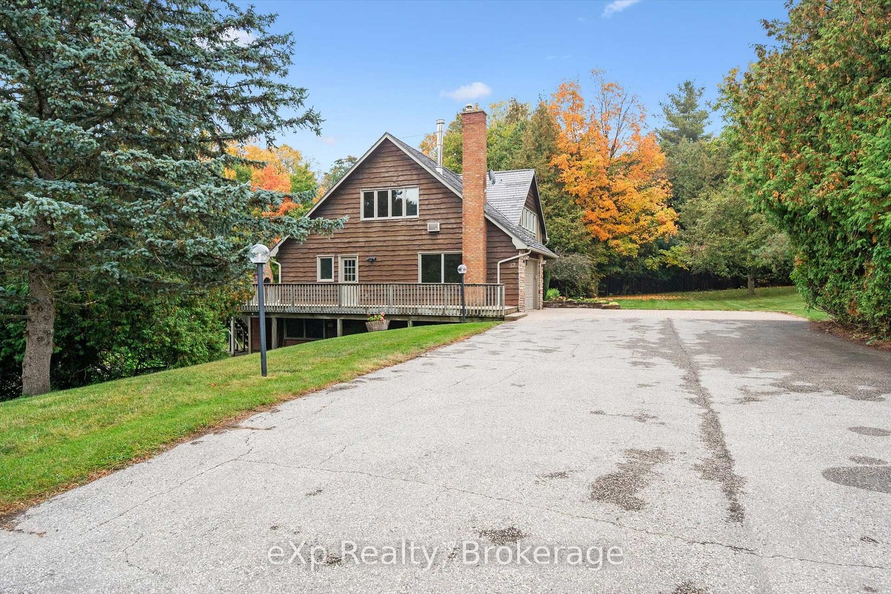 Lovely and private, this 2-acre property with a forested backdrop is nestled in a peaceful rural type setting on the edge of Guelph. Blending vintage charm with incredible potential, it offers endless possibilities whether for multi-generational living, home-based business, or transforming it into your dream home. The well-planned 2,113 sq. ft. two-storey home is full of character and unique design features. From the road you'll find two separate driveways at different grade levels, each leading to its own garage. An attached single garage on the upper level and another at the basement walkout level. Inside, the main and bedroom levels follow a traditional layout with generous principal rooms. The kitchen is beautifully appointed with wood cabinetry, granite countertops, an under mount sink, built-in stainless steel appliances, jenn-air counter top range and a very spacious dinette area. A convenient main-floor laundry room adds to the functionality. Upstairs, you'll find three comfortable bedrooms plus a distinctive cedar-panelled office featuring a retro orange wood-burning fireplace easily converted into a fourth bedroom. A full main bath and a 3-piece ensuite complete the level, along with large newer windows framing private views. The fully finished basement presently offers a recreation room, office, 3-piece bath and a bonus room with second walk-out to yard. This one-of-a-kind home must be seen to fully appreciate its features, character, and the opportunity it offers to bring your vision to life.