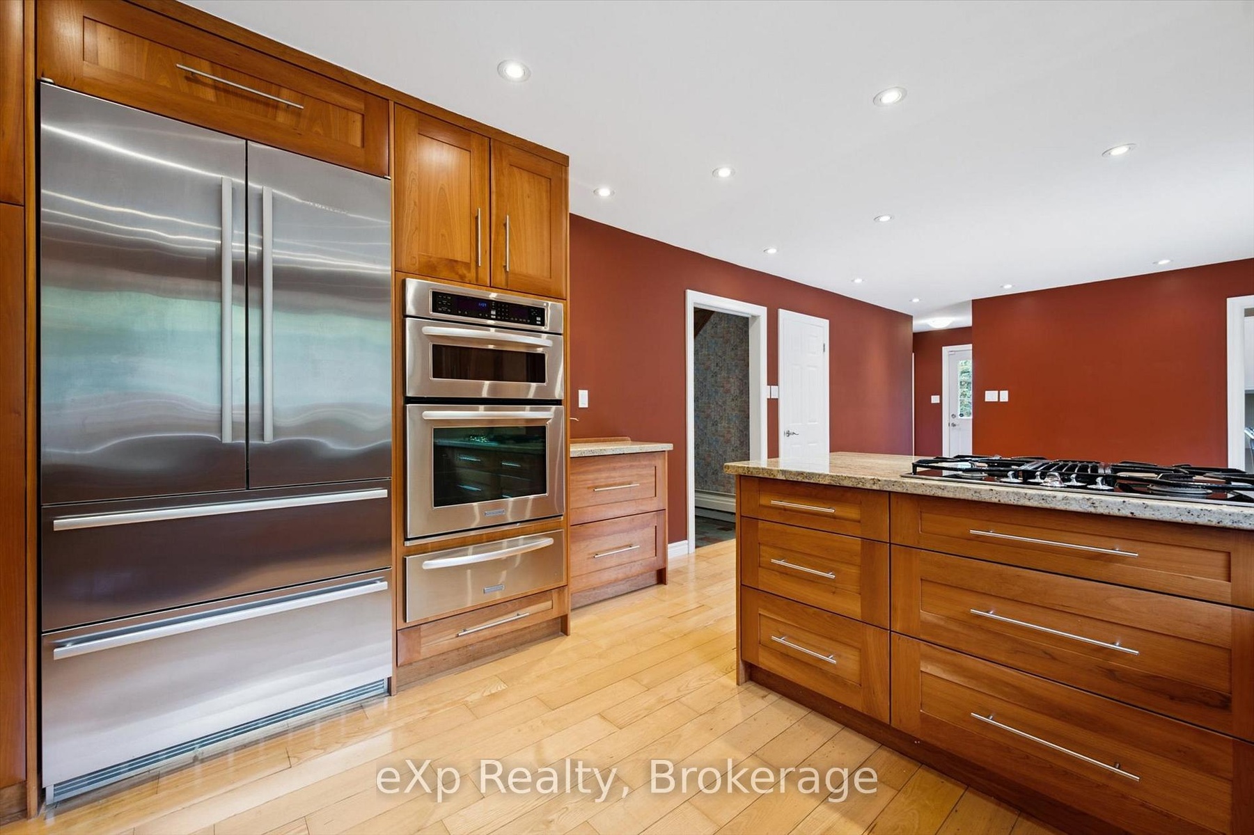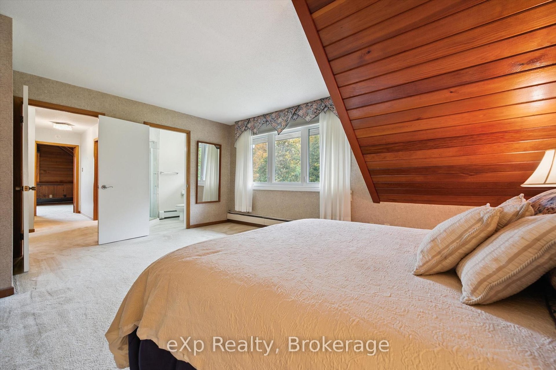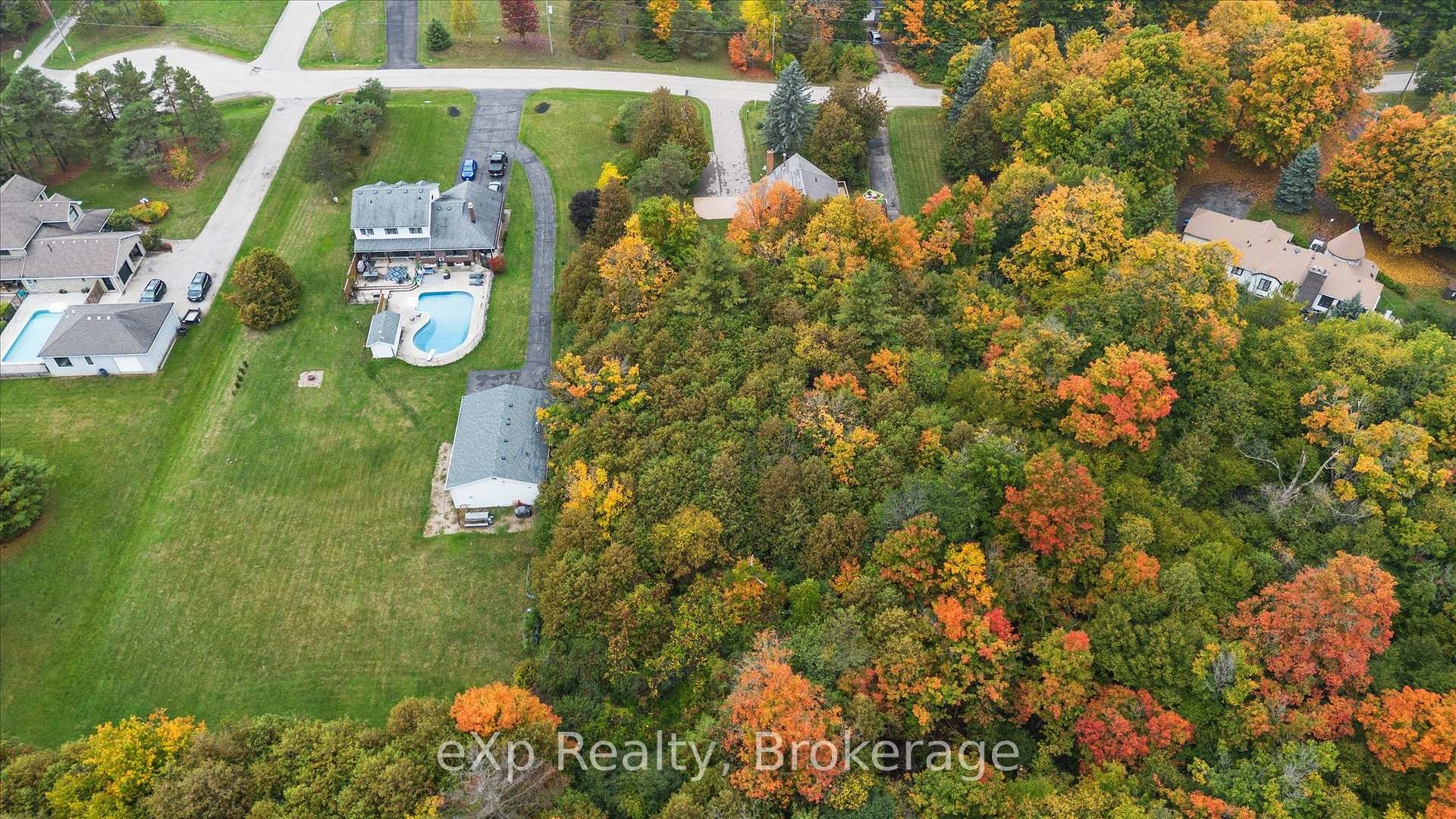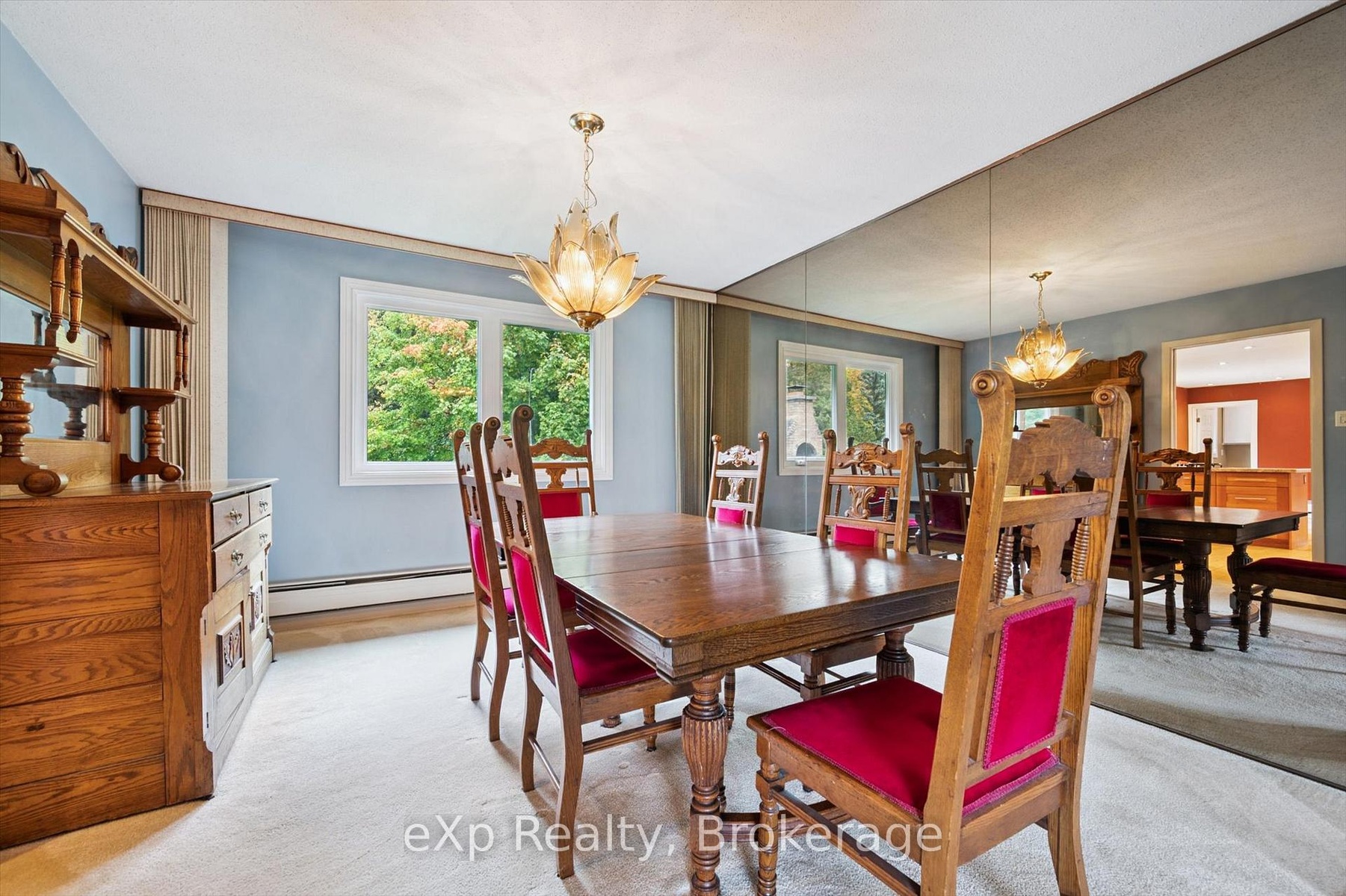 Lovely and private, this 2-acre property with a forested backdrop is nestled in a peaceful rural type setting on the edge of Guelph. Blending vintage charm with incredible potential, it offers endless possibilities whether for multi-generational living, home-based business, or transforming it into your dream home. The well-planned 2,113 sq. ft. two-storey home is full of character and unique design features. From the road you'll find two separate driveways at different grade levels, each leading to its own garage. An attached single garage on the upper level and another at the basement walkout level. Inside, the main and bedroom levels follow a traditional layout with generous principal rooms. The kitchen is beautifully appointed with wood cabinetry, granite countertops, an under mount sink, built-in stainless steel appliances, jenn-air counter top range and a very spacious dinette area. A convenient main-floor laundry room adds to the functionality. Upstairs, you'll find three comfortable bedrooms plus a distinctive cedar-panelled office featuring a retro orange wood-burning fireplace easily converted into a fourth bedroom. A full main bath and a 3-piece ensuite complete the level, along with large newer windows framing private views. The fully finished basement presently offers a recreation room, office, 3-piece bath and a bonus room with second walk-out to yard. This one-of-a-kind home must be seen to fully appreciate its features, character, and the opportunity it offers to bring your vision to life.