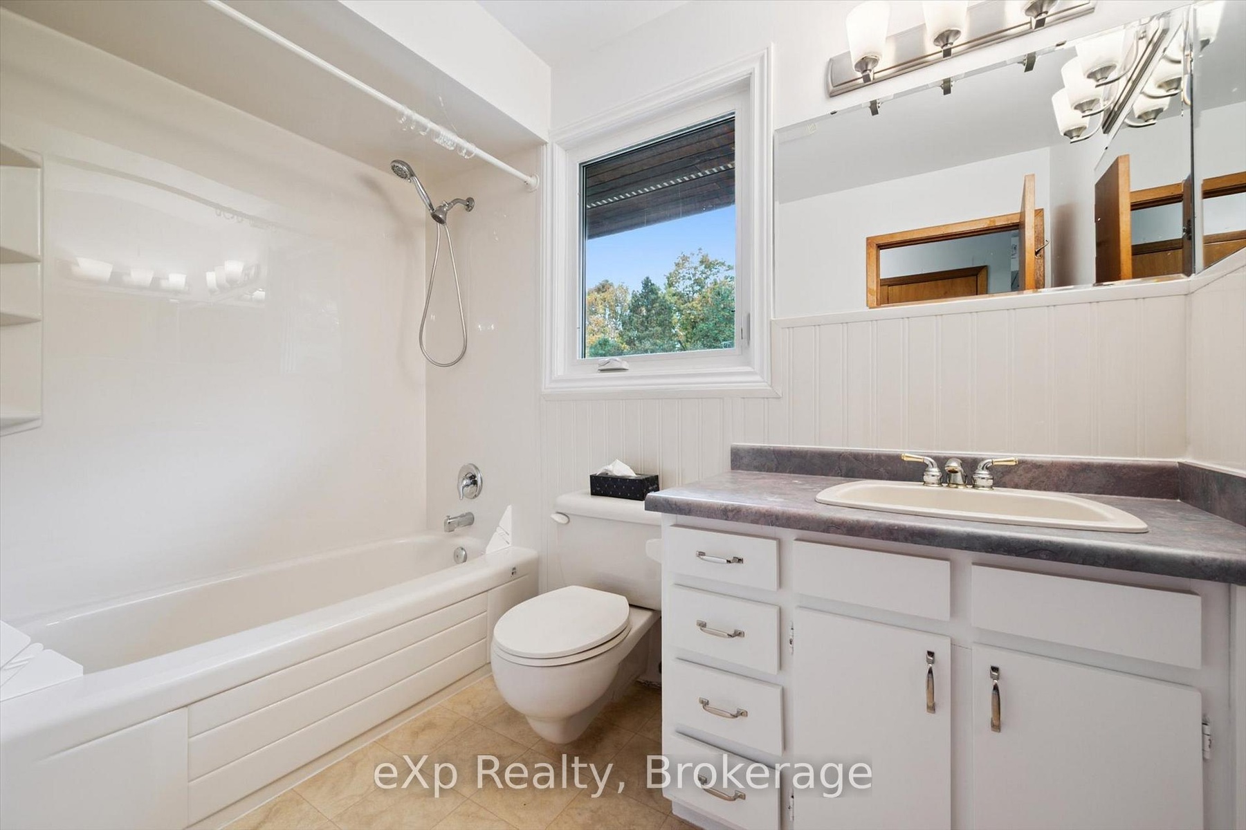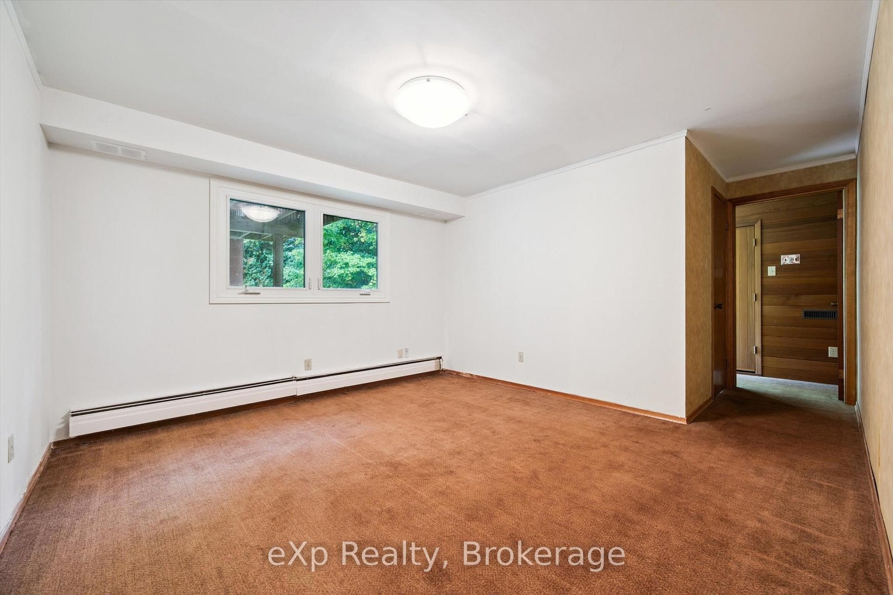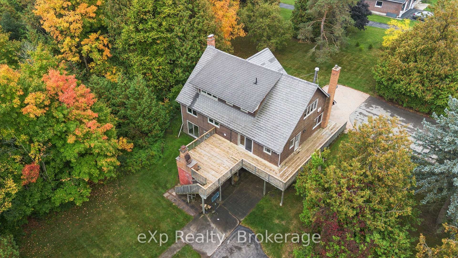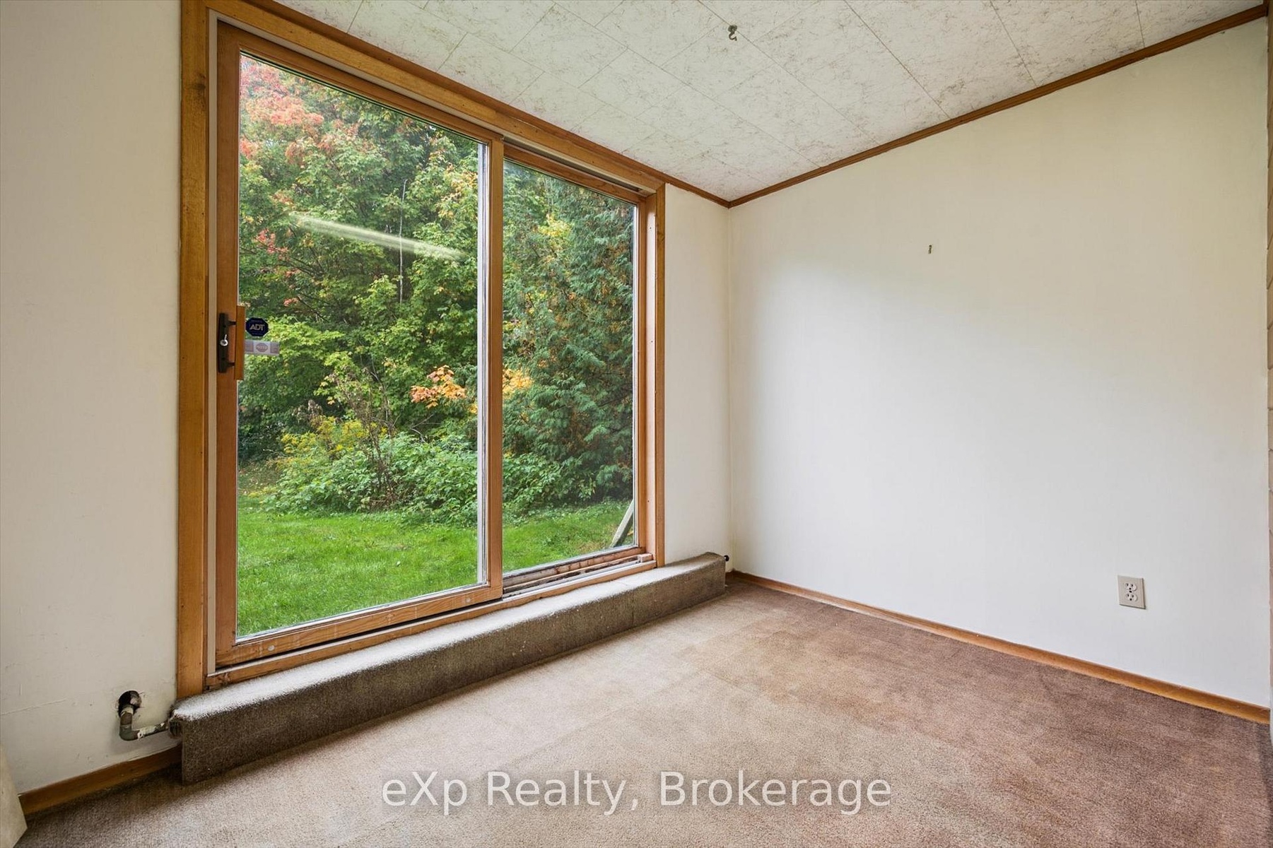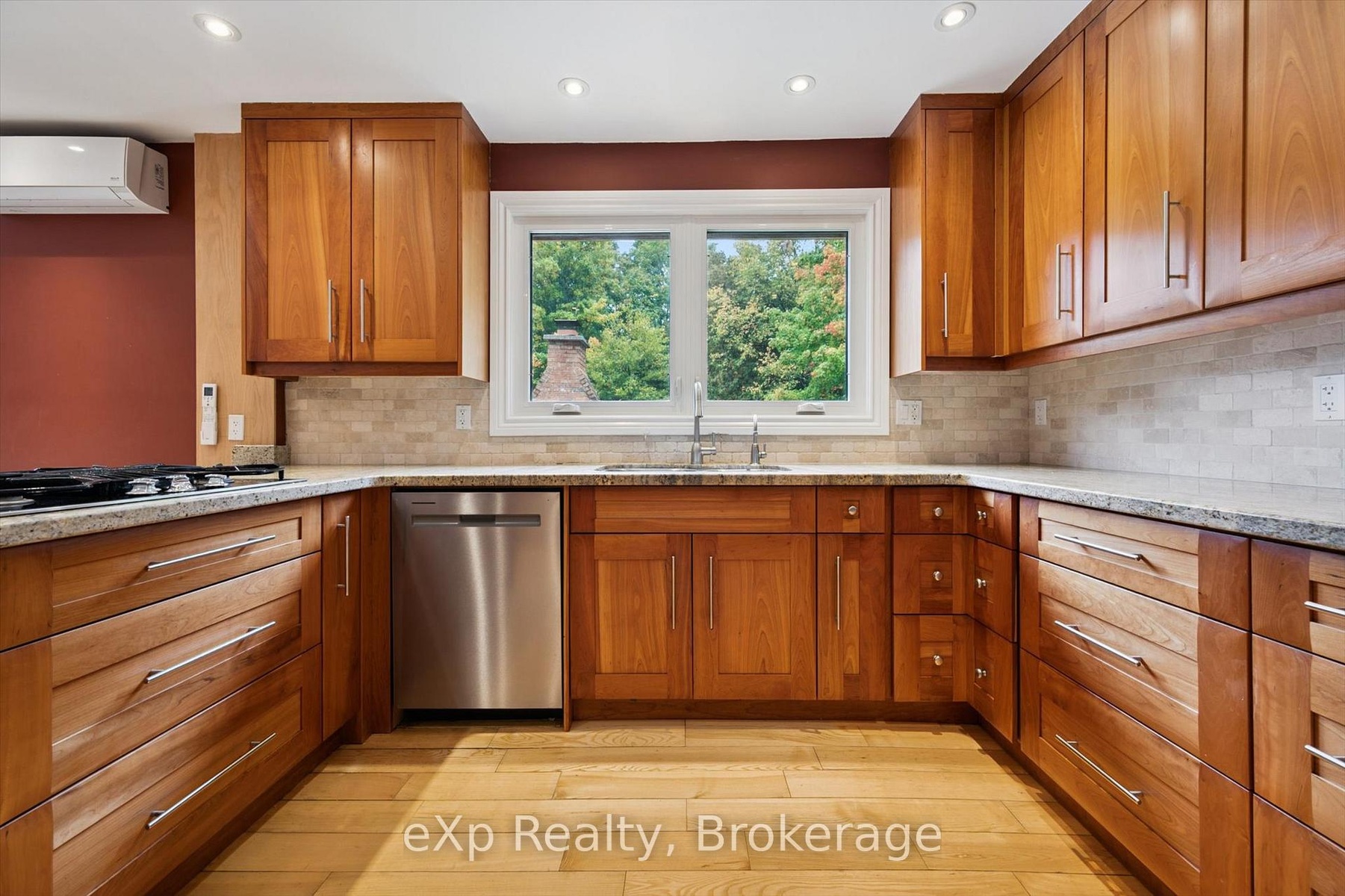 Lovely and private, this 2-acre property with a forested backdrop is nestled in a peaceful rural type setting on the edge of Guelph. Blending vintage charm with incredible potential, it offers endless possibilities whether for multi-generational living, home-based business, or transforming it into your dream home. The well-planned 2,113 sq. ft. two-storey home is full of character and unique design features. From the road you'll find two separate driveways at different grade levels, each leading to its own garage. An attached single garage on the upper level and another at the basement walkout level. Inside, the main and bedroom levels follow a traditional layout with generous principal rooms. The kitchen is beautifully appointed with wood cabinetry, granite countertops, an under mount sink, built-in stainless steel appliances, jenn-air counter top range and a very spacious dinette area. A convenient main-floor laundry room adds to the functionality. Upstairs, you'll find three comfortable bedrooms plus a distinctive cedar-panelled office featuring a retro orange wood-burning fireplace easily converted into a fourth bedroom. A full main bath and a 3-piece ensuite complete the level, along with large newer windows framing private views. The fully finished basement presently offers a recreation room, office, 3-piece bath and a bonus room with second walk-out to yard. This one-of-a-kind home must be seen to fully appreciate its features, character, and the opportunity it offers to bring your vision to life.