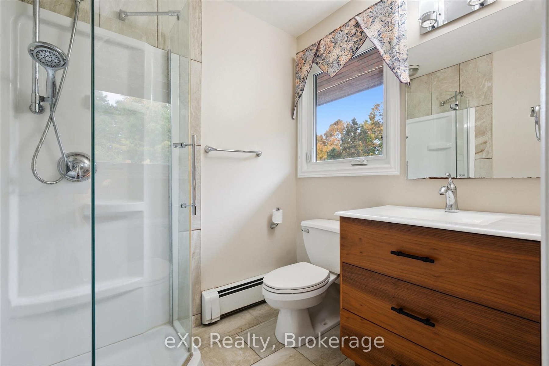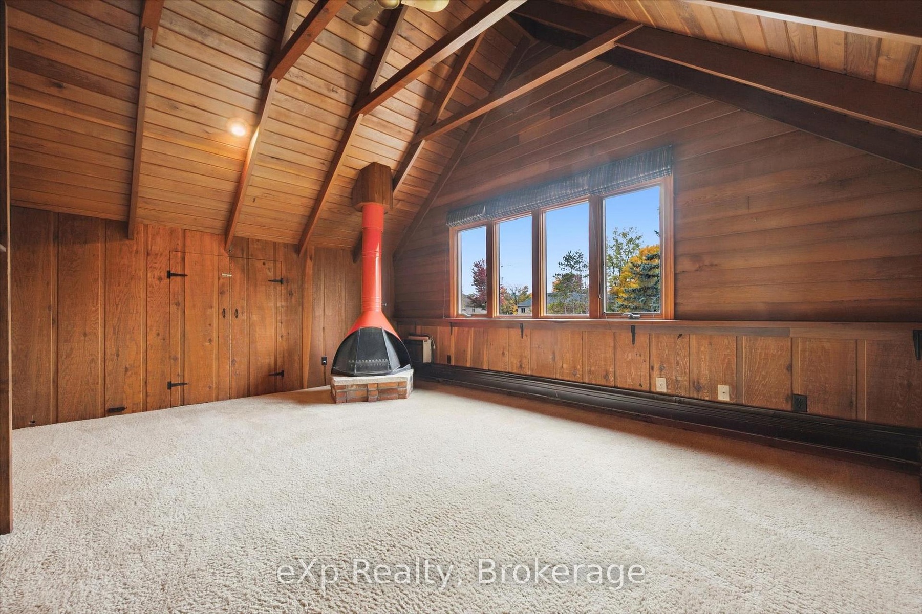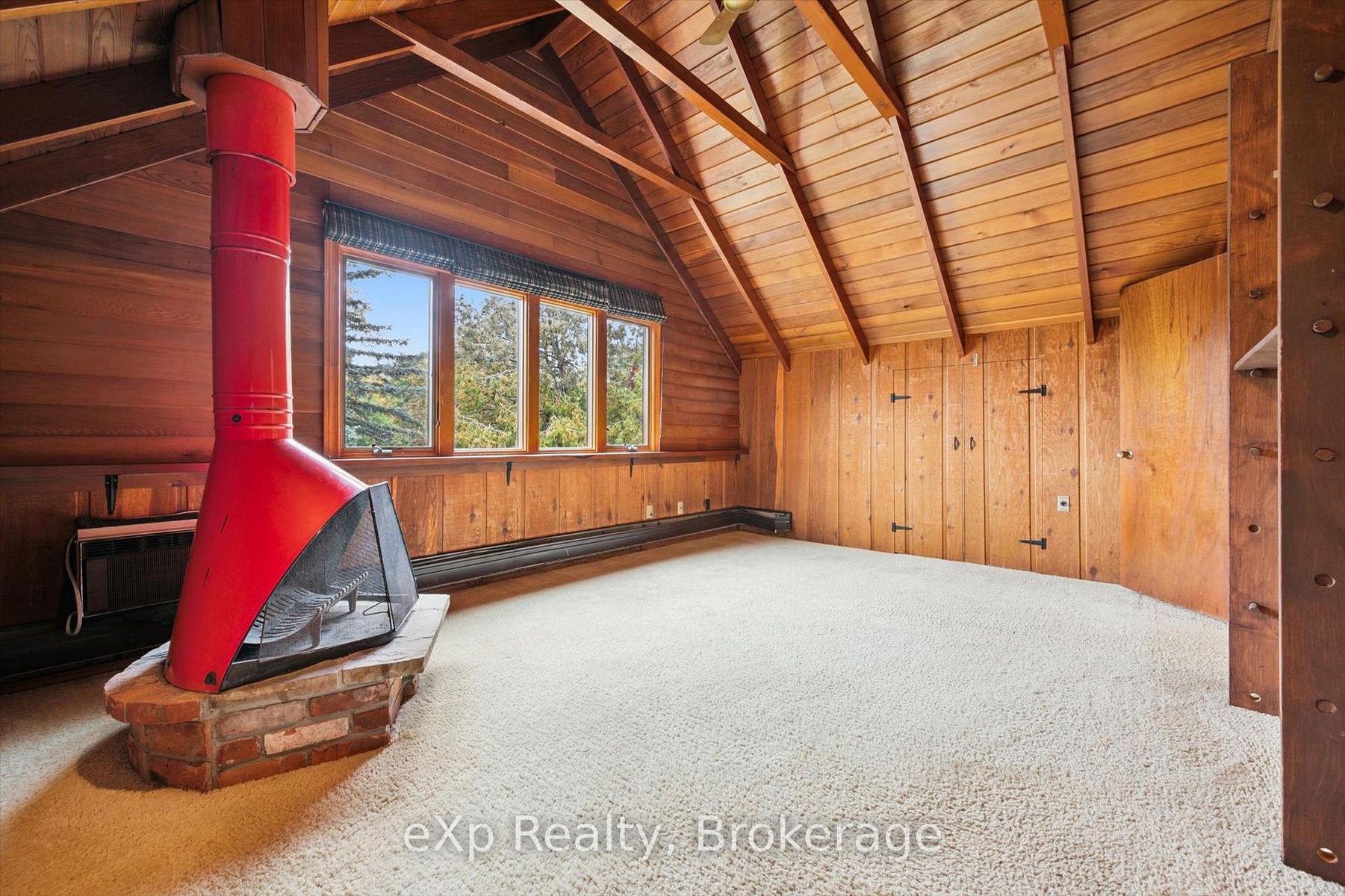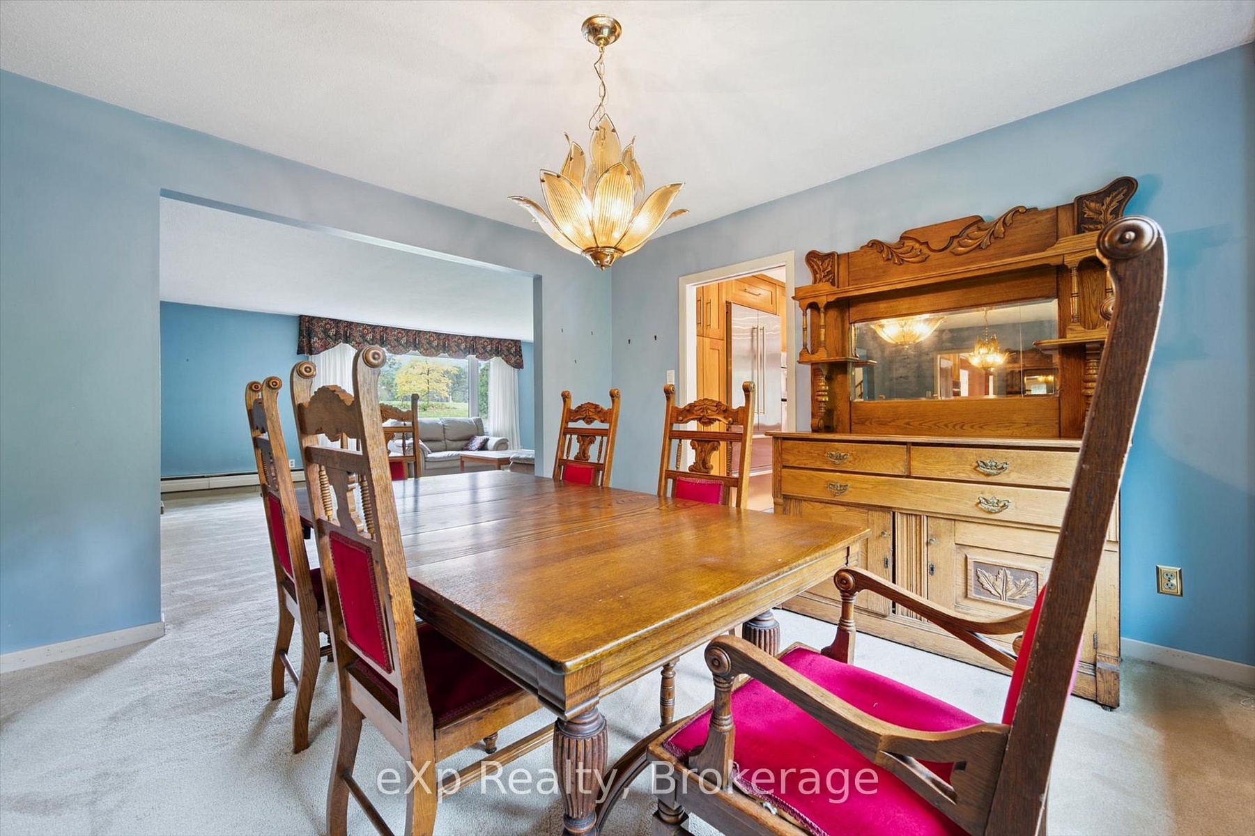 Lovely and private, this 2-acre property with a forested backdrop is nestled in a peaceful rural type setting on the edge of Guelph. Blending vintage charm with incredible potential, it offers endless possibilities whether for multi-generational living, home-based business, or transforming it into your dream home. The well-planned 2,113 sq. ft. two-storey home is full of character and unique design features. From the road you'll find two separate driveways at different grade levels, each leading to its own garage. An attached single garage on the upper level and another at the basement walkout level. Inside, the main and bedroom levels follow a traditional layout with generous principal rooms. The kitchen is beautifully appointed with wood cabinetry, granite countertops, an under mount sink, built-in stainless steel appliances, jenn-air counter top range and a very spacious dinette area. A convenient main-floor laundry room adds to the functionality. Upstairs, you'll find three comfortable bedrooms plus a distinctive cedar-panelled office featuring a retro orange wood-burning fireplace easily converted into a fourth bedroom. A full main bath and a 3-piece ensuite complete the level, along with large newer windows framing private views. The fully finished basement presently offers a recreation room, office, 3-piece bath and a bonus room with second walk-out to yard. This one-of-a-kind home must be seen to fully appreciate its features, character, and the opportunity it offers to bring your vision to life.