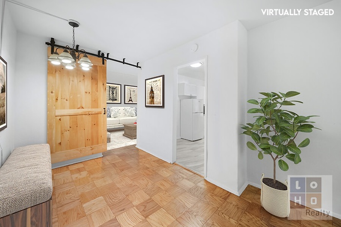The oversized living room is perfect for entertaining and easily accommodates a formal dining area. Adjacent to the kitchen, a generous foyer provides versatility as a dining room, home office, or cozy sitting area. A beautifully crafted wooden sliding door has been installed, allowing you to close off the living room and create a true second bedroom if desired.