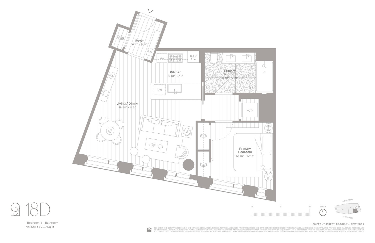 Overlooking the New York Harbor and Downtown Brooklyn in the heart of historic Dumbo, Residence 18D is a spectacular one-bedroom residence. Offering 795 SF of interior space and ceiling heights up to 11' this home perfectly combines luxury and convenience. The foyer with a large coat closet leads into an open kitchen and living/dining area defined by attention to detail throughout.
