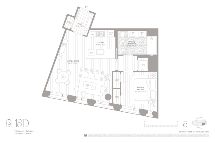 Overlooking the New York Harbor and Downtown Brooklyn in the heart of historic Dumbo, Residence 18D is a spectacular one-bedroom residence. Offering 795 SF of interior space and ceiling heights up to 11' this home perfectly combines luxury and convenience. The foyer with a large coat closet leads into an open kitchen and living/dining area defined by attention to detail throughout.
