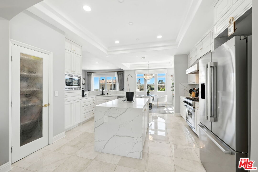 Exquisite, spacious and remodeled END UNIT townhome that gracefully faces the serene green belt, with beautiful wide-open views from every space. Nestled within Toscana, one of Malibu's most coveted gated communities. This contemporary 2-bedroom, 3-bath residence boasts an abundance of natural light, spacious rooms, open-concept living and dining areas, perfect for entertaining or relaxing in style. The sophisticated chef's kitchen features a generous center island, Viking range, pantry, breakfast bar seating that flows seamlessly into a cozy family room, which opens to a private outdoor patio, one of the largest in the entire complex. Main living room area has beautiful end unit views, a large patio and private grassy yard. Ascend to the upper level, where you'll find a welcoming guest room and bath, a convenient laundry room along with a versatile bonus office/den area. The crowning jewel is the ocean view primary suite, complete with a delightful balcony, a spa-like bathroom showcasing a rejuvenating jacuzzi tub, glass enclosed shower, double-sided fireplace and a sizable walk-in closet for all your luxury needs. With soaring high ceilings and skylights, this home exudes elegance and warmth. There is an attached two car garage with storage. Residents of Toscana enjoy a wealth of community amenities, including a sparkling pool, recreation center and gym, all just a stone's throw from the vibrant offerings of Pepperdine University, Malibu Racquet Club, fine dining, trendy shops, Whole foods, hiking trails and beaches. Embrace the Malibu lifestyle that awaits you in this desirable gem of a community.