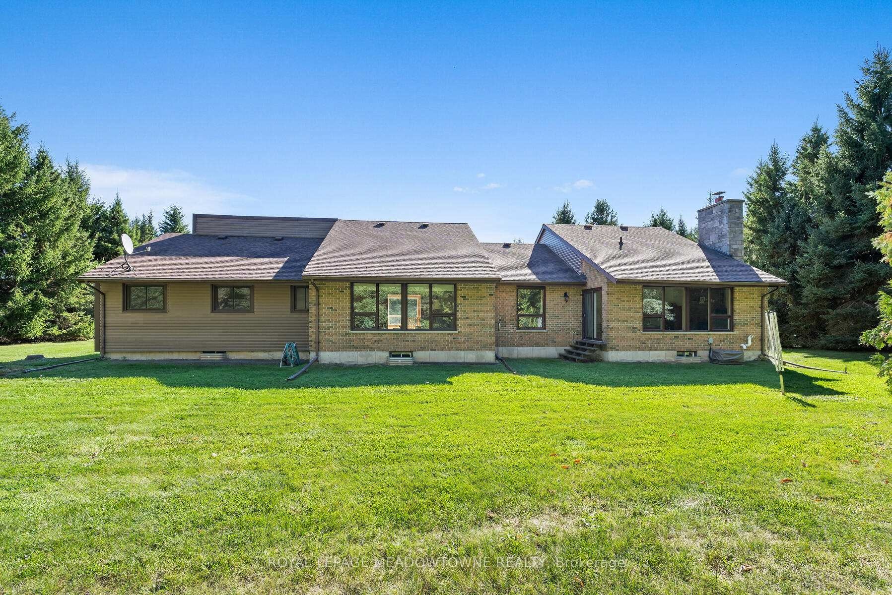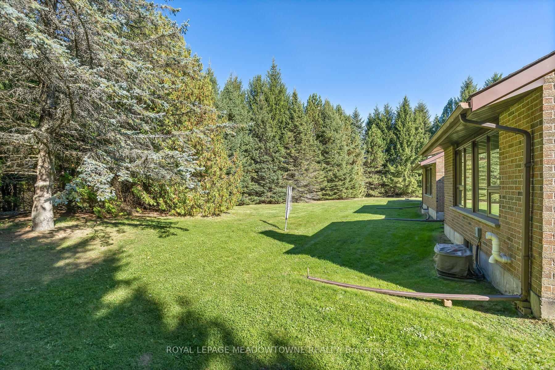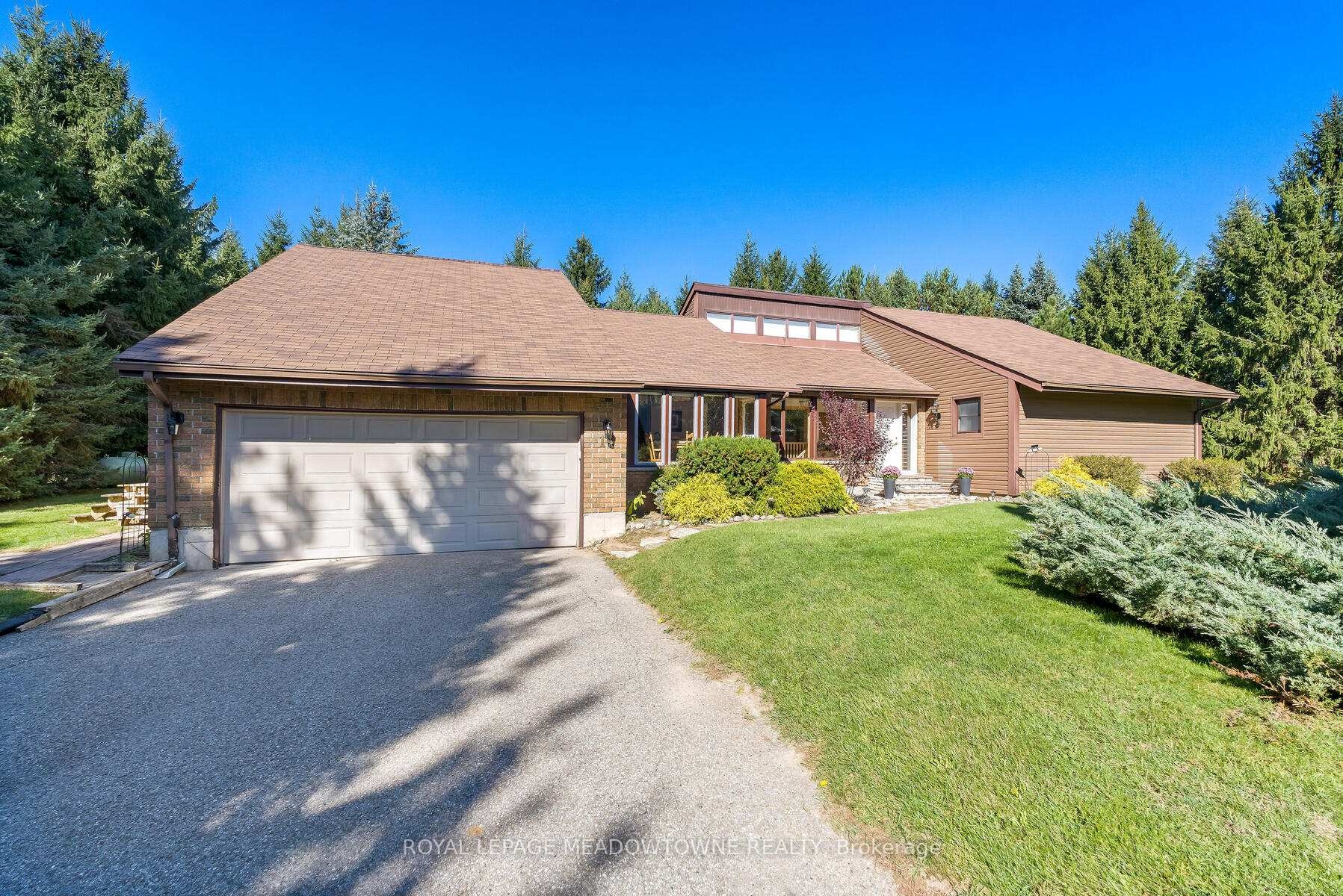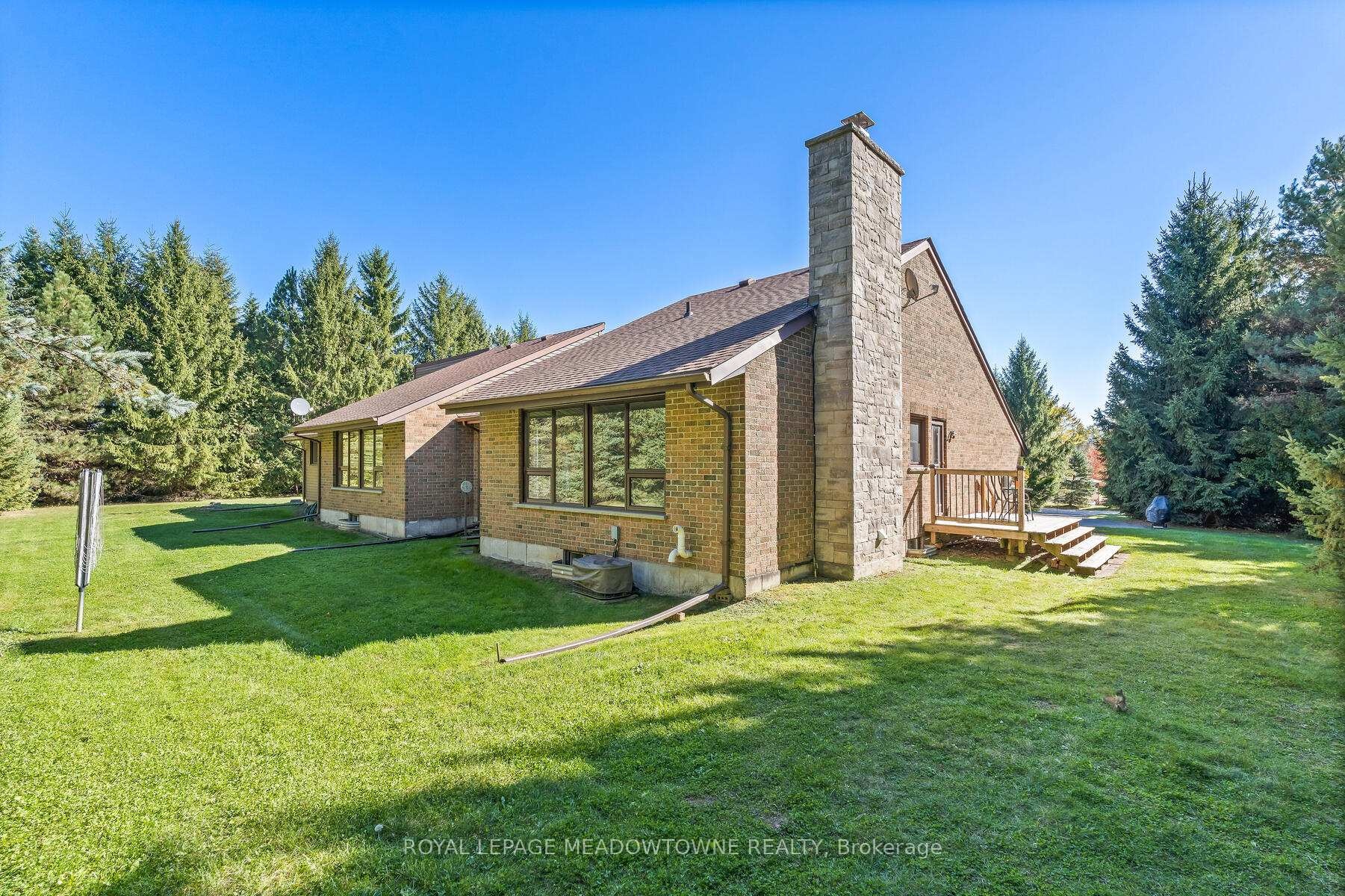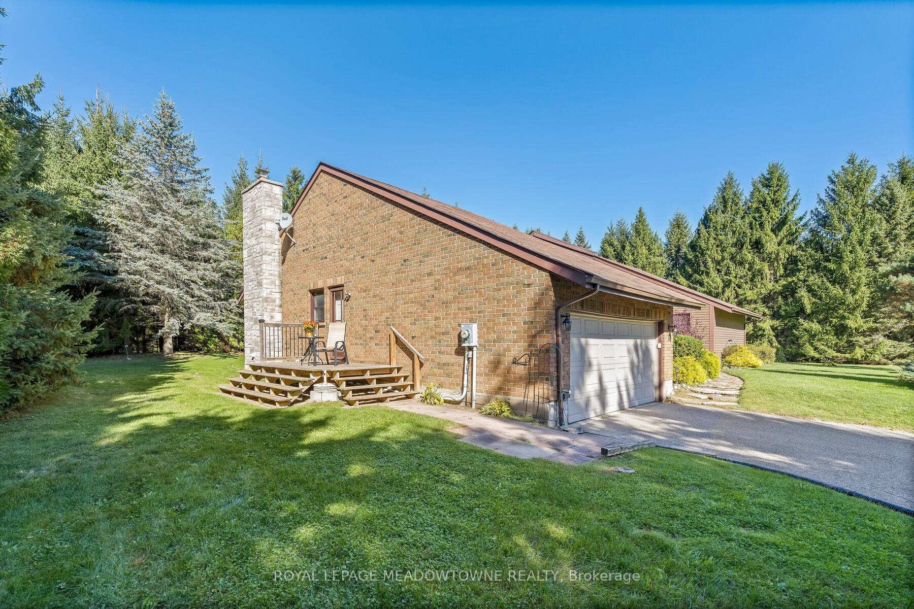 Fabulous bungalow on private 2 acre lot in prime location in Halton Hills. Quiet pocket of custom homes just minutes to Georgetown, Acton, the Limehouse kilns and Bruce trail. Lovingly cared for by original owners. The principal rooms are quite large and all have gorgeous country views. The family room features a wood-burning fireplace and gleaming hardwood floors. Enjoy the sun-filled eat-in kitchen with granite counters and a huge wall-to-wall pantry. The primary suite offers a walkout to the yard plus a 4-pc ensuite and two closets. Main floor laundry with garage and side door entrance. There is a massive lower level that is currently finished as a rec room with loads of room for the large pool table, exercise area and it also features a separate room ideal for a bedroom or storage space. Nature abounds this beautiful property with numerous evergreens and its own little backyard forest with trails. The two-car garage is oversize and there is a super long driveway for all your guests' vehicles and your toys too. Shingles 2018, Furnace rebuilt 2023, many updated windows. Survey available. Enjoy the peace and quiet of the country living just minutes to town.