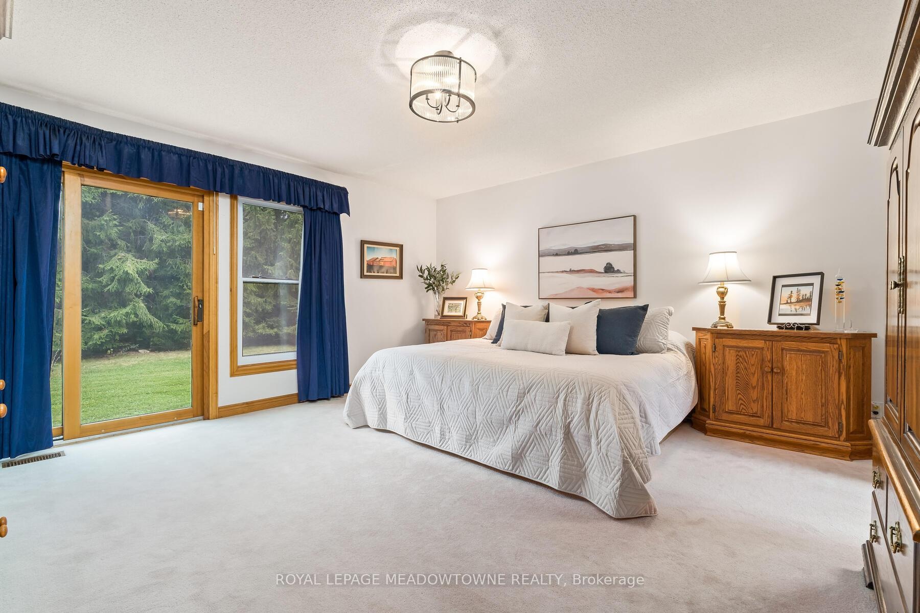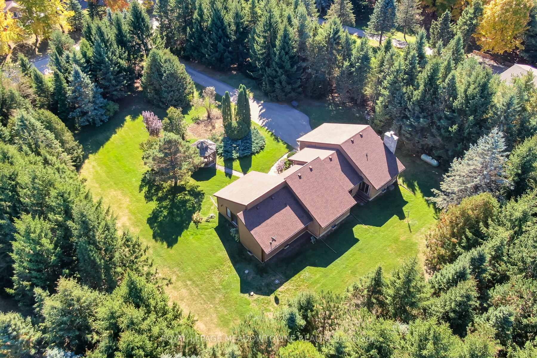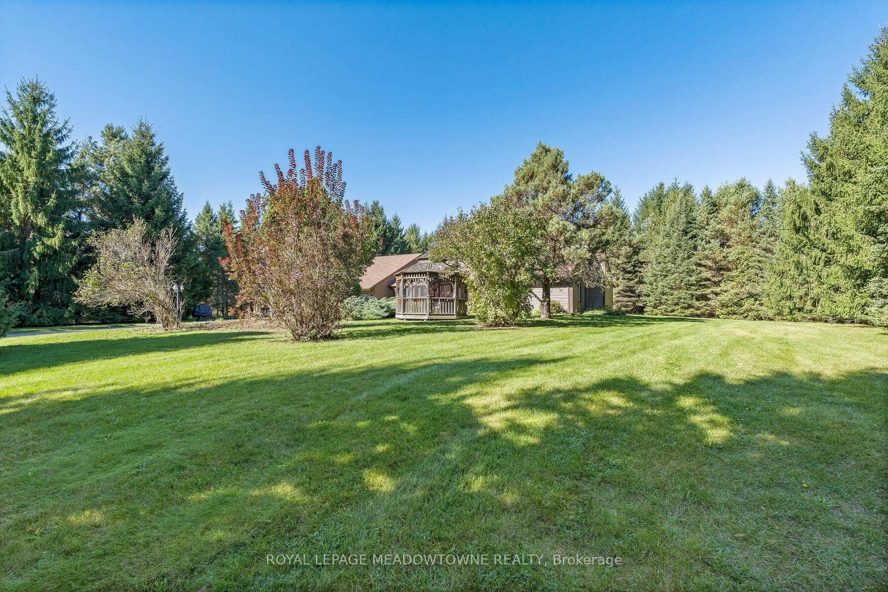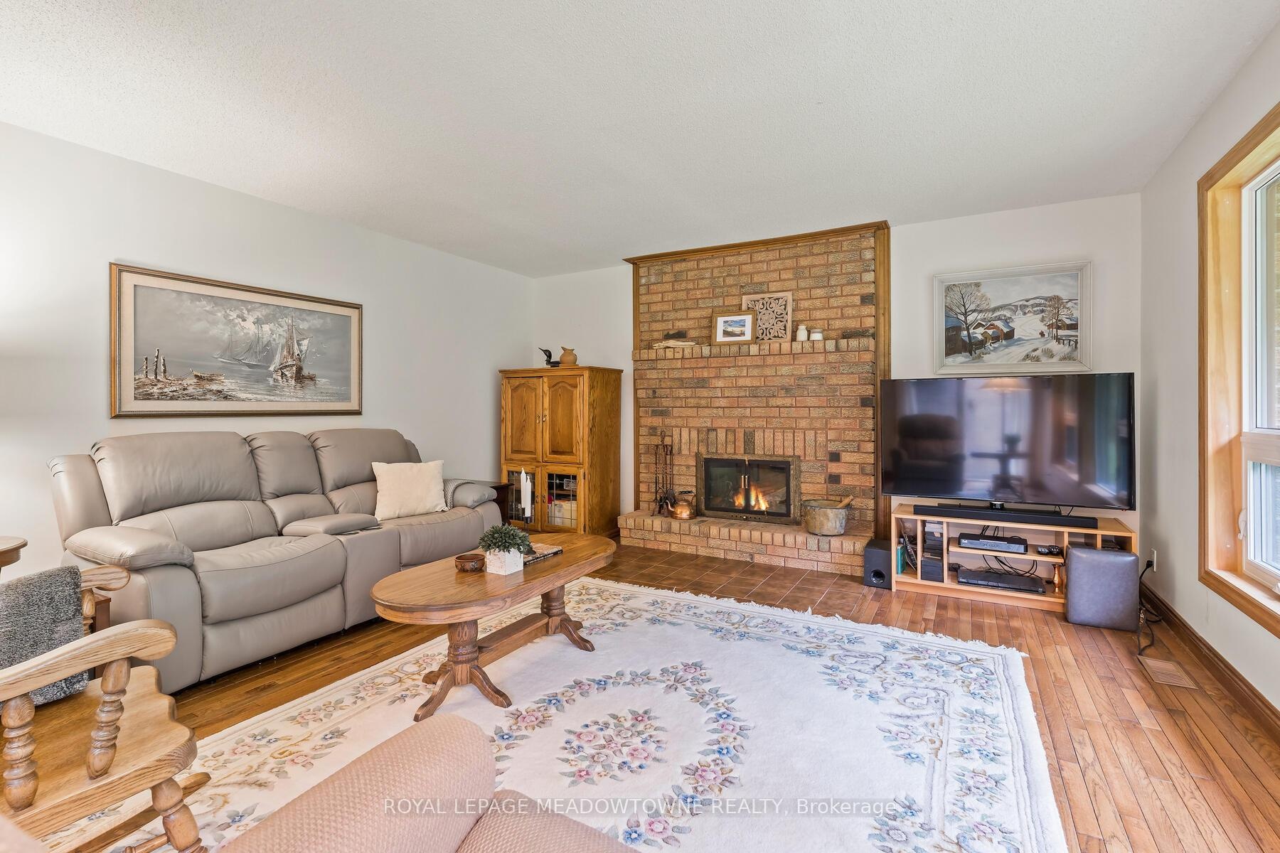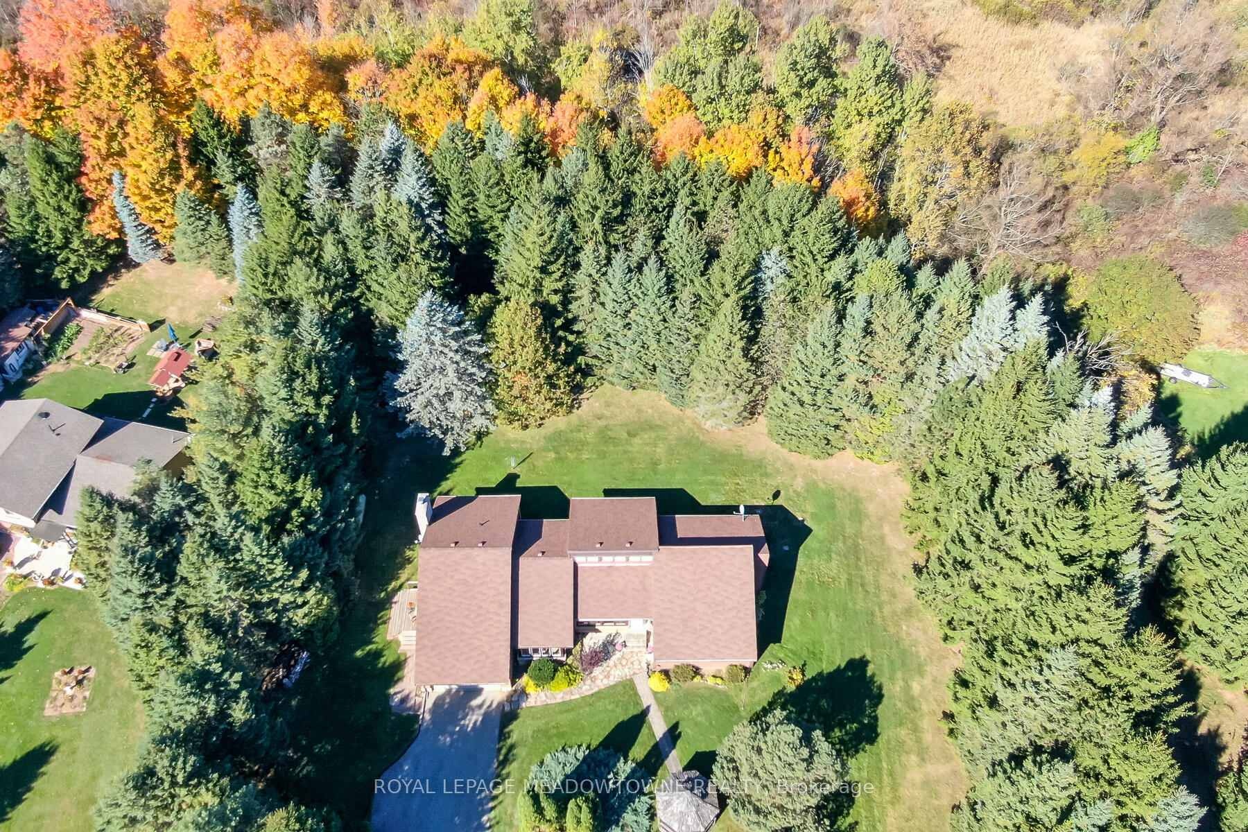 Fabulous bungalow on private 2 acre lot in prime location in Halton Hills. Quiet pocket of custom homes just minutes to Georgetown, Acton, the Limehouse kilns and Bruce trail. Lovingly cared for by original owners. The principal rooms are quite large and all have gorgeous country views. The family room features a wood-burning fireplace and gleaming hardwood floors. Enjoy the sun-filled eat-in kitchen with granite counters and a huge wall-to-wall pantry. The primary suite offers a walkout to the yard plus a 4-pc ensuite and two closets. Main floor laundry with garage and side door entrance. There is a massive lower level that is currently finished as a rec room with loads of room for the large pool table, exercise area and it also features a separate room ideal for a bedroom or storage space. Nature abounds this beautiful property with numerous evergreens and its own little backyard forest with trails. The two-car garage is oversize and there is a super long driveway for all your guests' vehicles and your toys too. Shingles 2018, Furnace rebuilt 2023, many updated windows. Survey available. Enjoy the peace and quiet of the country living just minutes to town.
