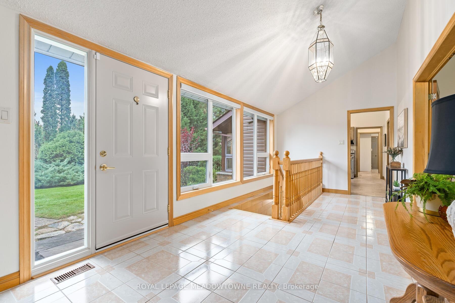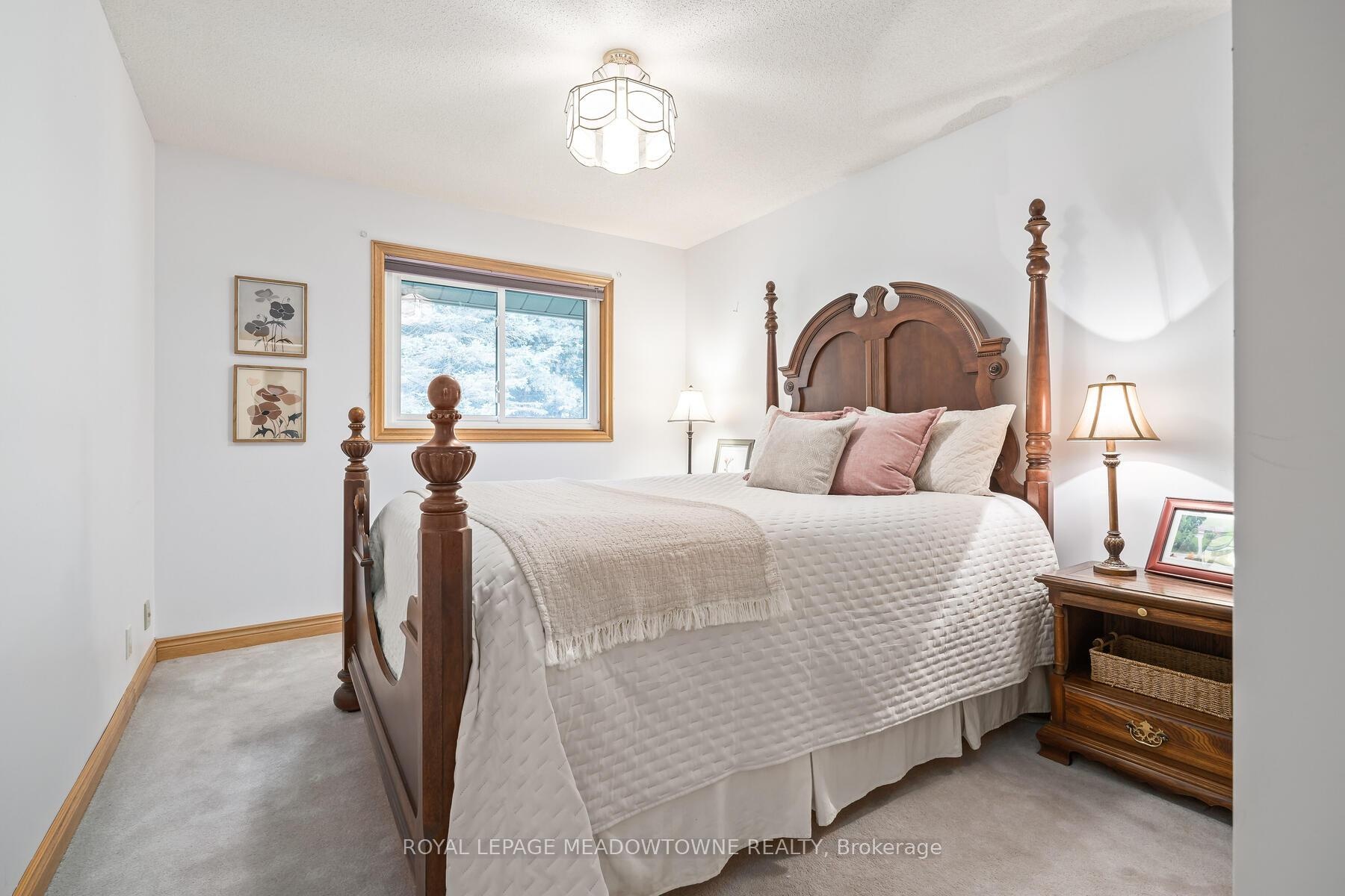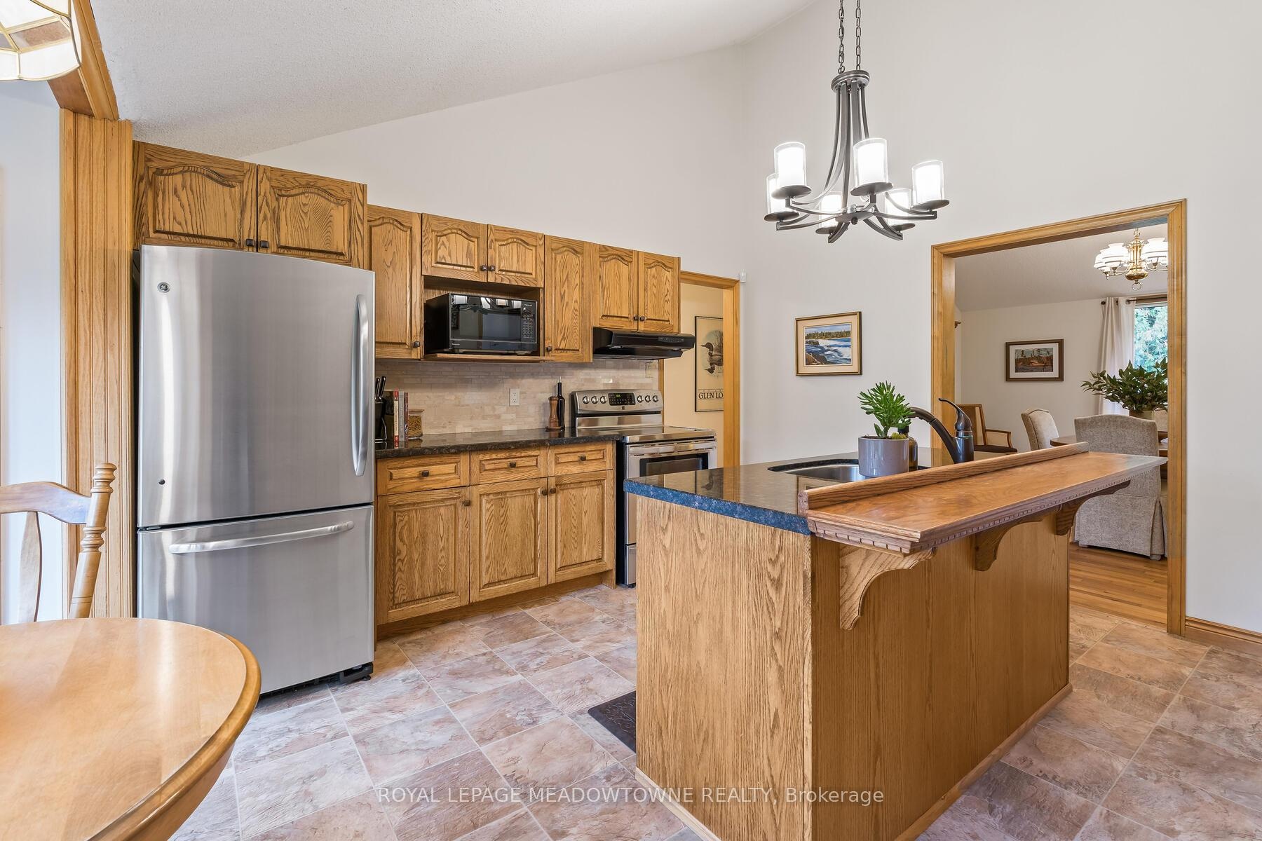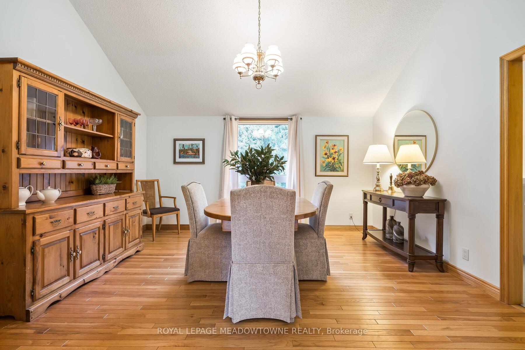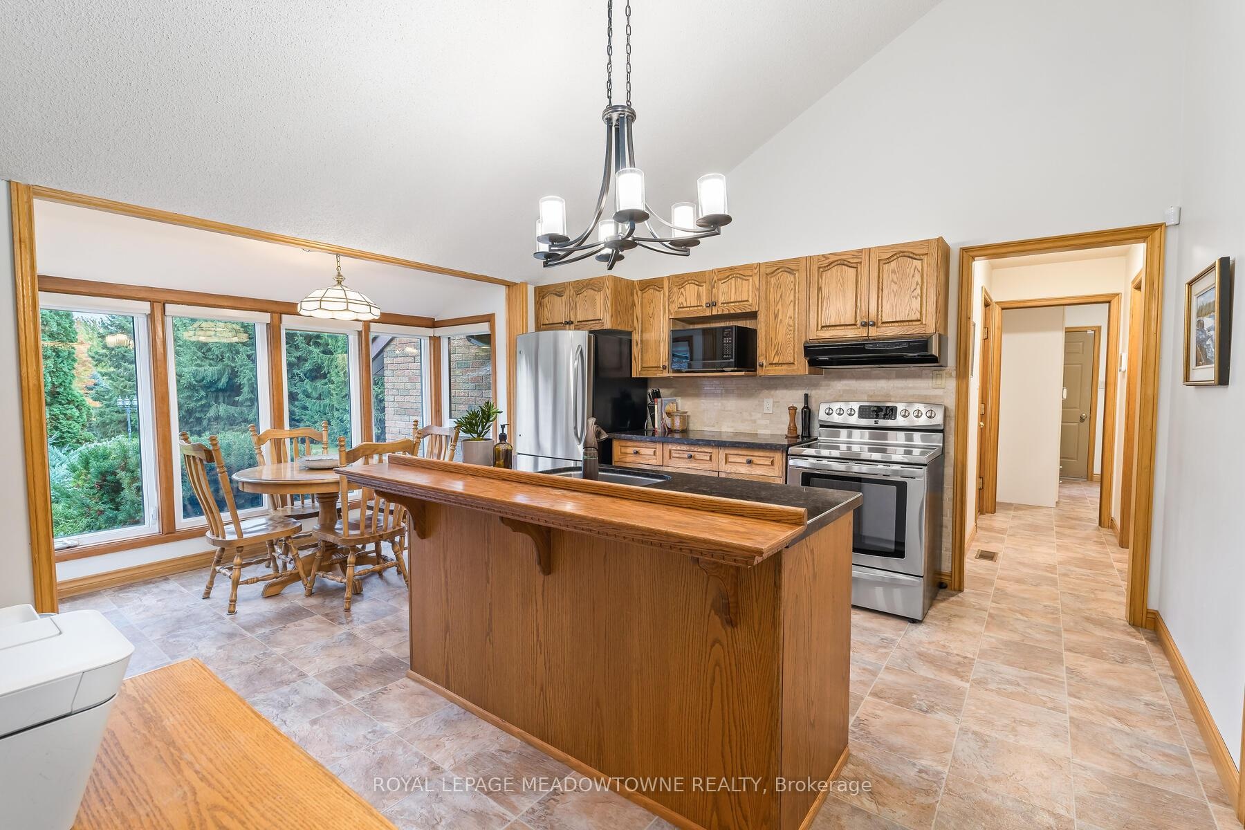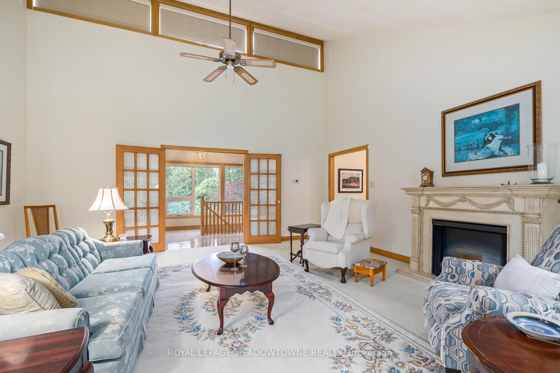 Fabulous bungalow on private 2 acre lot in prime location in Halton Hills. Quiet pocket of custom homes just minutes to Georgetown, Acton, the Limehouse kilns and Bruce trail. Lovingly cared for by original owners. The principal rooms are quite large and all have gorgeous country views. The family room features a wood-burning fireplace and gleaming hardwood floors. Enjoy the sun-filled eat-in kitchen with granite counters and a huge wall-to-wall pantry. The primary suite offers a walkout to the yard plus a 4-pc ensuite and two closets. Main floor laundry with garage and side door entrance. There is a massive lower level that is currently finished as a rec room with loads of room for the large pool table, exercise area and it also features a separate room ideal for a bedroom or storage space. Nature abounds this beautiful property with numerous evergreens and its own little backyard forest with trails. The two-car garage is oversize and there is a super long driveway for all your guests' vehicles and your toys too. Shingles 2018, Furnace rebuilt 2023, many updated windows. Survey available. Enjoy the peace and quiet of the country living just minutes to town.