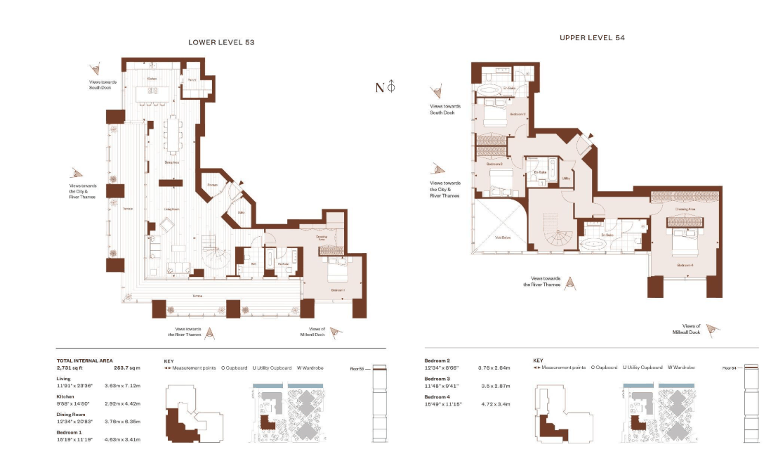 An exceptional four-bedroom, four-bathroom duplex penthouse occupying the 53rd floor of the landmark South Quay Plaza development by Berkeley. Spanning 2,731 sq ft, with a spectacular wraparound terrace, this residence offers some of the most breathtaking views across Canary Wharf, the River Thames and beyond.
