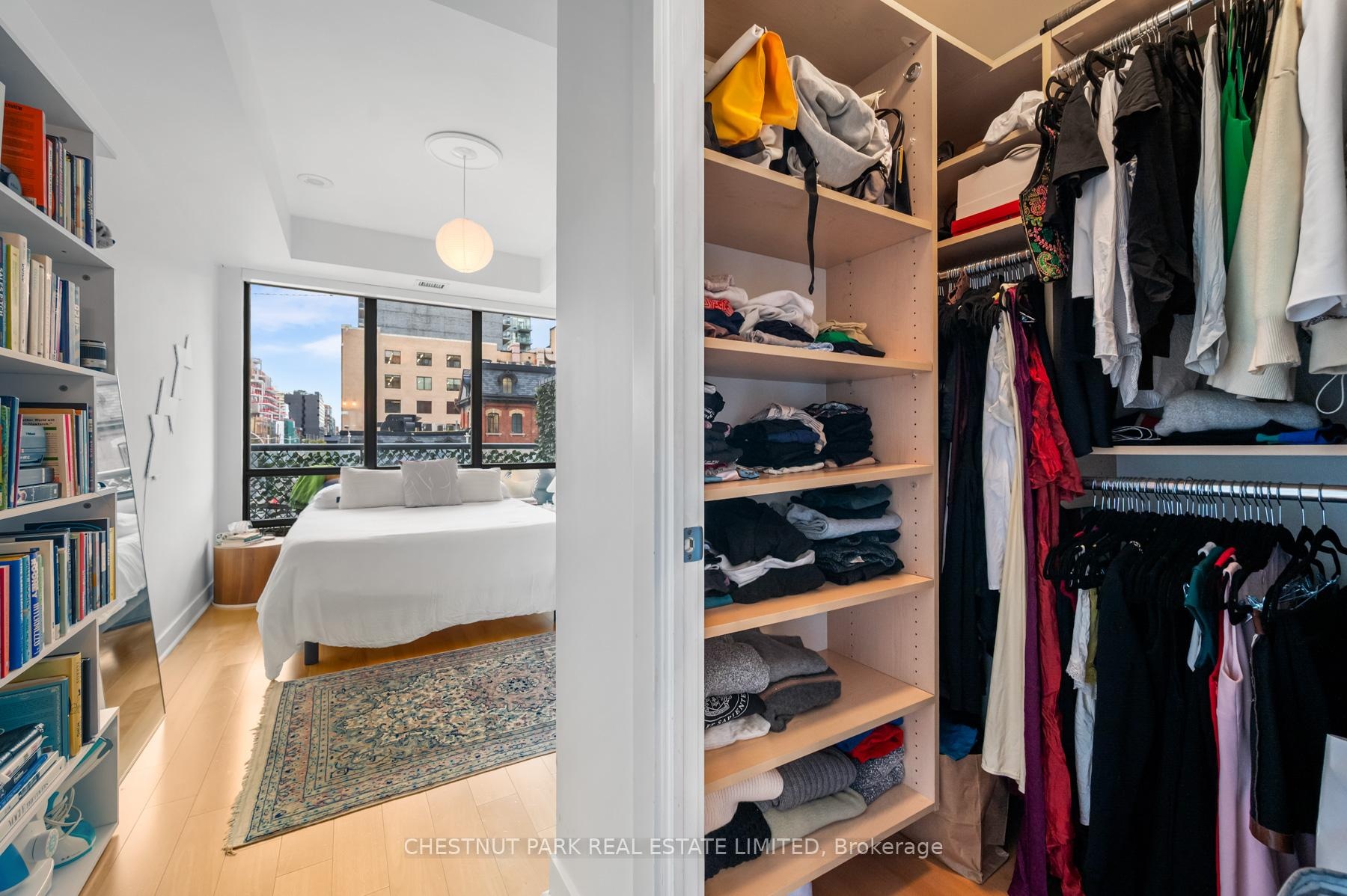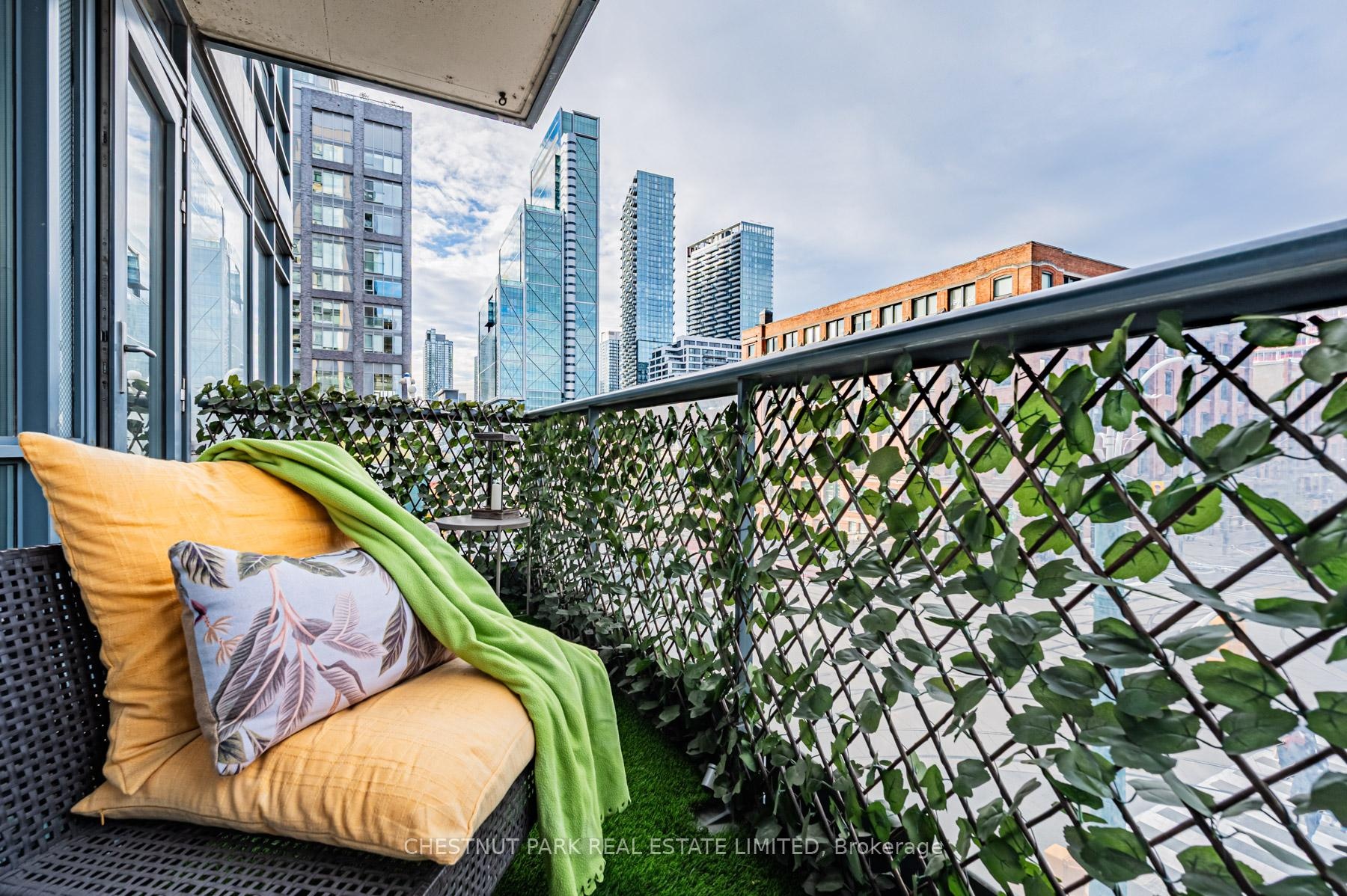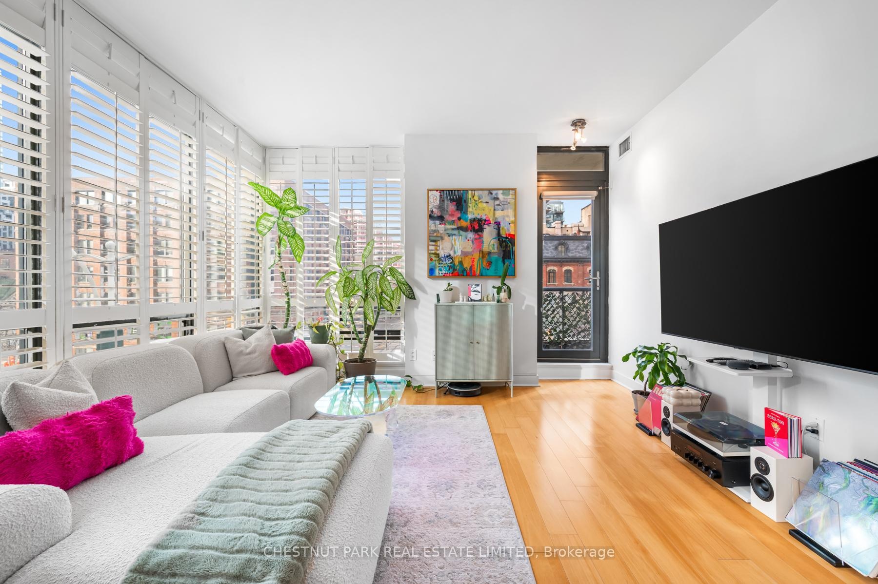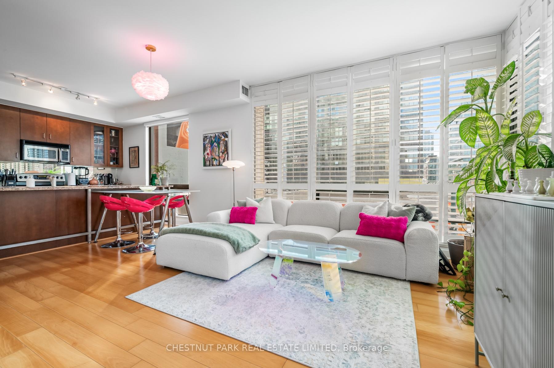 Set within the highly regarded Hudson residences at King & Spadina, this fully furnished corner suite glows with southwest light. Accentuated by smooth hardwood floors and 9' ceilings throughout, the modern layout balances openness with intimacy across 920 sf of recently refreshed space, striking a warm yet elevated tone with generous closet space throughout. The open living and dining area is wrapped by floor-to-ceiling windows and custom California shutters, creating the perfect environment for lush plants and golden-hour ambiance. Flowing naturally into the kitchen, an extended island framed by granite counters and stainless-steel appliances anchors the space - ideal for conversation over morning coffee or impromptu dinners with friends. Step onto your private balcony and watch the city soften in the late-afternoon light - a tranquil vantage point above the rhythm of King St.