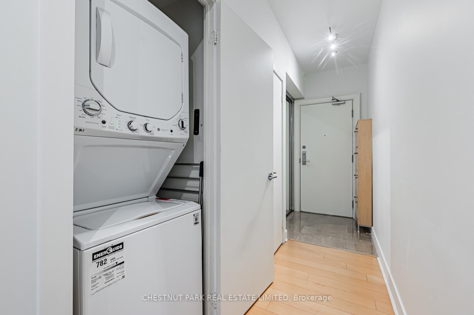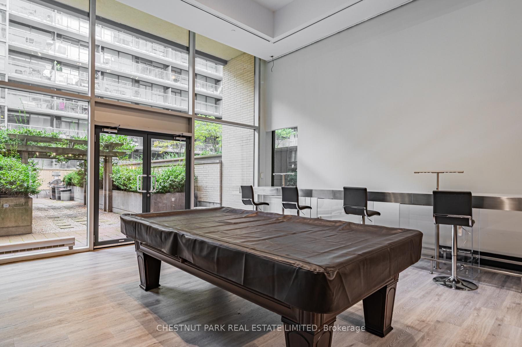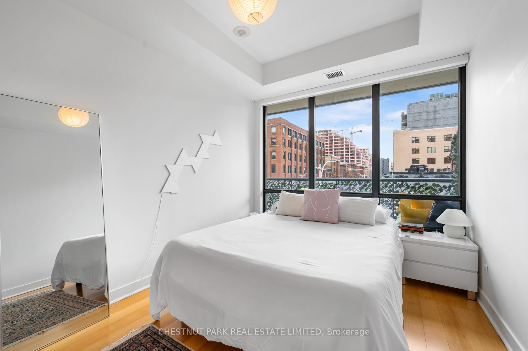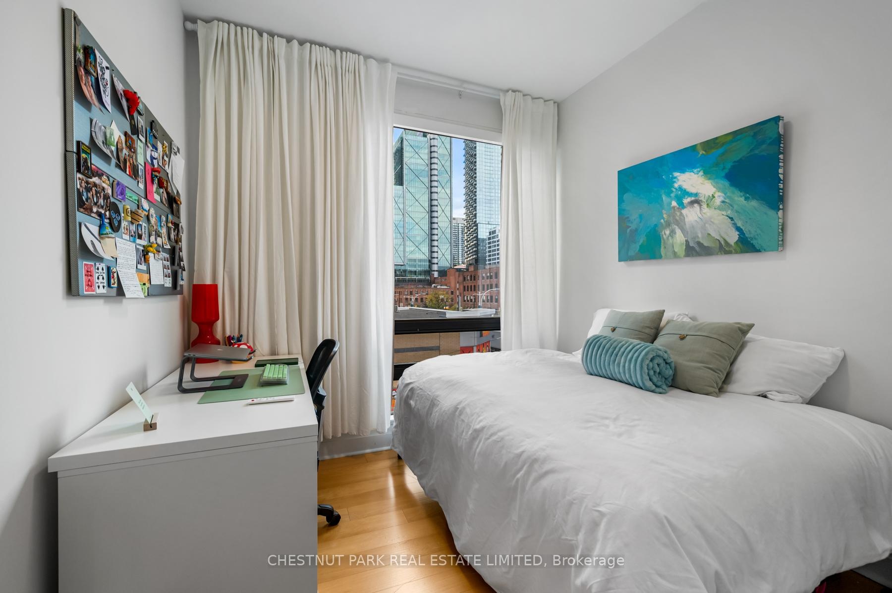 Set within the highly regarded Hudson residences at King & Spadina, this fully furnished corner suite glows with southwest light. Accentuated by smooth hardwood floors and 9' ceilings throughout, the modern layout balances openness with intimacy across 920 sf of recently refreshed space, striking a warm yet elevated tone with generous closet space throughout. The open living and dining area is wrapped by floor-to-ceiling windows and custom California shutters, creating the perfect environment for lush plants and golden-hour ambiance. Flowing naturally into the kitchen, an extended island framed by granite counters and stainless-steel appliances anchors the space - ideal for conversation over morning coffee or impromptu dinners with friends. Step onto your private balcony and watch the city soften in the late-afternoon light - a tranquil vantage point above the rhythm of King St.