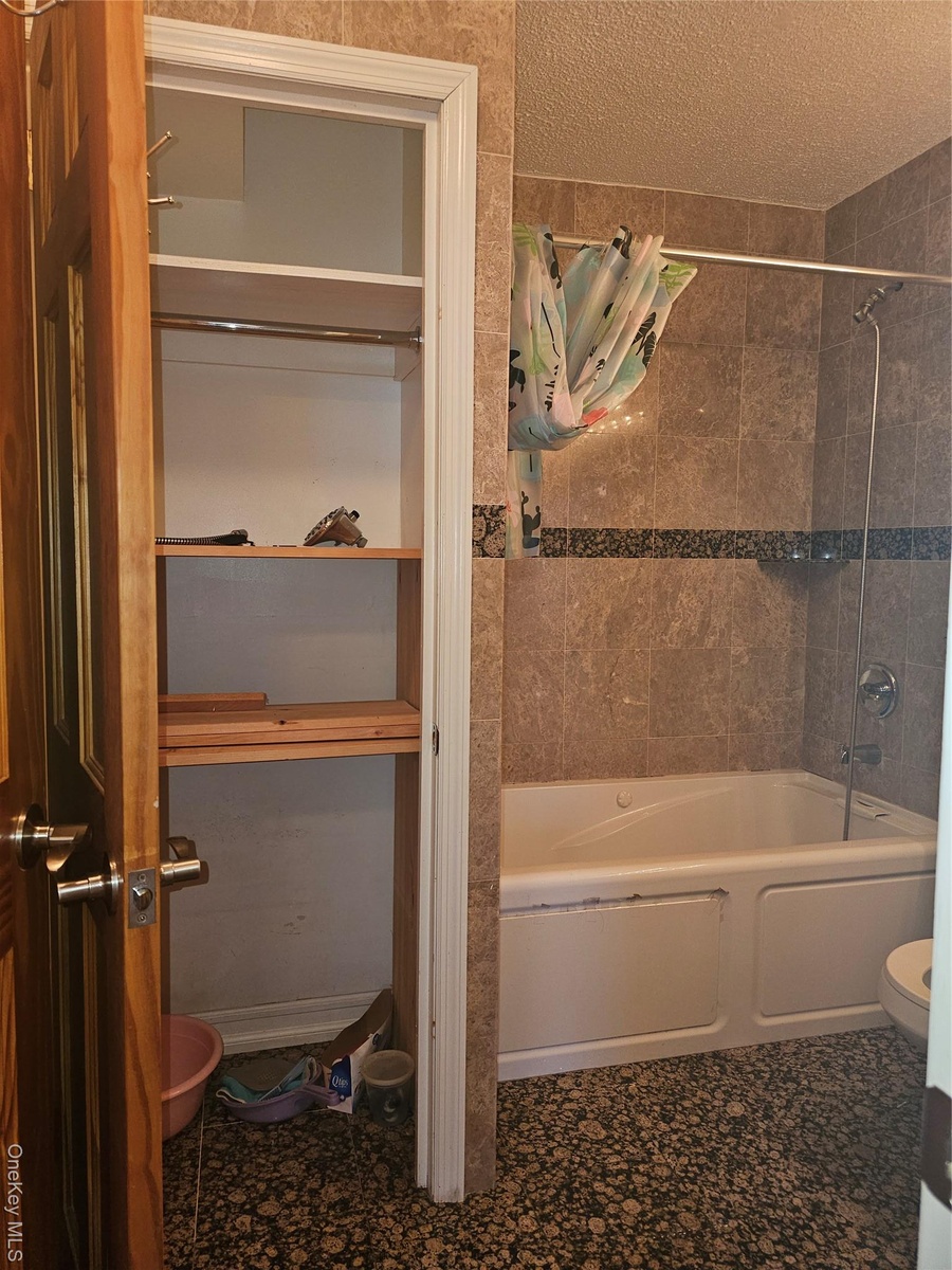 - Bathroom featuring shower combination, a textured ceiling, and a closet