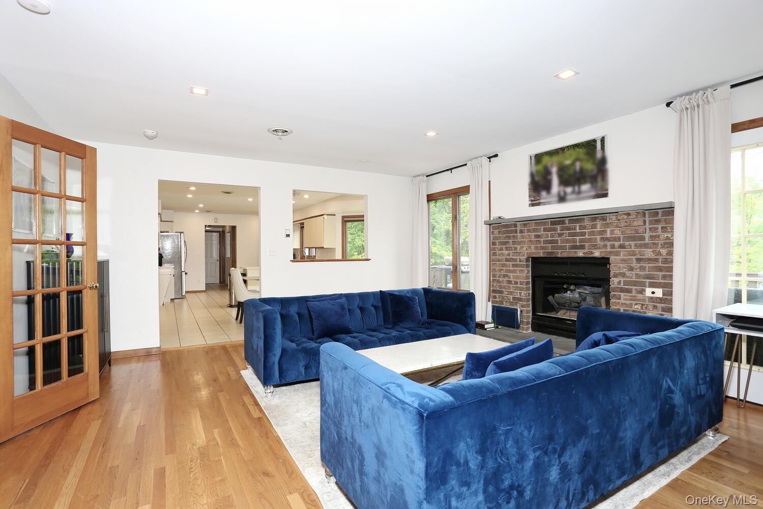 - Living area with light wood finished floors, a fireplace, and recessed lighting