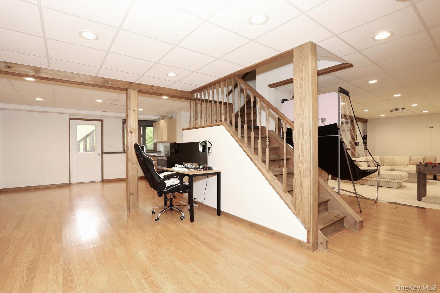 - Office space with a drop ceiling, wood finished floors, and recessed lighting
