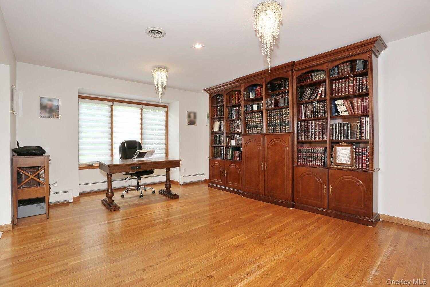 - Office featuring light wood-style flooring, a baseboard heating unit, and a chandelier