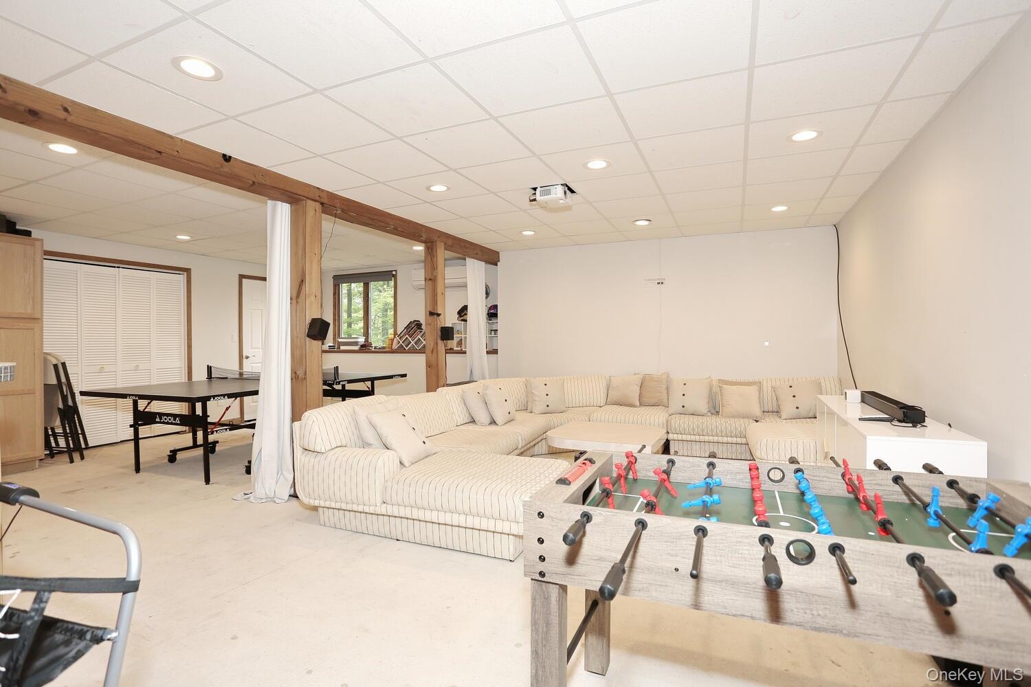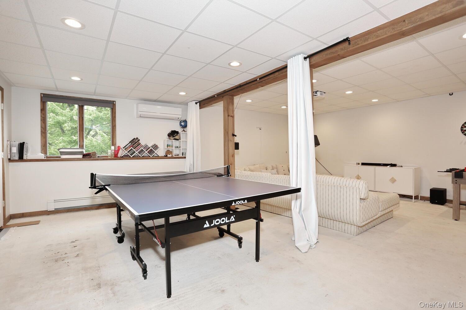 - Game room featuring a drop ceiling, recessed lighting, baseboard heating, and a wall mounted AC