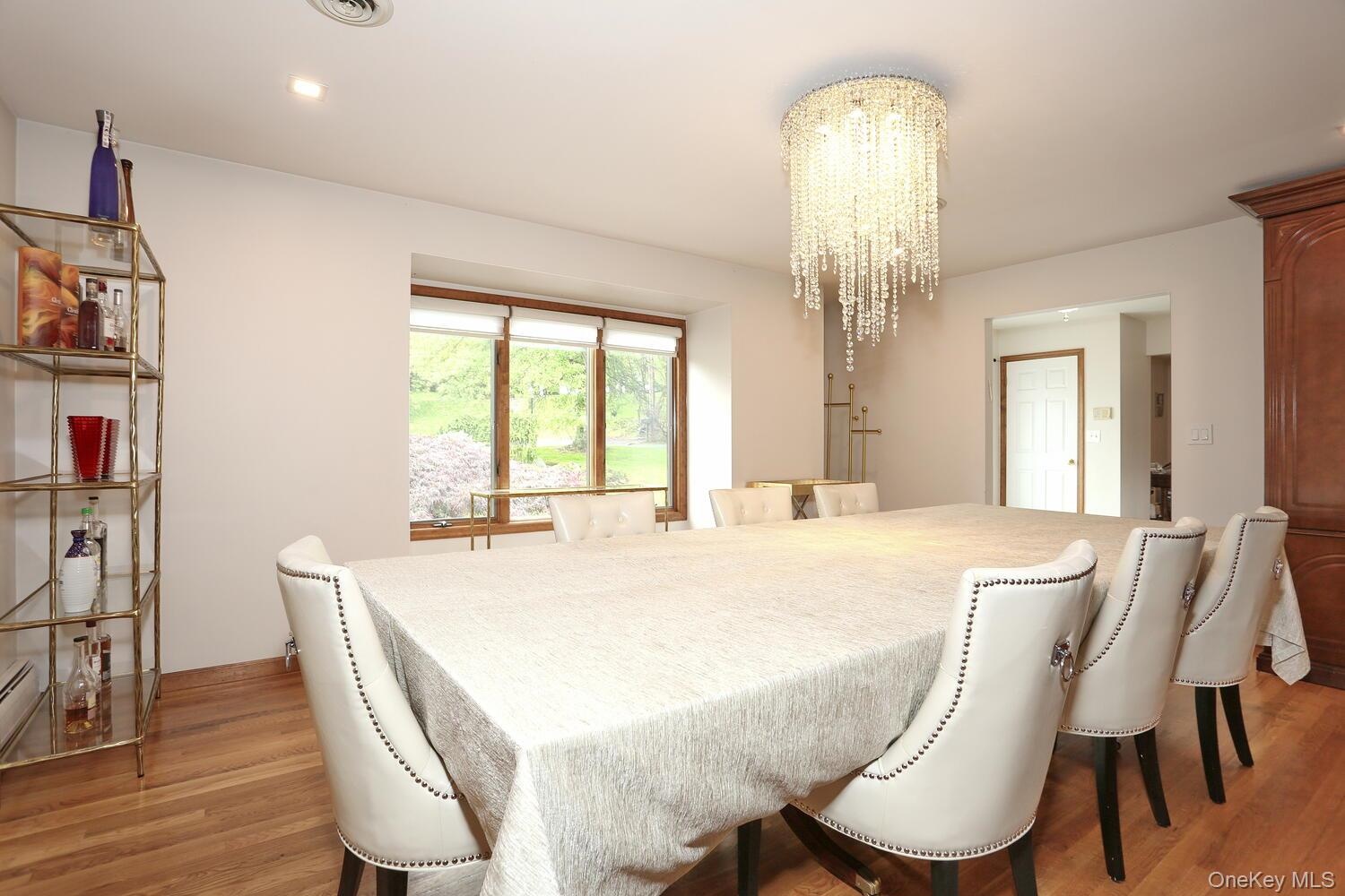 - Dining area with light wood-style flooring, a chandelier, and recessed lighting