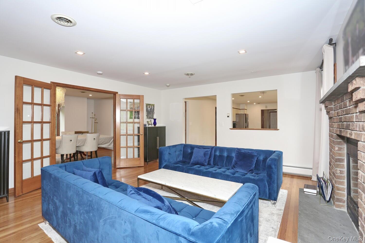 - Living room with a fireplace, wood finished floors, recessed lighting, french doors, and a baseboard heating unit