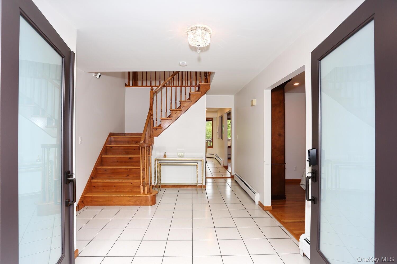 - Foyer entrance with light tile patterned flooring, a baseboard radiator, french doors, and recessed lighting