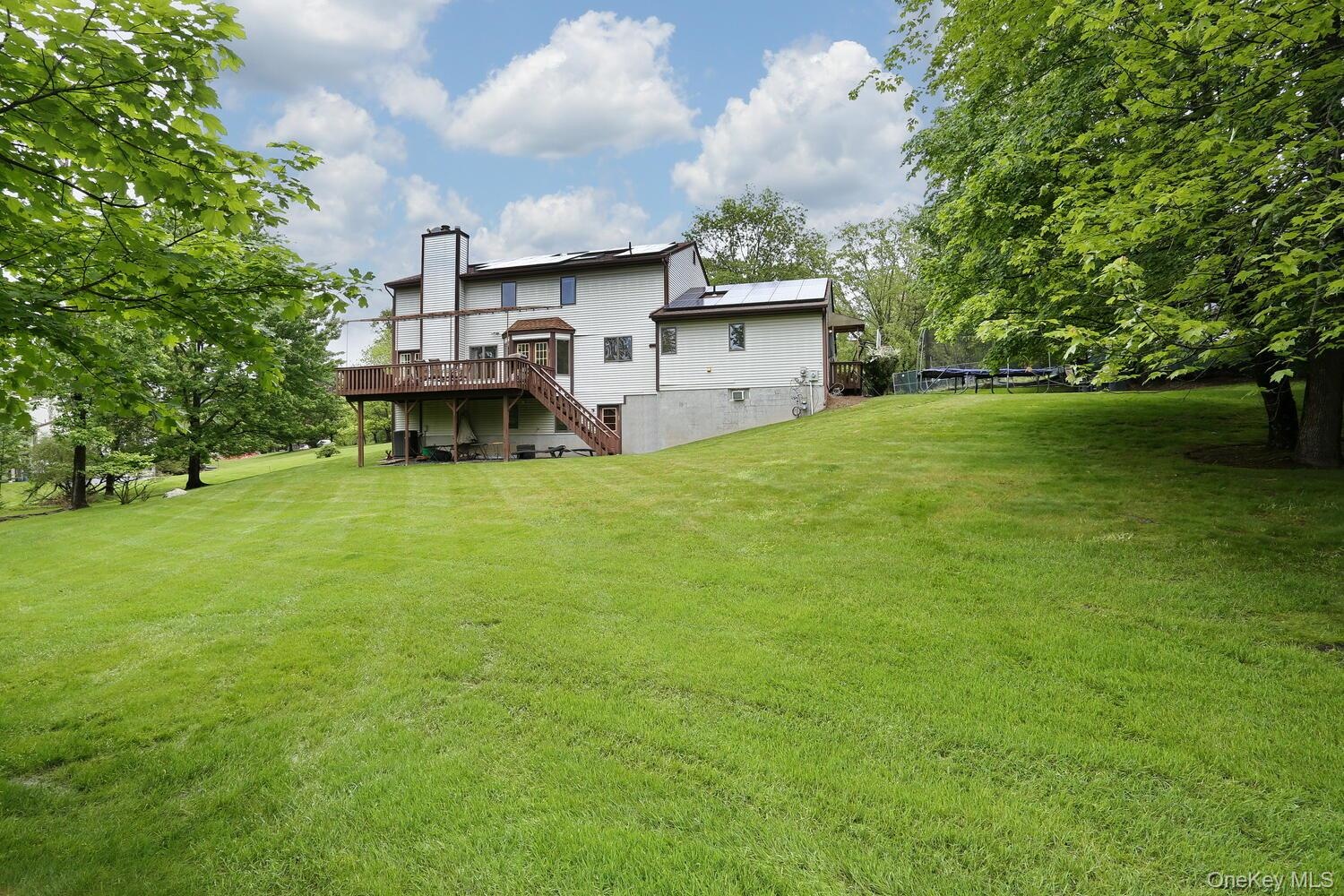 - View of green lawn with a deck, a patio, and stairs