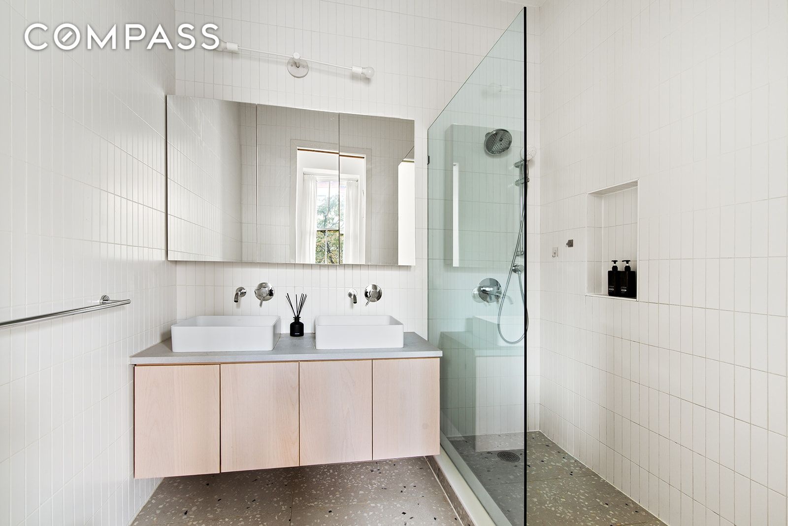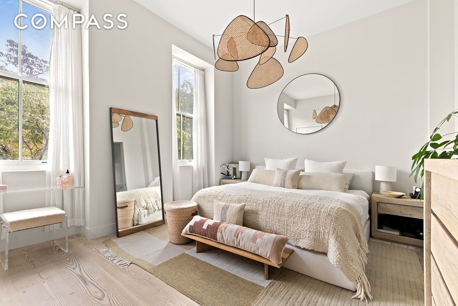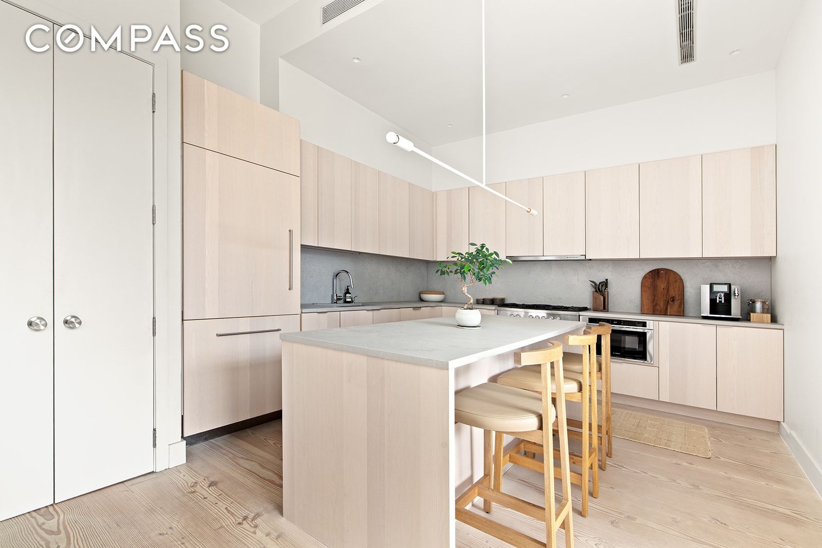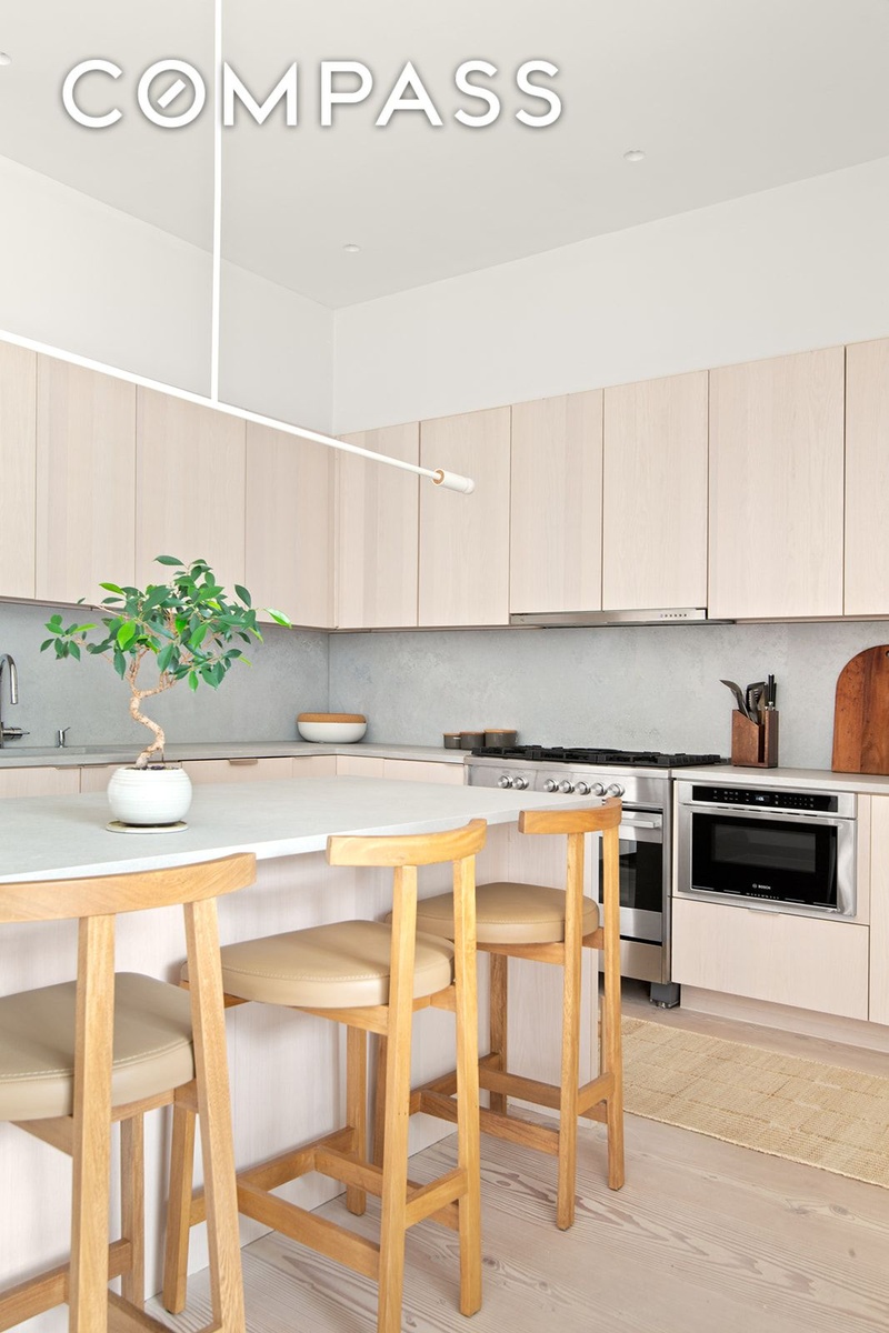 The chef’s kitchen is both stylish and functional, with an oversized island boasting both room for seating and storage. Fisher & Paykel appliances — including a 36-inch built-in refrigerator, gas range, and fully integrated dishwasher, are complemented by a Bosch microwave drawer, XO range hood and Caesarstone “Airy Concrete” countertops. Custom ash cabinetry and Dinesen Douglas solid plank flooring elevate the space with Scandinavian-inspired warmth and craftsmanship.