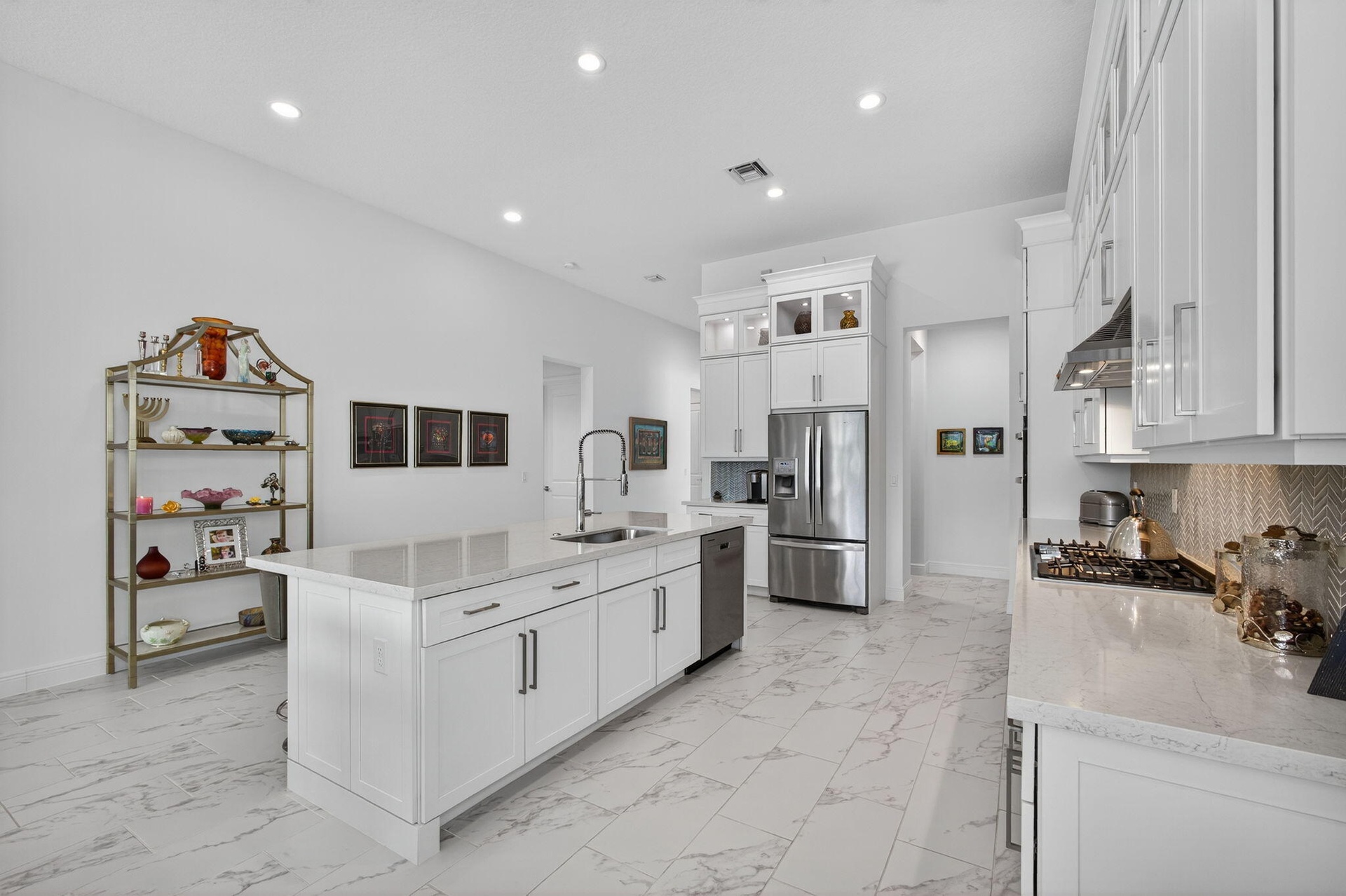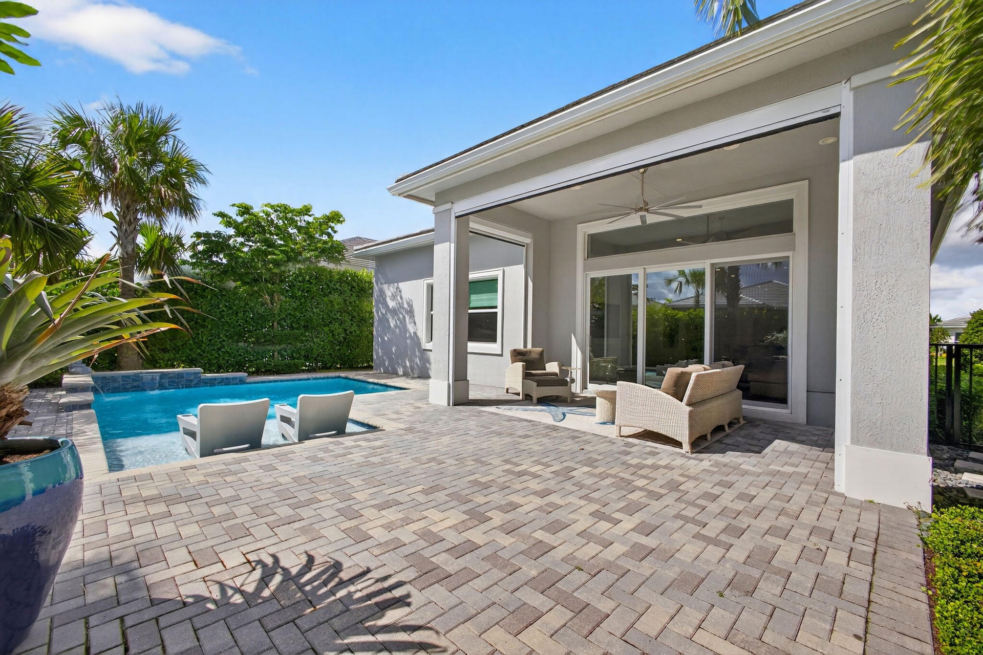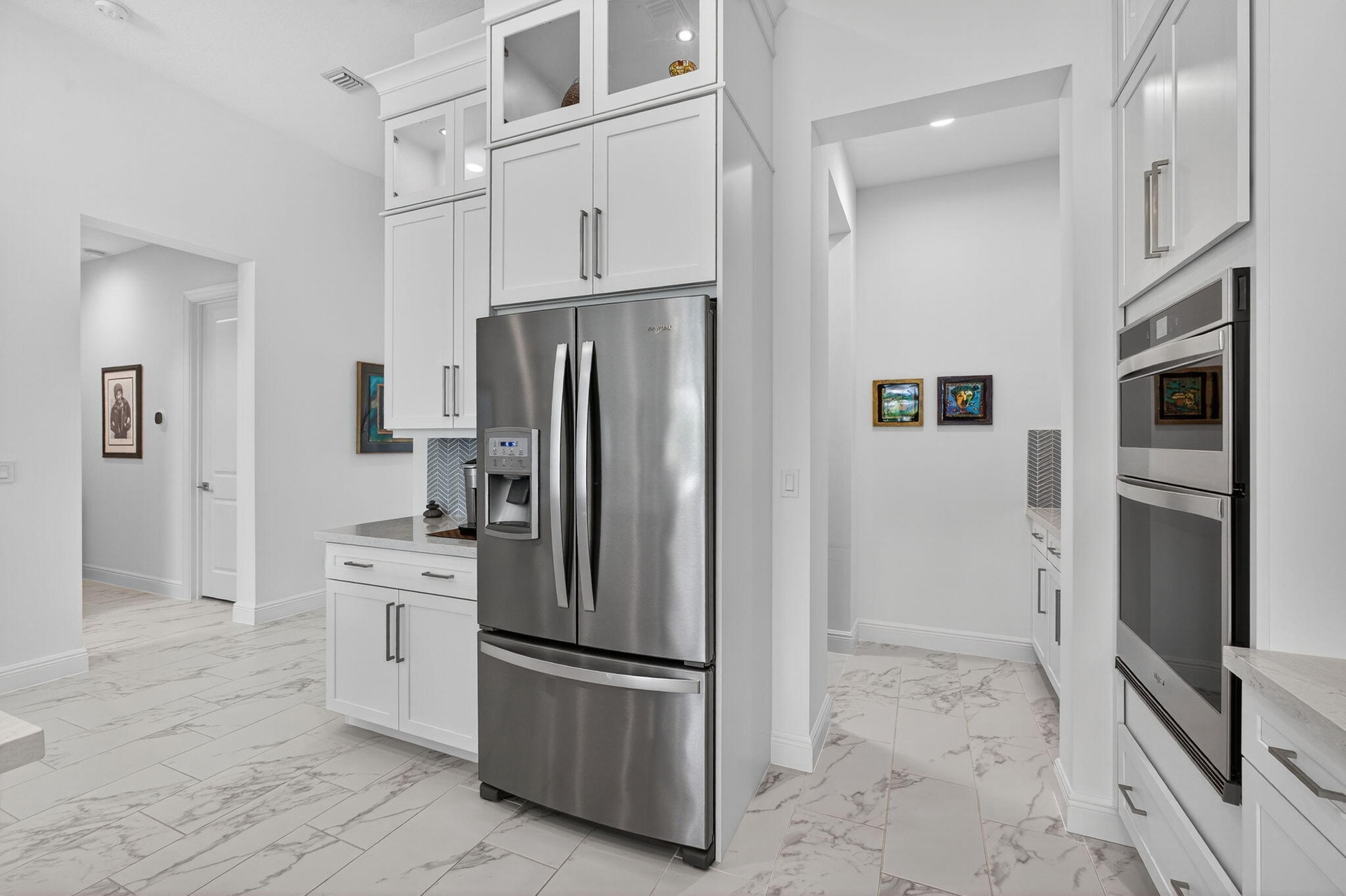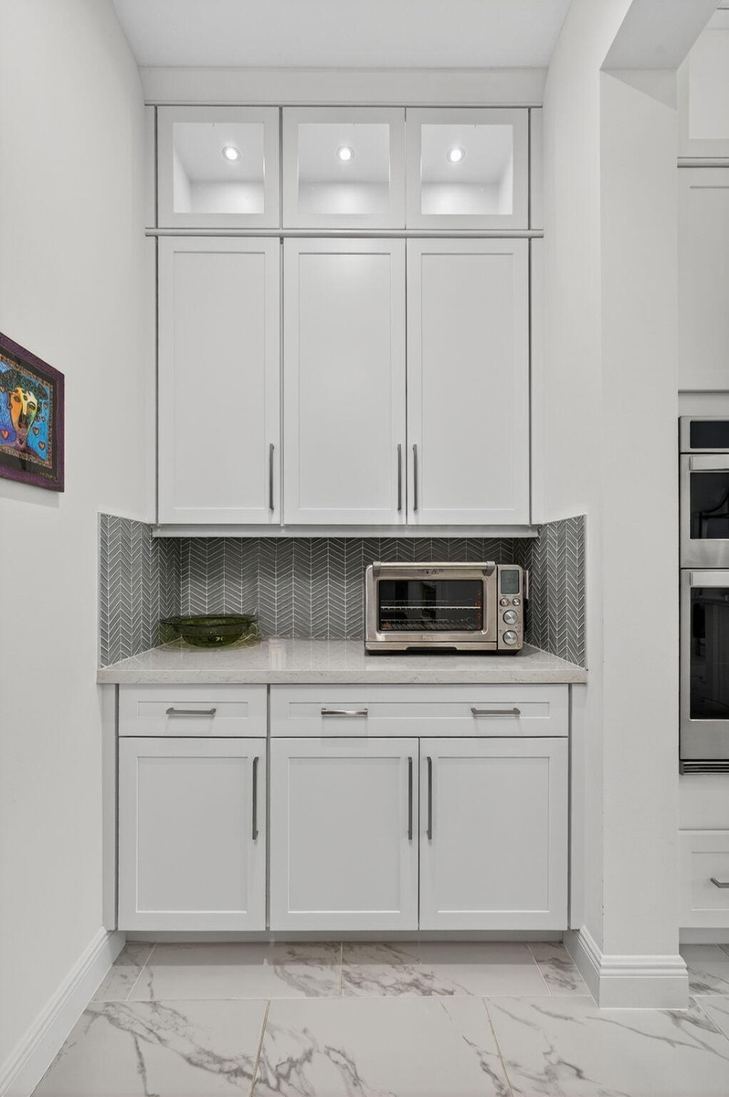 Welcome to the extended McKenna, a beautifully designed Coastal home that captures the relaxed elegance of Florida living. The stone-accented exterior and bright, open floor plan set a welcoming tone from the moment you arrive. Inside, the expanded gourmet kitchen is both stylish and functional, featuring quartz countertops, a larger island, a walk-in pantry, and an added row of lighted glass-front cabinets. Designer lighting, Minka Aire ceiling fans, and upgraded recessed fixtures throughout the home create a soft, inviting atmosphere. Custom touches continue with Closets by Design organization systems in the pantry, primary suite, and storage areas, along with a Toto bidet in the primary bath and Hunter Douglas Pirouette window treatments, many with remote controls for effortless