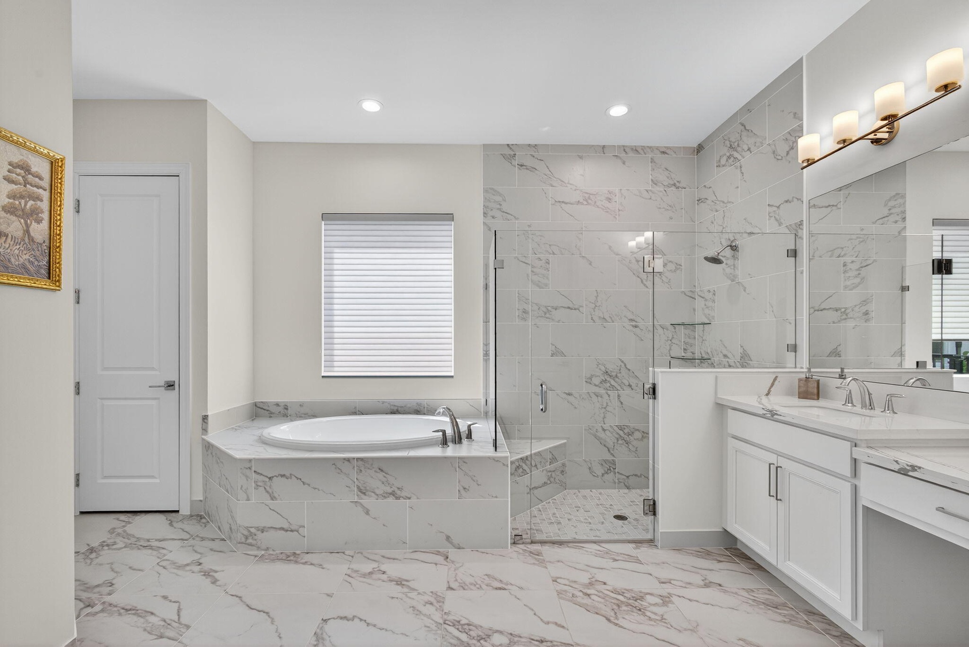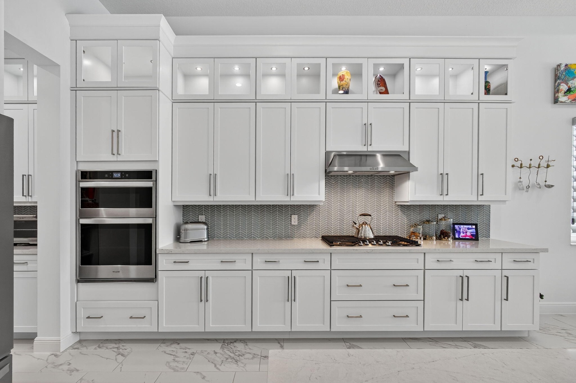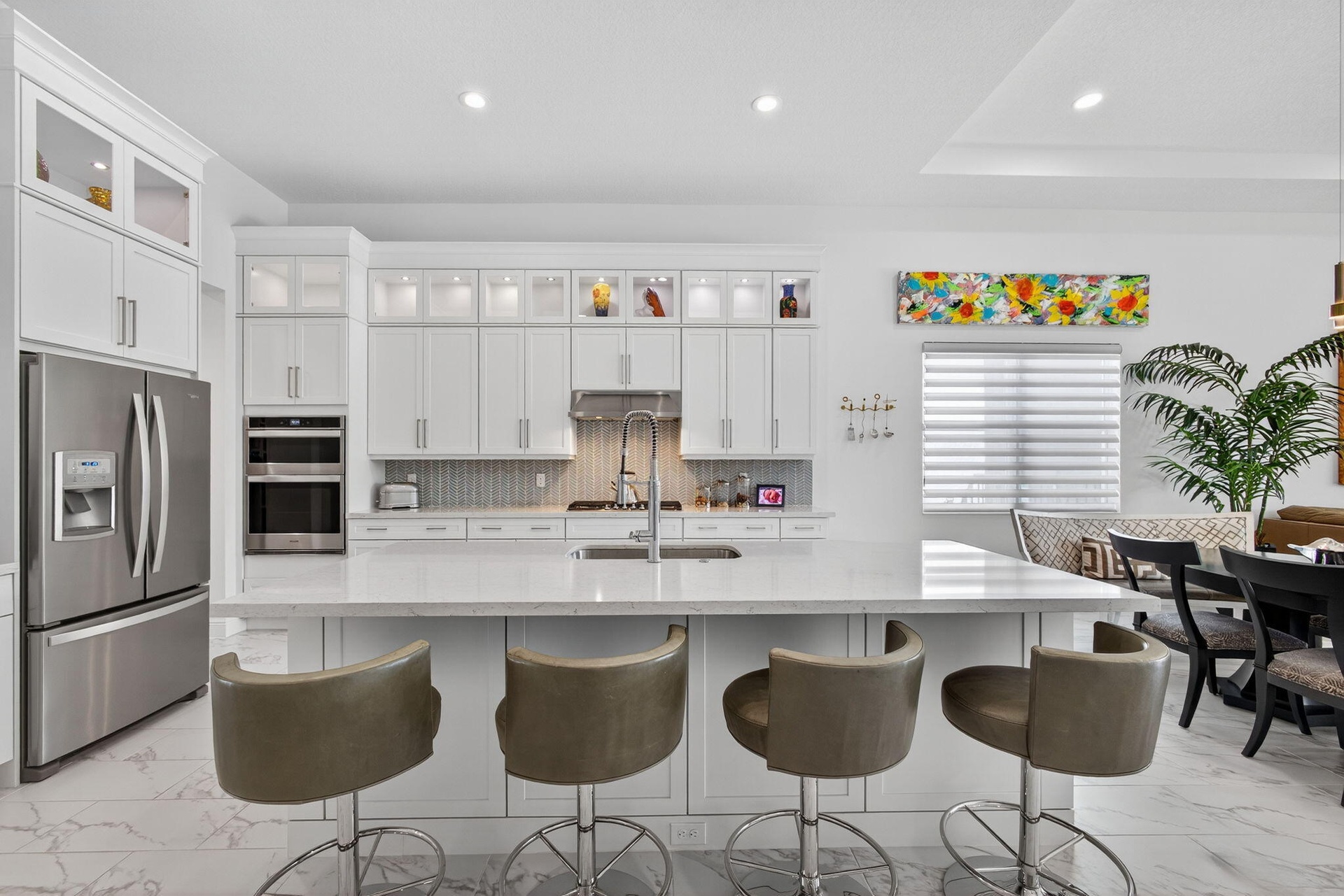 Welcome to the extended McKenna, a beautifully designed Coastal home that captures the relaxed elegance of Florida living. The stone-accented exterior and bright, open floor plan set a welcoming tone from the moment you arrive. Inside, the expanded gourmet kitchen is both stylish and functional, featuring quartz countertops, a larger island, a walk-in pantry, and an added row of lighted glass-front cabinets. Designer lighting, Minka Aire ceiling fans, and upgraded recessed fixtures throughout the home create a soft, inviting atmosphere. Custom touches continue with Closets by Design organization systems in the pantry, primary suite, and storage areas, along with a Toto bidet in the primary bath and Hunter Douglas Pirouette window treatments, many with remote controls for effortless
