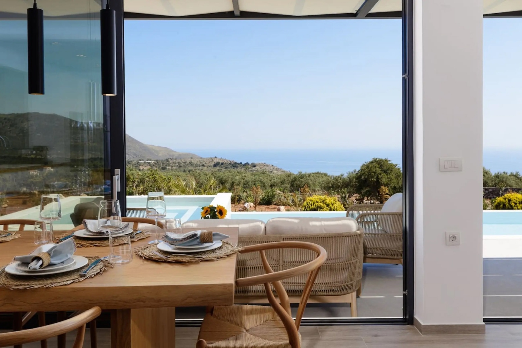 The outdoor area is show-stopping: a large infinity pool merges seamlessly with the horizon, paired with a jacuzzi and sunbathing/terrace areas to enjoy every moment of the day.