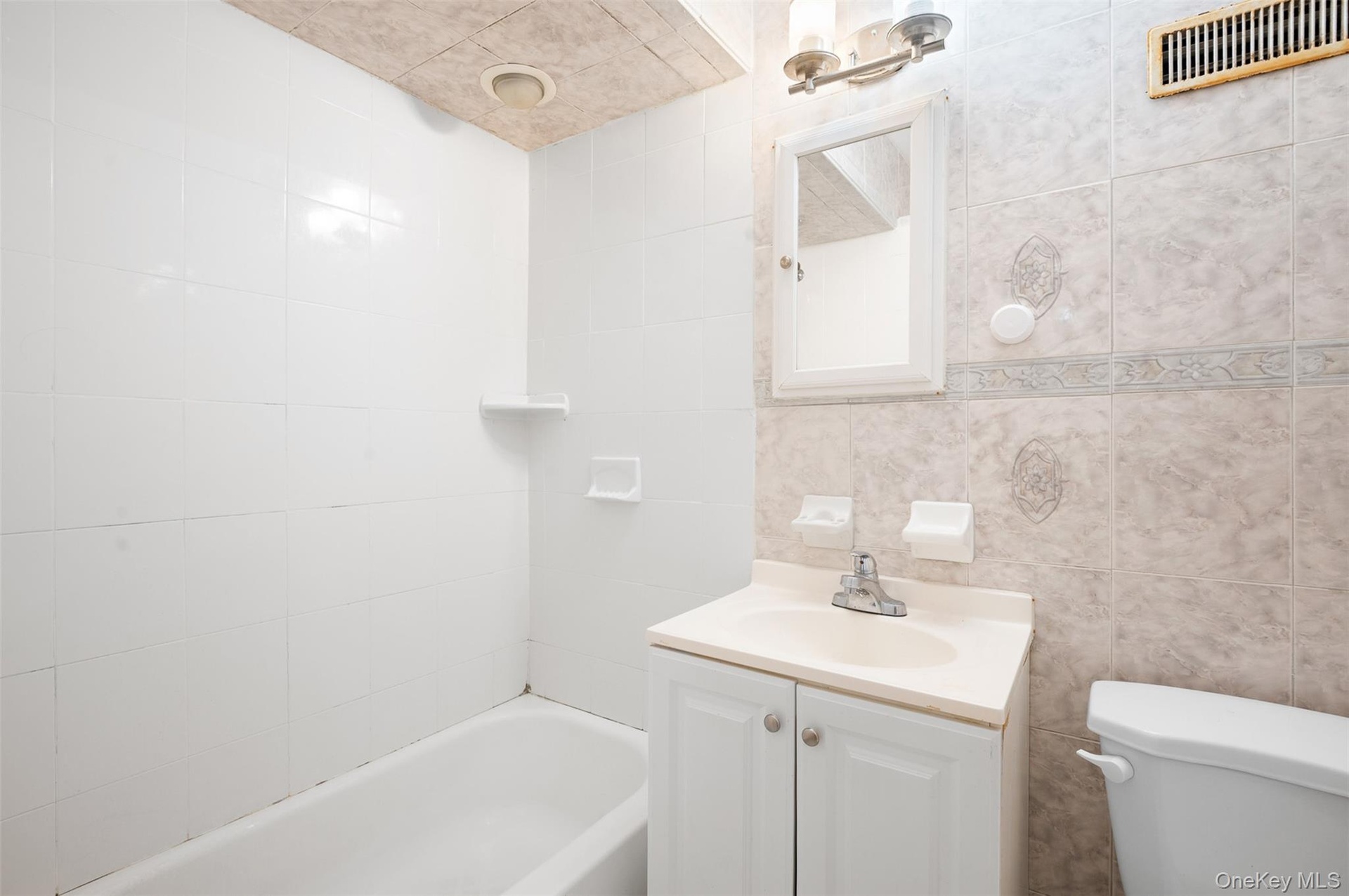 - Bathroom featuring vanity, tile walls, and shower / washtub combination