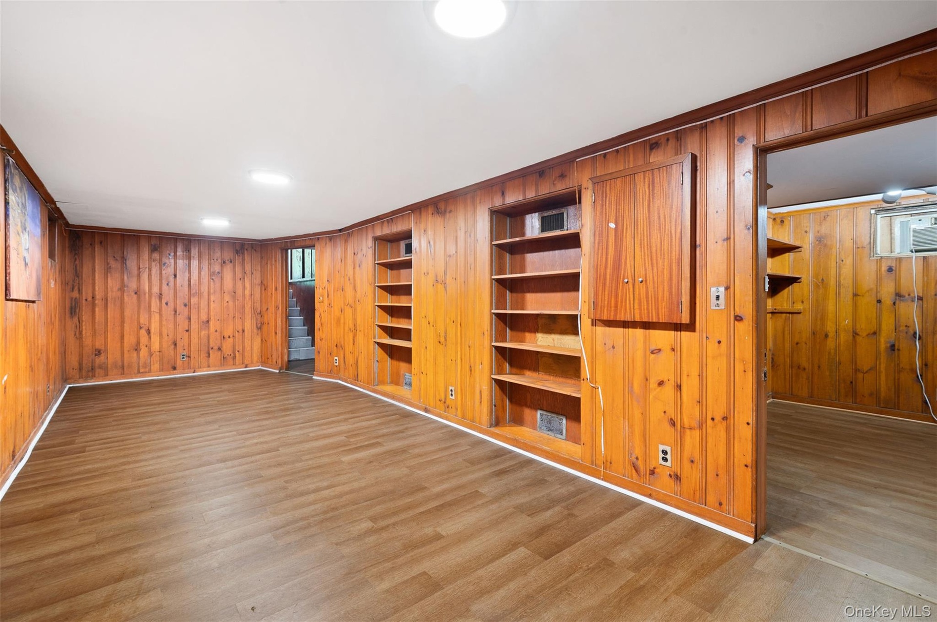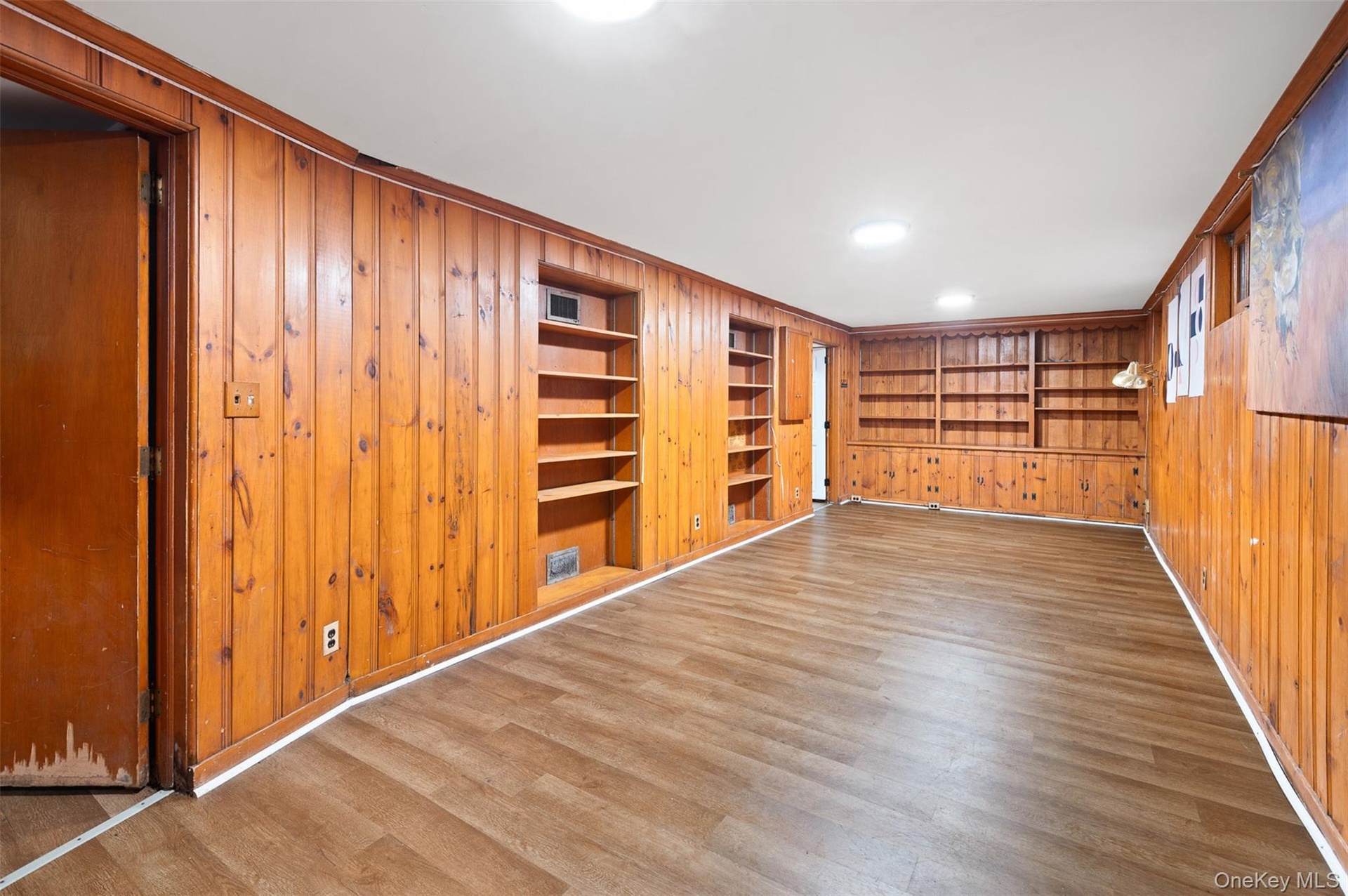 - Unfurnished room with wood walls, wood finished floors, and built in features