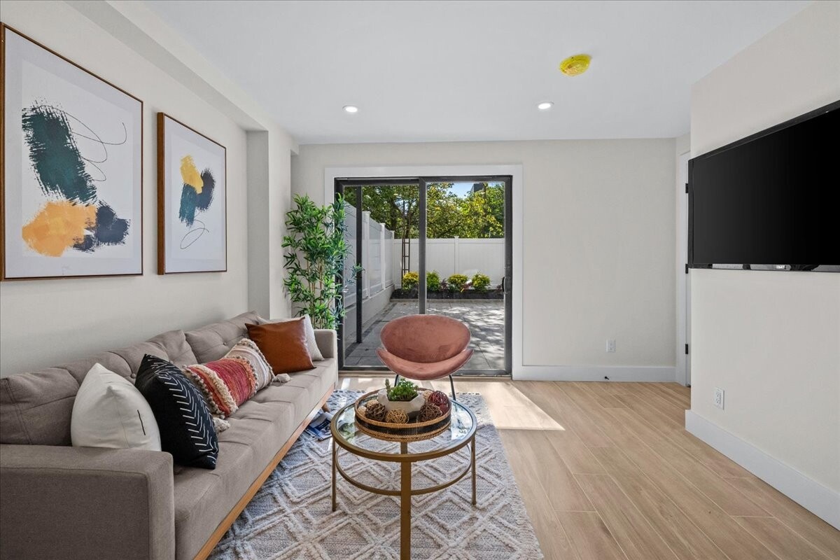 The private backyard of the owner's triplex is accessible through an internal staircase. This space is ideal location for summer afternoon barbecues. The private basement, accessible via an interior staircase, features tile floors and a powder room. It can be easily transformed into a playroom, media den, or artist studio. The separate garden floor studio unit can serve as an income-generating property or an in-law apartment.