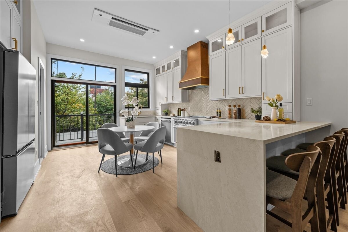 Upon entering the parlor of the owner's triplex, you are greeted by 12' high ceilings and expansive open layout. The chef's kitchen boasts a waterfall island, custom cabinetry, quartz countertops and a comprehensive range of high-end appliances. Beyond the kitchen is a charming balcony that complements the parlor floor.